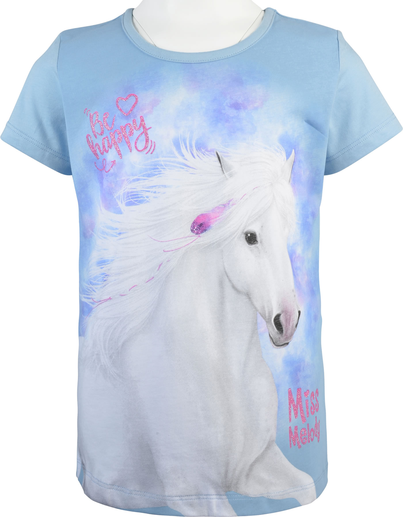 Hübsches T-Shirt in rosa von MISS MELODY mit tollem Pferde-Motiv auf der Vorderseite. Zusätzlich ist der Schriftzug „Miss Melody“ glitzernd gestaltet.