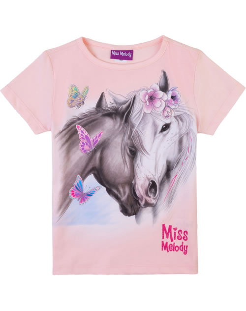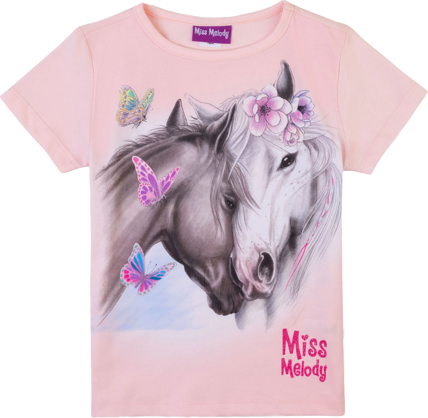 Hübsches T-Shirt in rosa von MISS MELODY mit tollem Pferde-Motiv auf der Vorderseite. Zusätzlich ist der Schriftzug „Miss Melody“ glitzernd gestaltet.