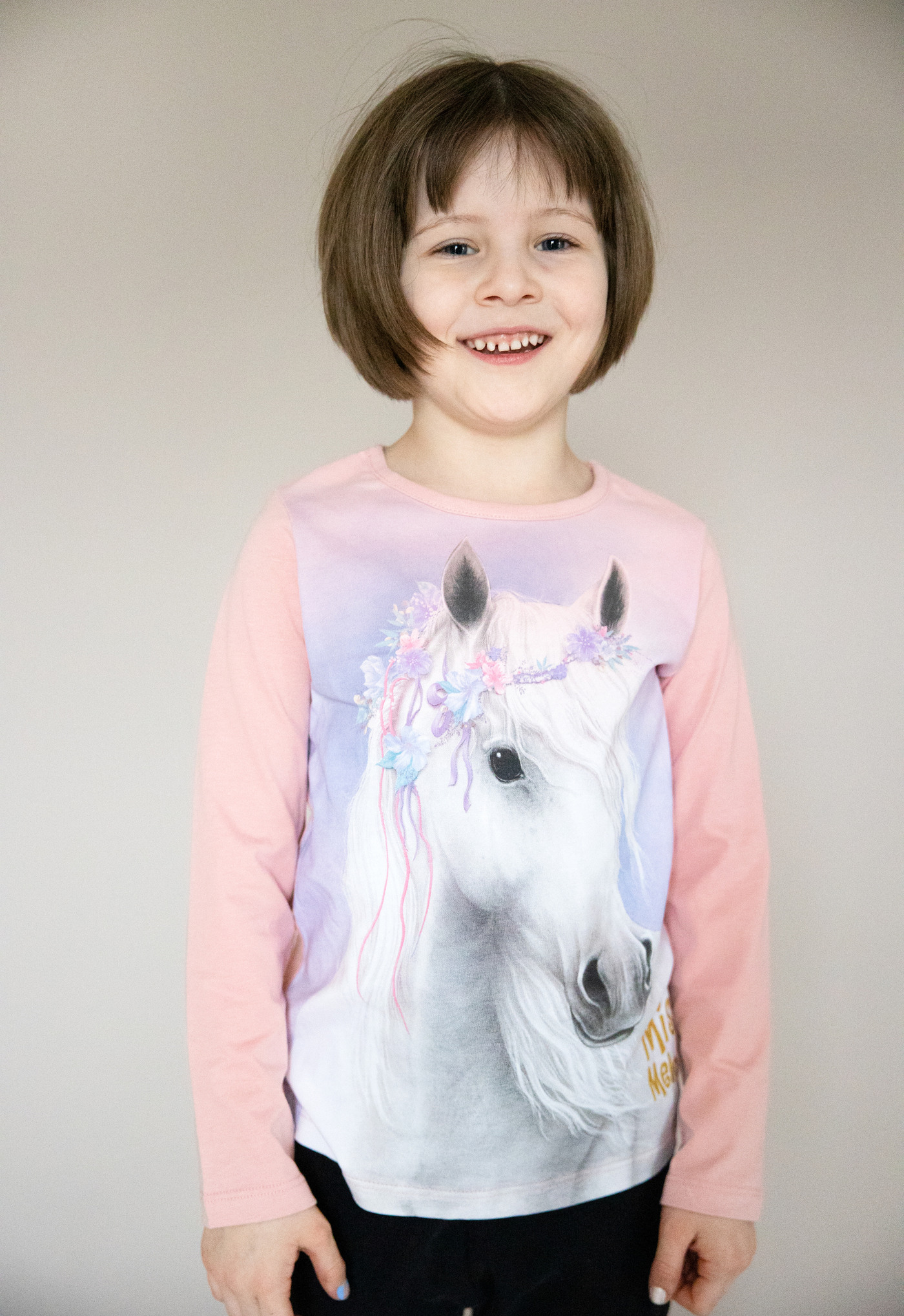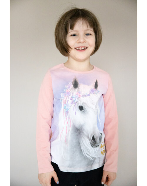 Auf diesem Langarmshirt ist ein hübsches Motiv von einem Pferd mit Blumenkranz gedruckt.