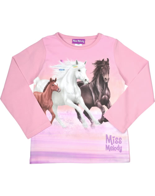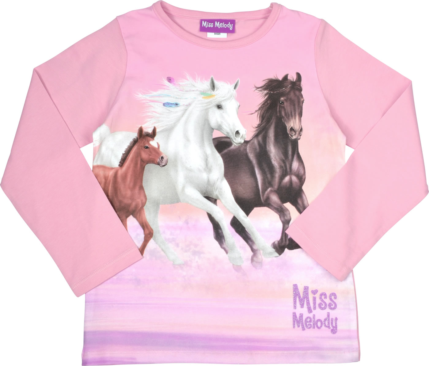 Hübsches T-Shirt mit langen Ärmeln in rosa von MISS MELODY mit tollem Pferde-Motiv auf der Vorderseite. Ein weiteres schönes Detail ist der glitzernde Miss Melody Schriftzug. Das angenehme Material bietet einen hohen Tragekomfort.