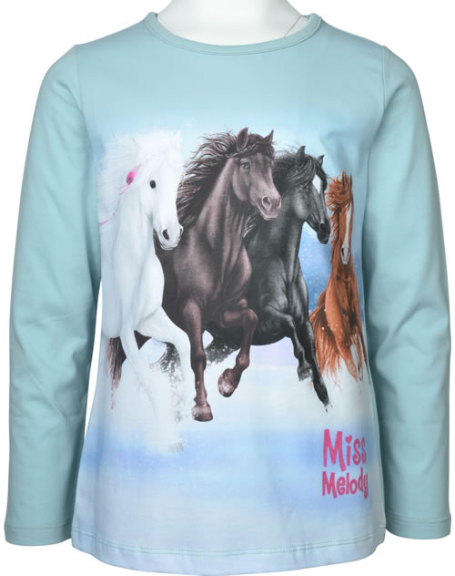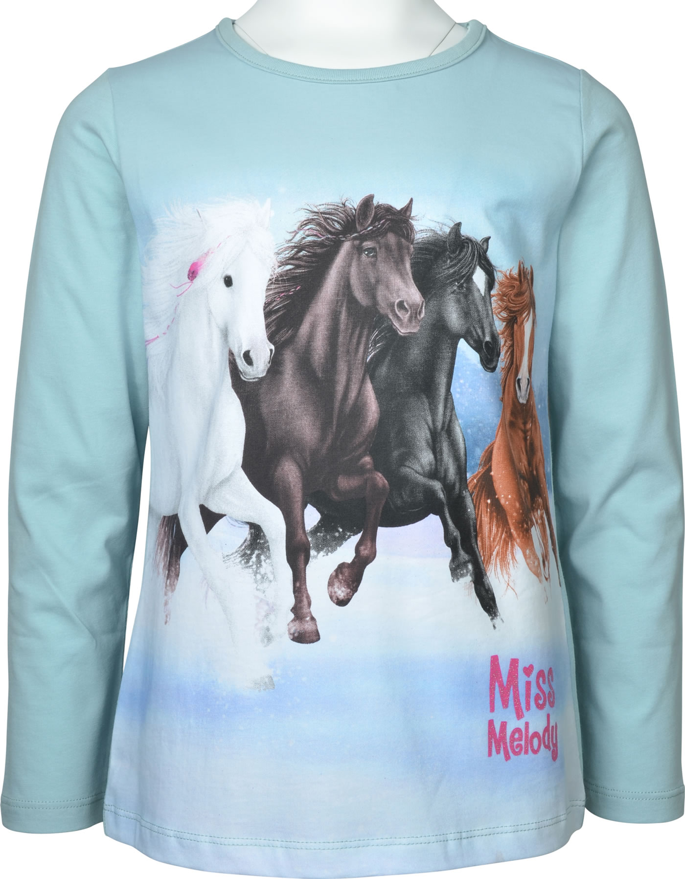 Hübsches Langarm T-Shirt in hellblau von MISS MELODY mit spektakulärem Pferdemotiv auf der Vorderseite.