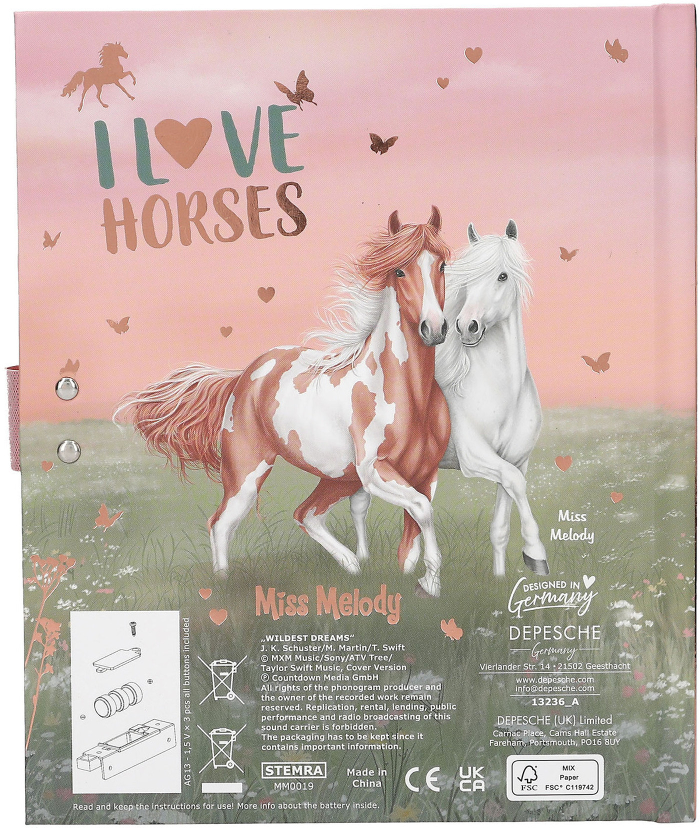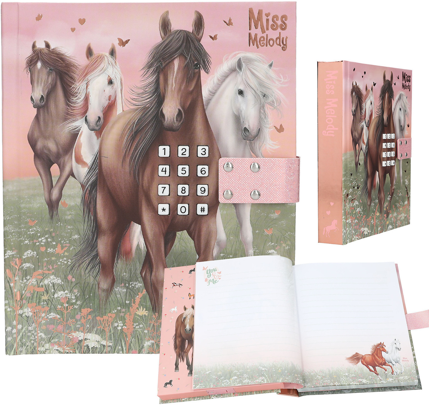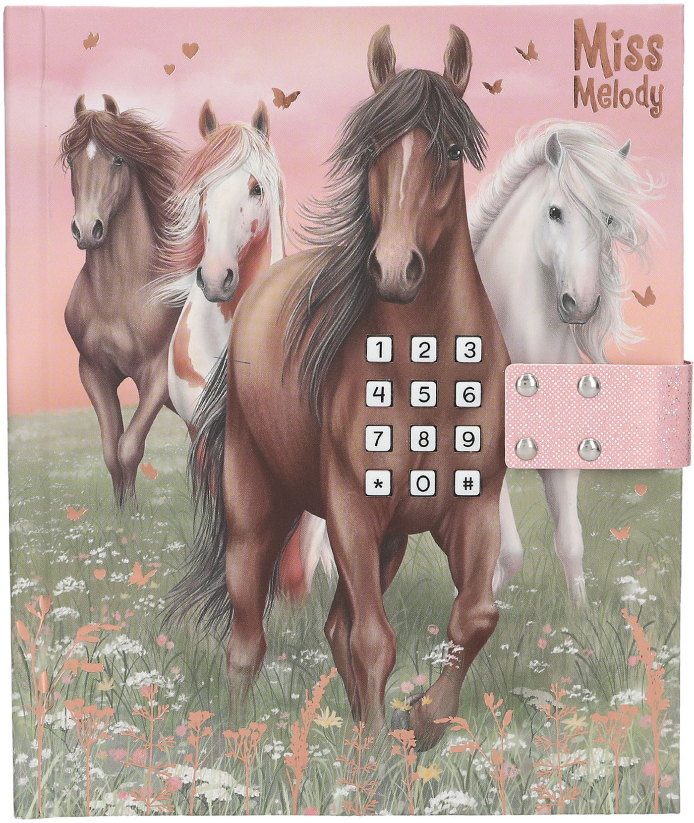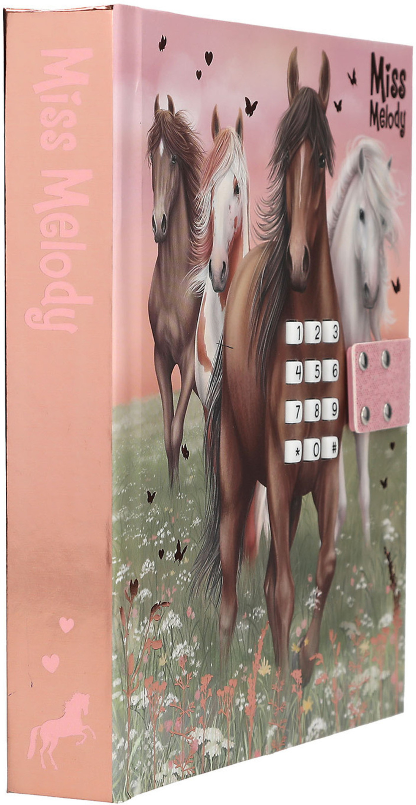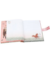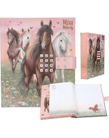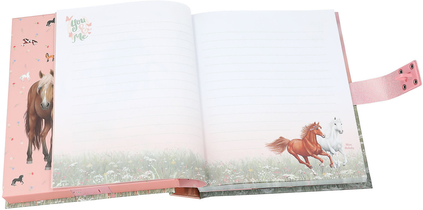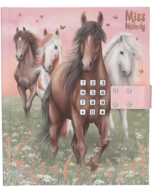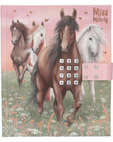 Für geheime Gedanken und Träume: Das Tagebuch in sanften Rosé- und Grüntönen hat ein traumhaftes Cover mit vier Pferden, die über eine Blumenwiese galoppieren. Das Schloss öffnet sich nur, wenn der richtige vierstellige Code (persönlich einstellbar und änderbar) eingegeben wird. Dann spielt auch der Top-Hit ""Wildest Dreams"" von Taylor Swift für ca. 20 Sekunden. Innen hat das Tagebuch 80 passend zum Cover illustrierte, fein linierte Seiten. Von Miss Melody.