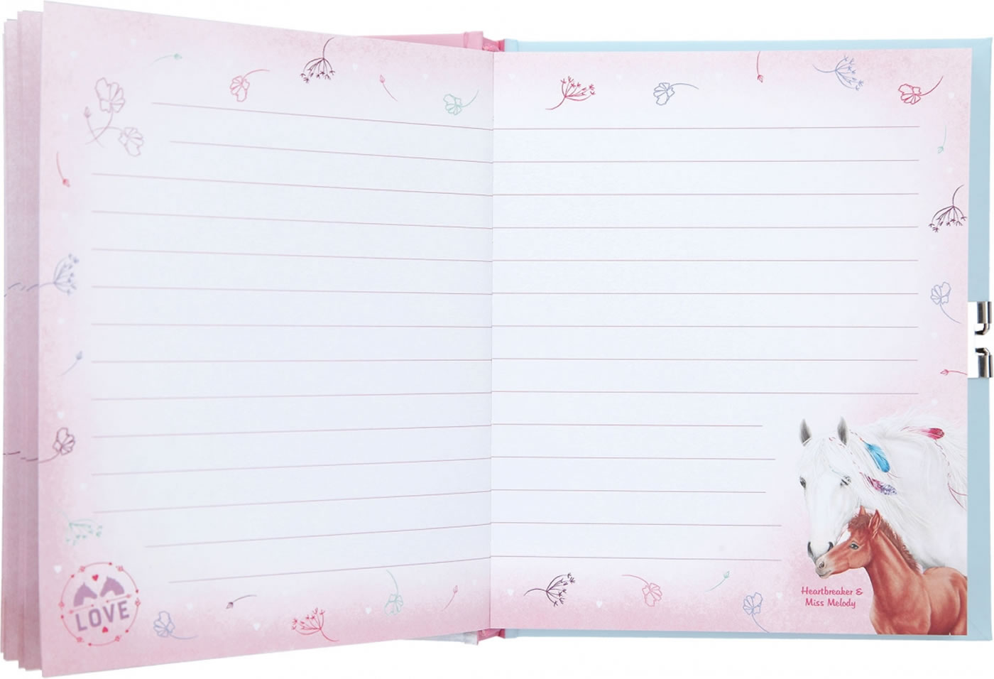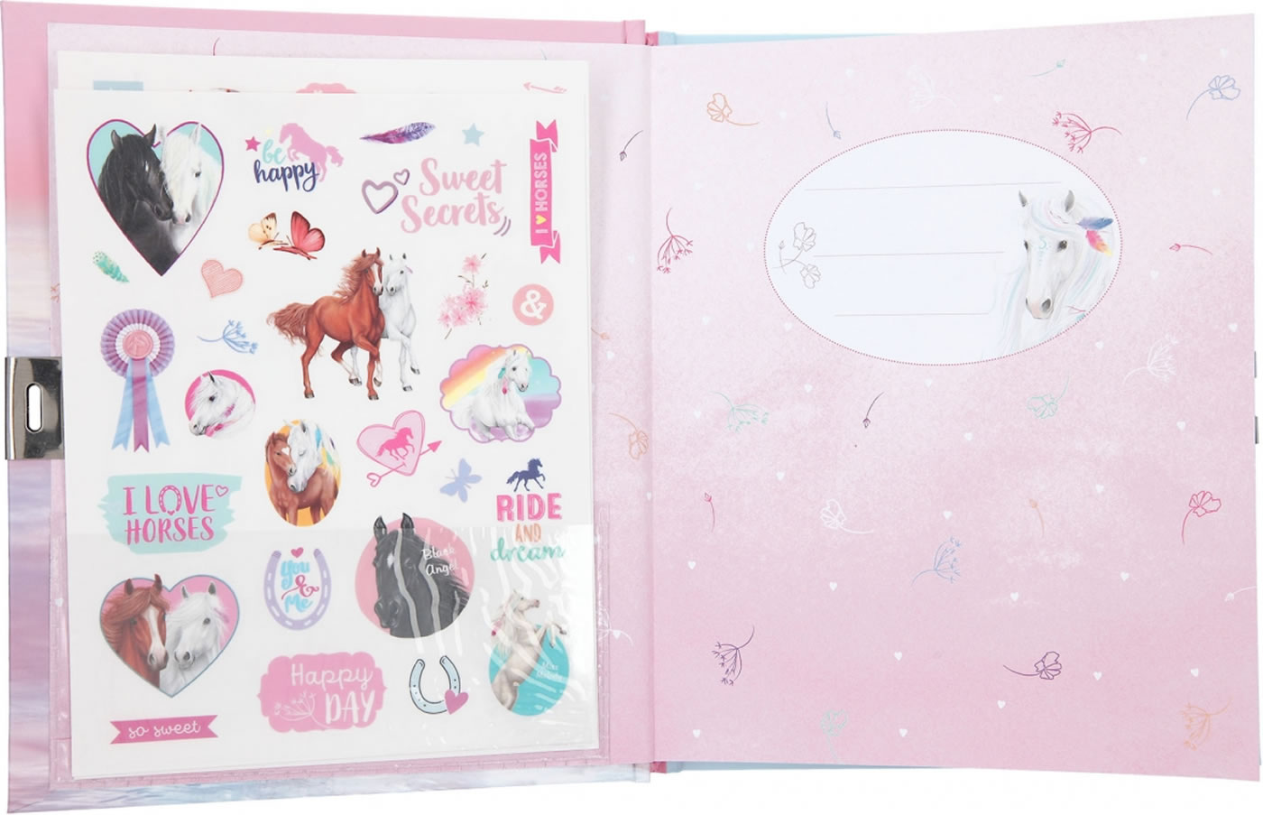Im Tagebuch findest du zwei Bögen mit Pferdestickern, mit denen du die 192 linierten Seiten wunderschön dekorieren kannst.