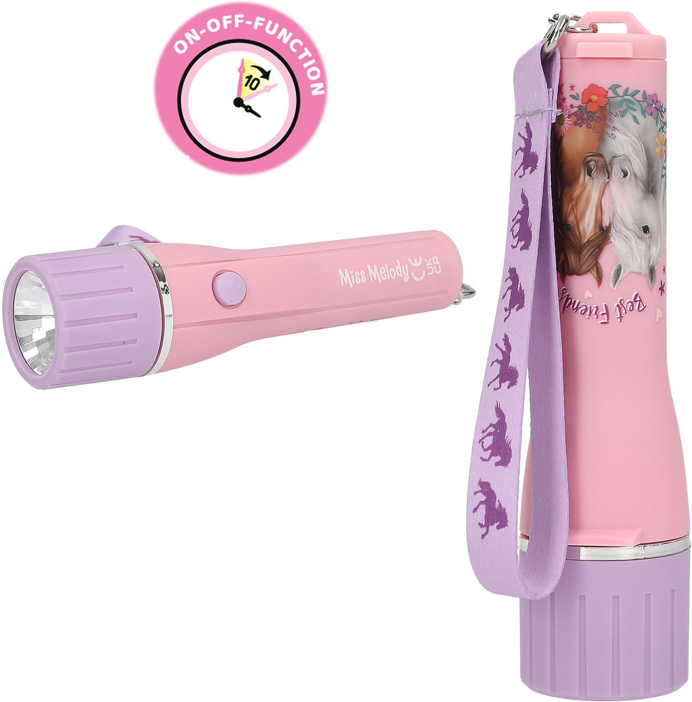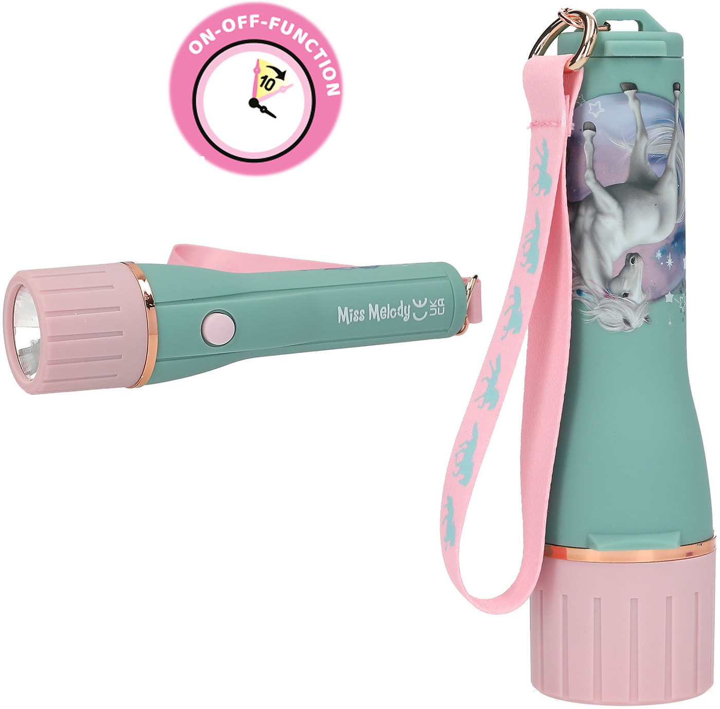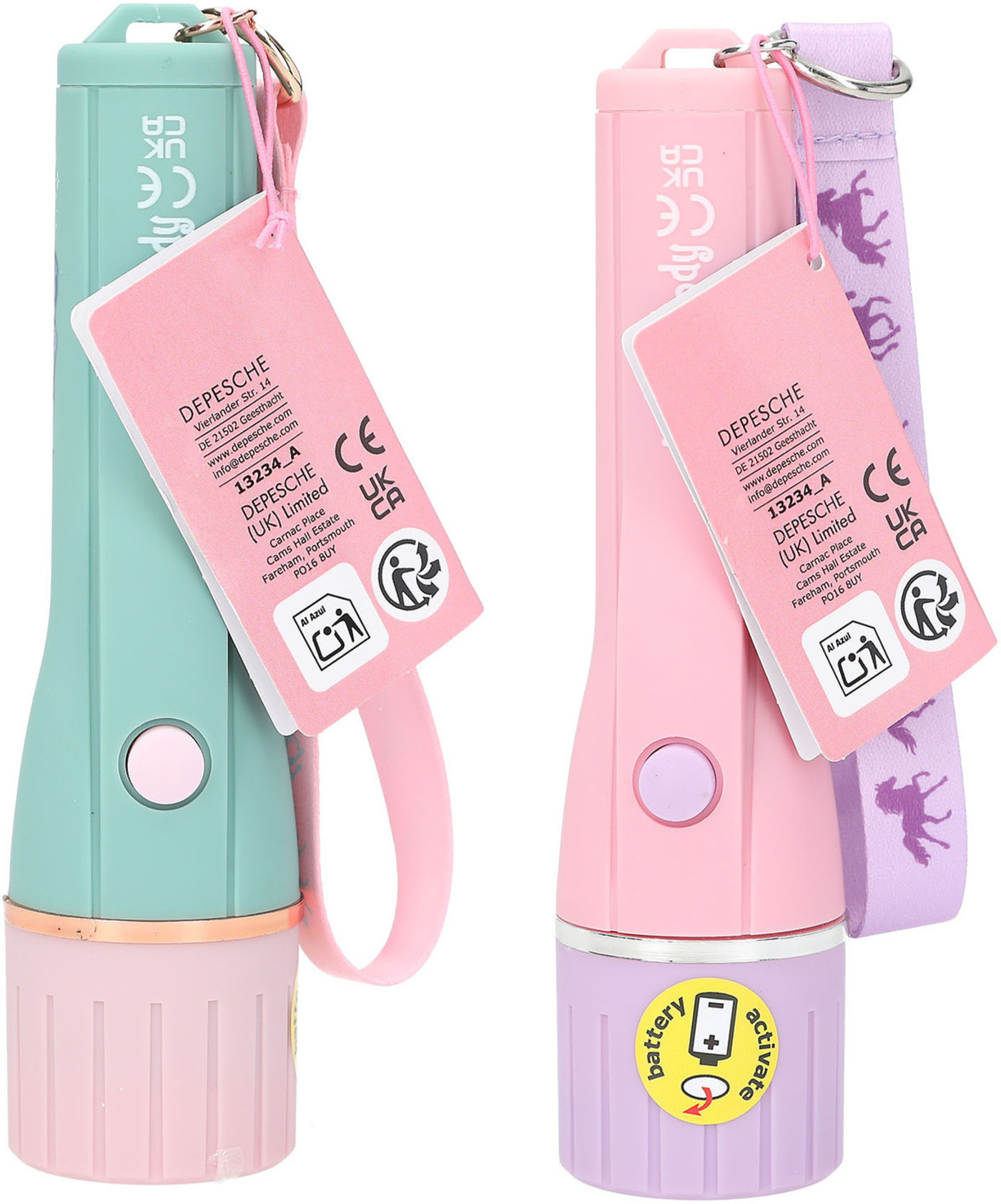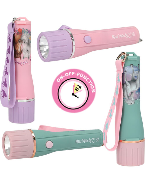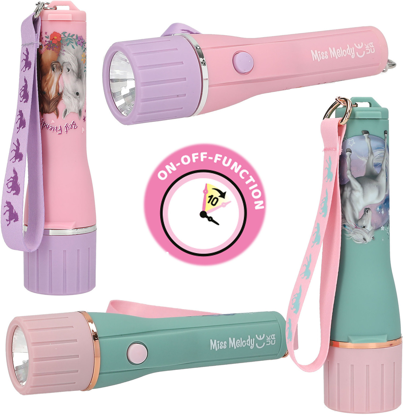 Spot an für Miss Melody: Die Taschenlampen in Mint-Rosa und Rosa-Lila mit mattem Finish, metallischen Details, traumhaften Pferde-Motiven und bedruckten Handschlaufen haben eine praktische Switch-off-Funktion (Taschenlampe stellt sich nach 10 Minuten automatisch aus).