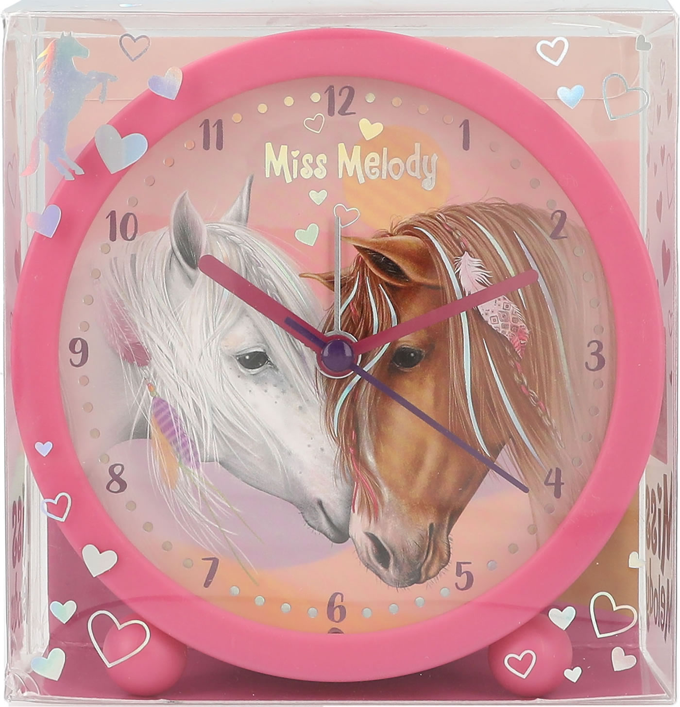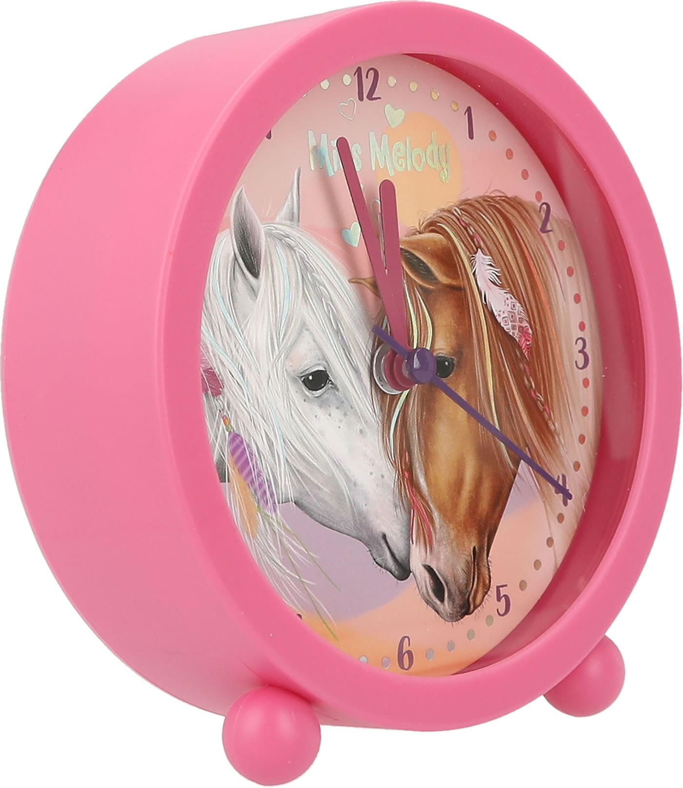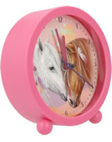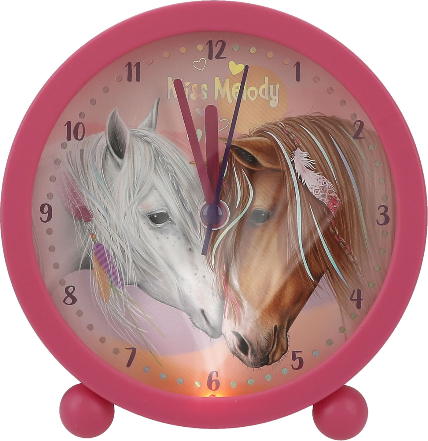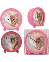 Zeit für Miss Melody: Der hübsche Wecker mit pinkem Gehäuse hat ein traumhaft schönes Ziffernblatt mit zwei Pferden vor roséfarbenem Hintergrund. Er verfügt über eine Lichtfunktion auf Knopfdruck sowie geräuschlose Zeiger.