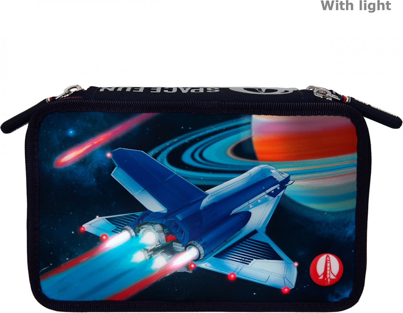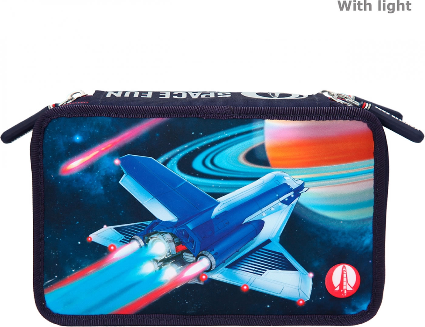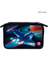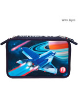 Jede Menge Platz ist in den unendlichen Weiten dieser 3-Fach-Federtasche von Monster Cars mit Spaceshuttle-Motiv. Auf Knopfdruck leuchten Teile des Kometen und Spaceshuttle für ca. 30 Sekunden auf.