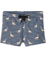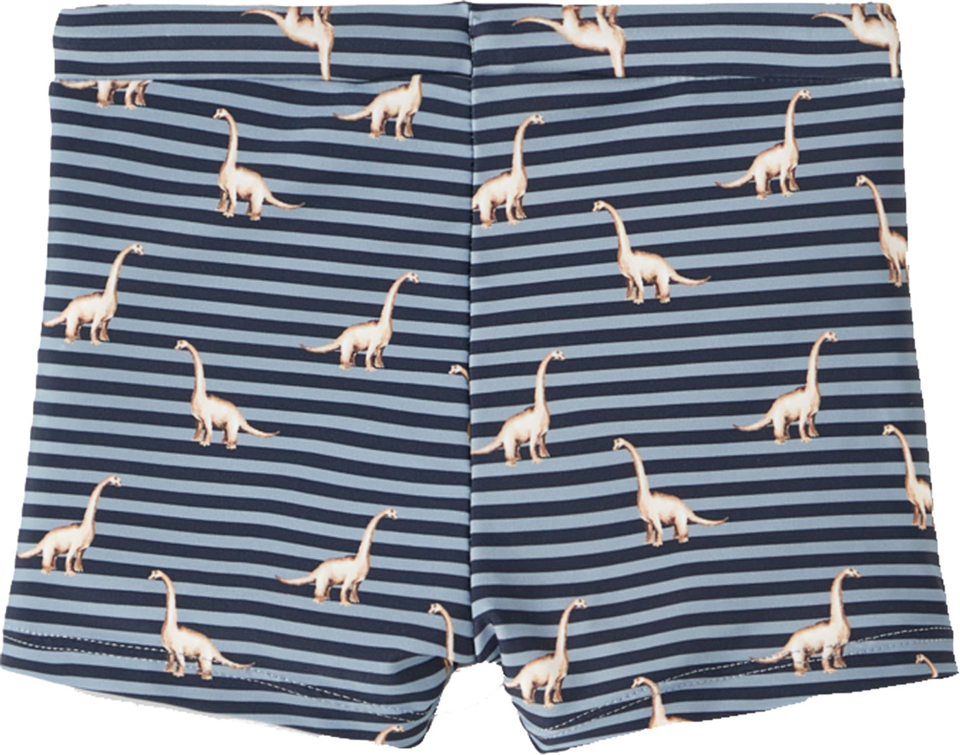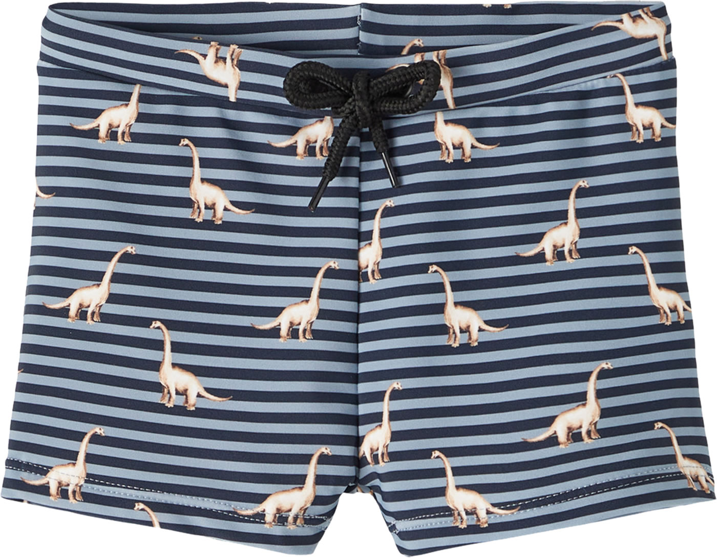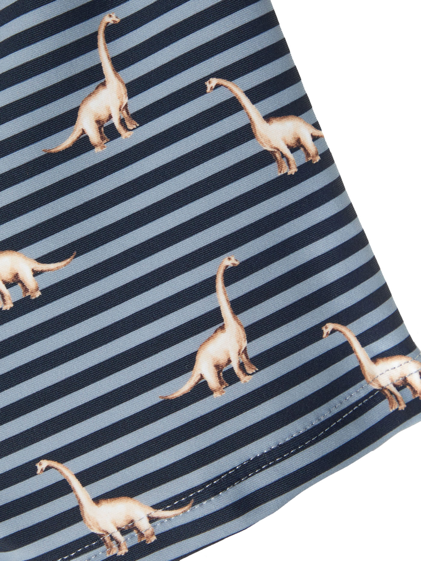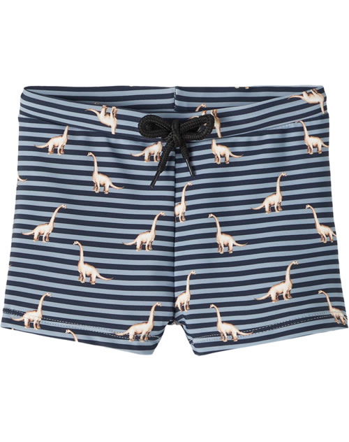 Coole Badeshose für Jungen von NAME IT. Die Weite läßt sich mit einer Kordel im Hosenbund regulieren. Die gestreifte Badehose mit dem tollen Dinomuster ist ein echter Hingucker.