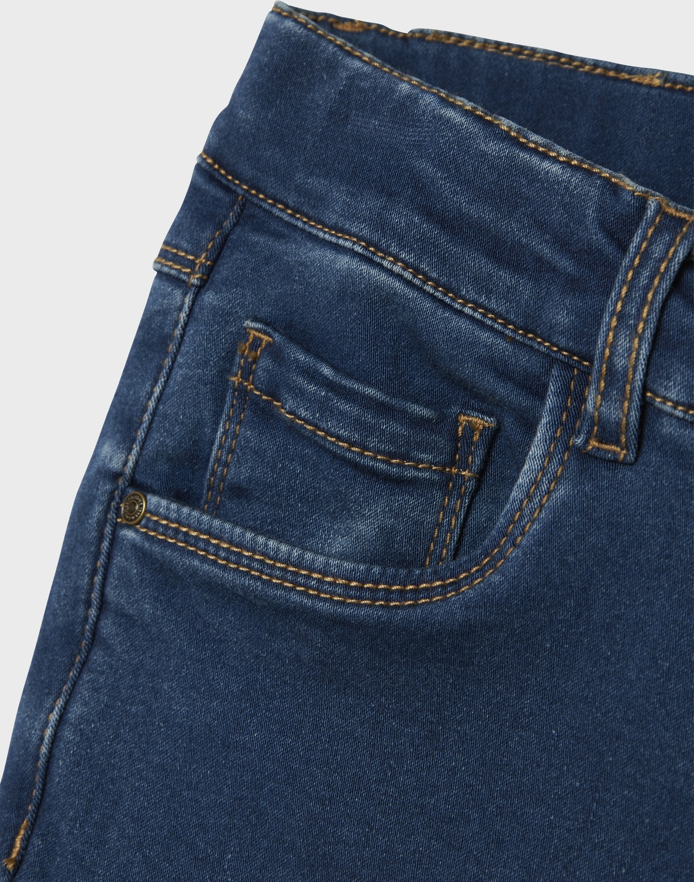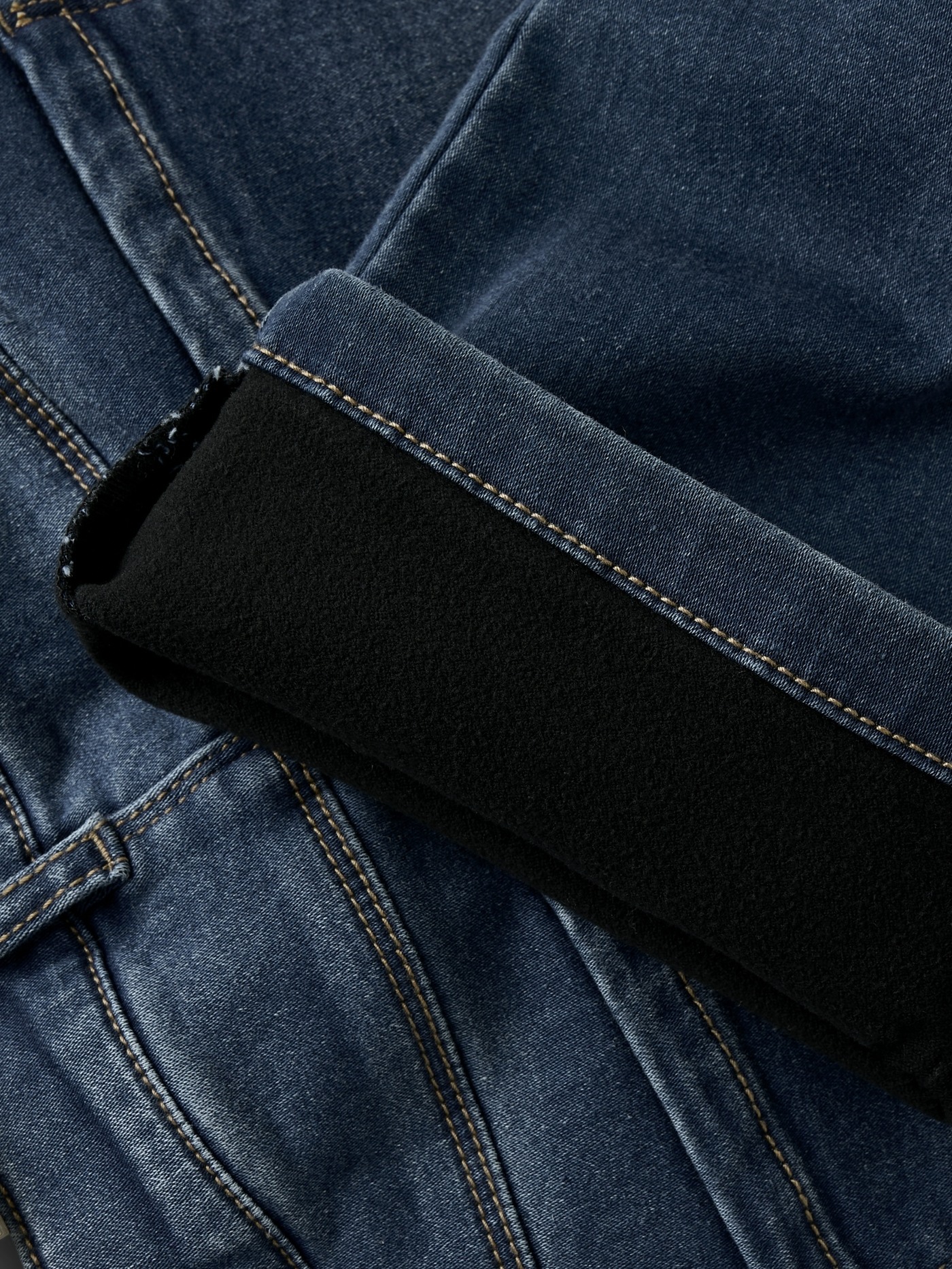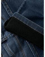 Die Jeans hat hellbraune Nähte und einen flexiblen Bund. 🙂