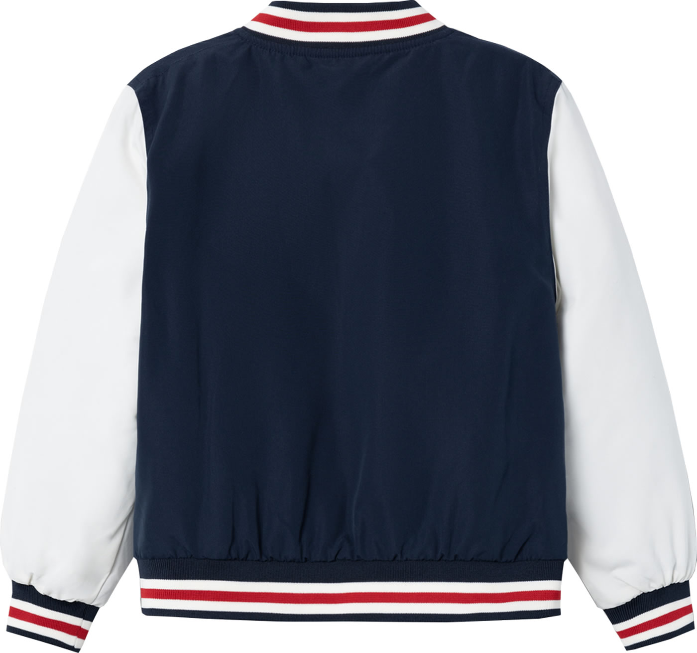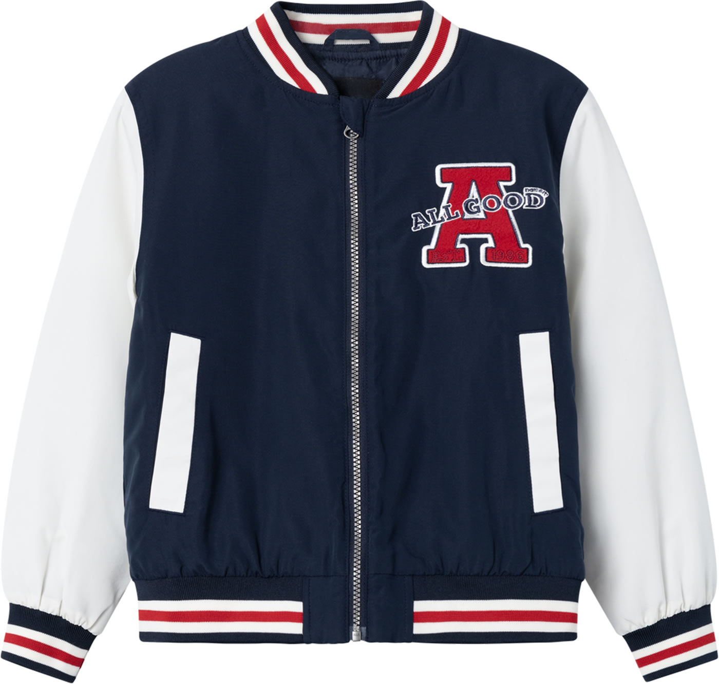 Tolle modische College-Jacke im Bomber-Look von NAME IT für Jungen und Mädchen. Mit den breiten Rippenbündchen am Halsausschnitt, den Ärmeln und am Saum sitzt sie optimal. Geschlossen wird sie mit einem Reißverschluss der einen Kinnschutz hat. Zwei Einschubtaschen bieten Platz für Kleinigkeiten. Weitere hübsche Details ist die Applikation auf der Brust. Die Jacke ist mit einem warmen Steppfutter versehen und somit auch für kühle Tage geeignet.