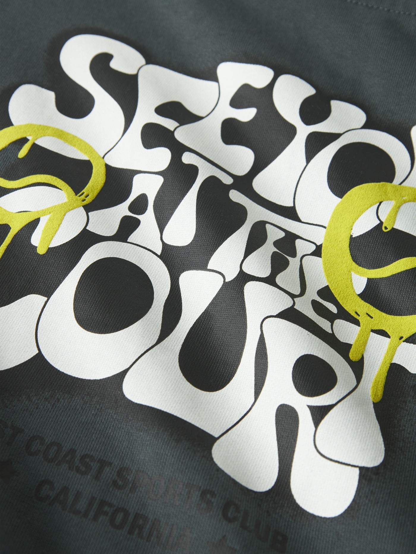 Sowohl auf der Rückseite als auch in kleinerem Format auf der Vorderseite befinden sich coole Prints im Graffiti-Style. 😎