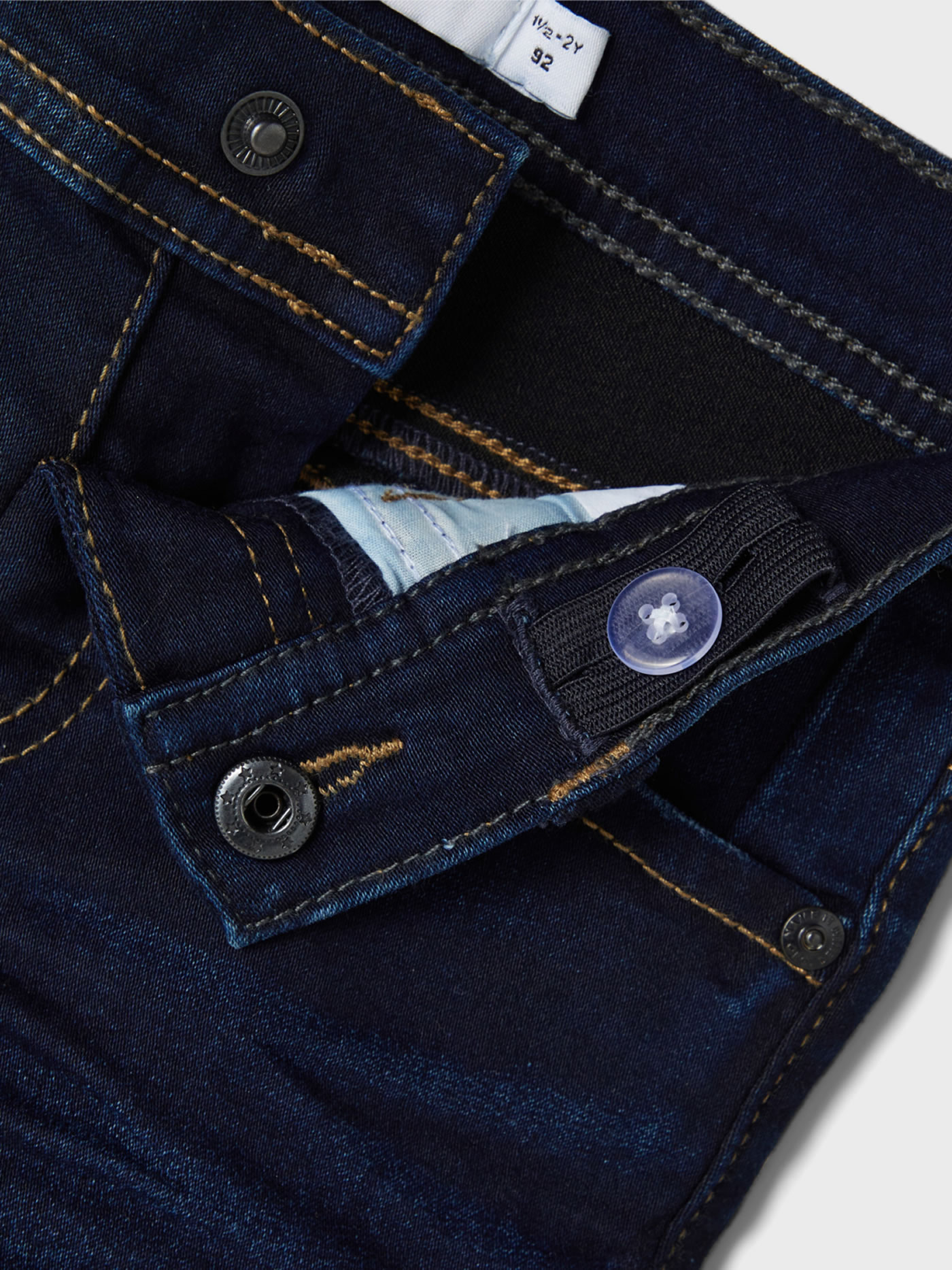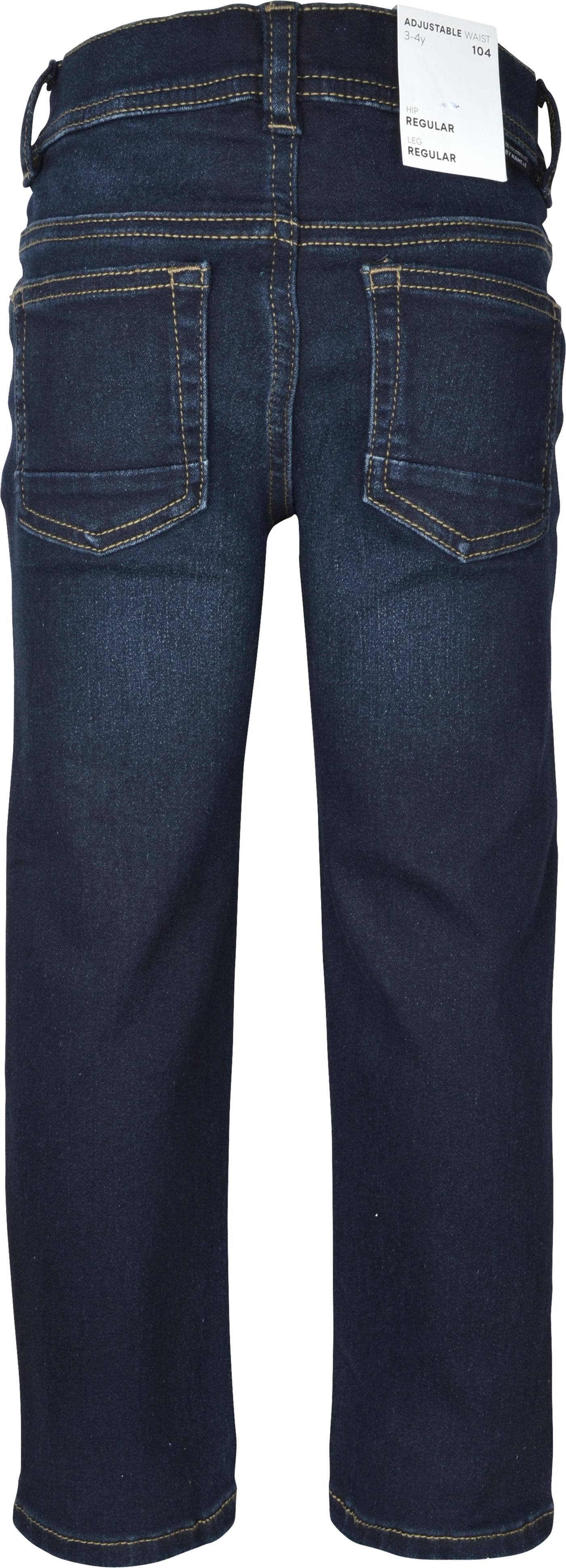 Gerade geschnittene Jeans-Hose in dark blue denim für Jungen von NAME IT. Auf der Vorder- sowie auf der Rückseite befinden sich Taschen. Details wie Waschungen und Falten machen diese Hose zu einem Lieblingsstück, das sich wunderbar kombinieren lässt. Mit einem Gummibund mit Knöpfen auf der Bundinnenseite lässt sich die Hose in der Weite verstellen.