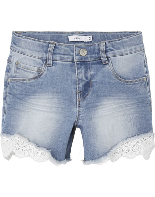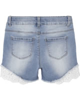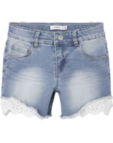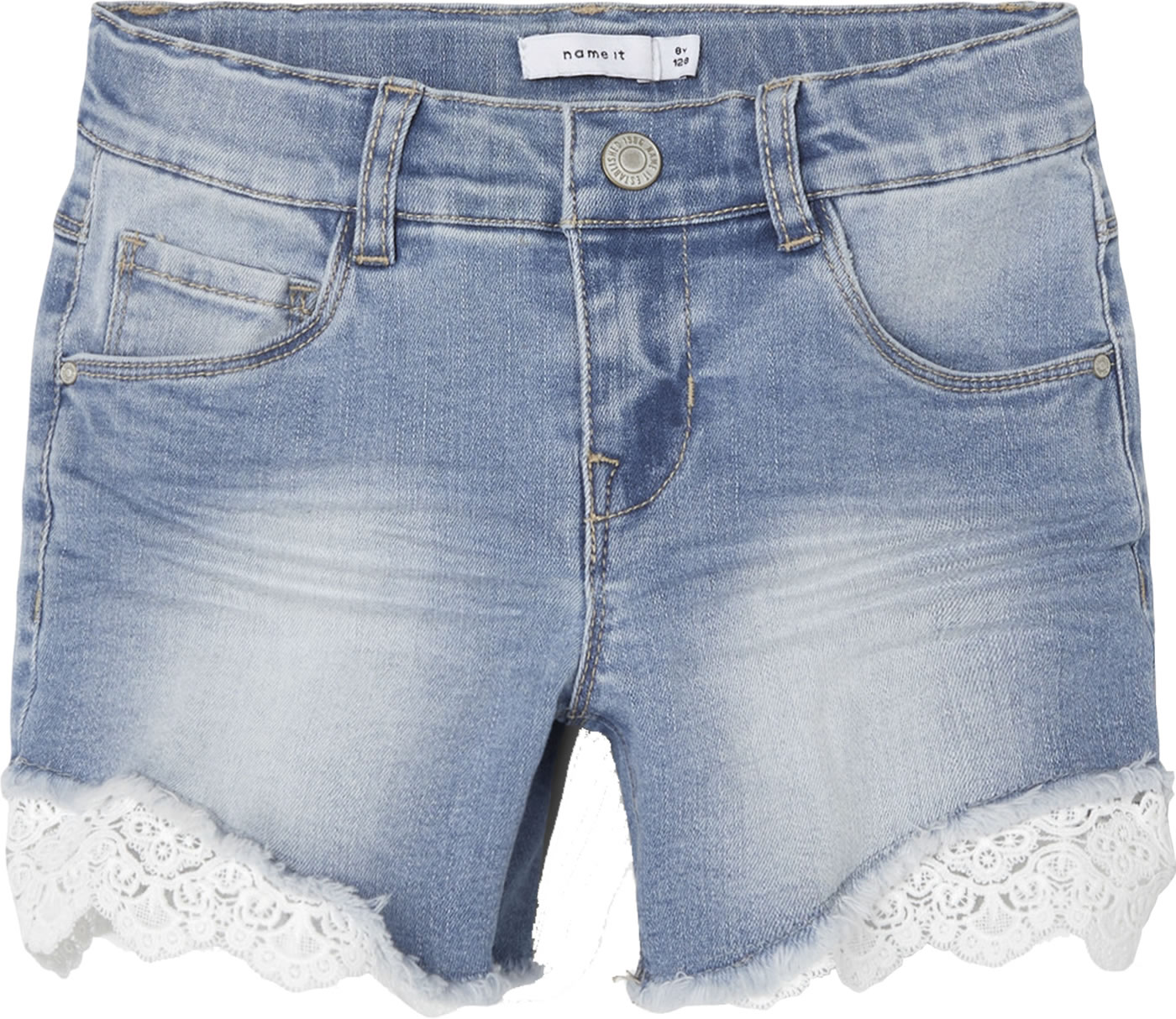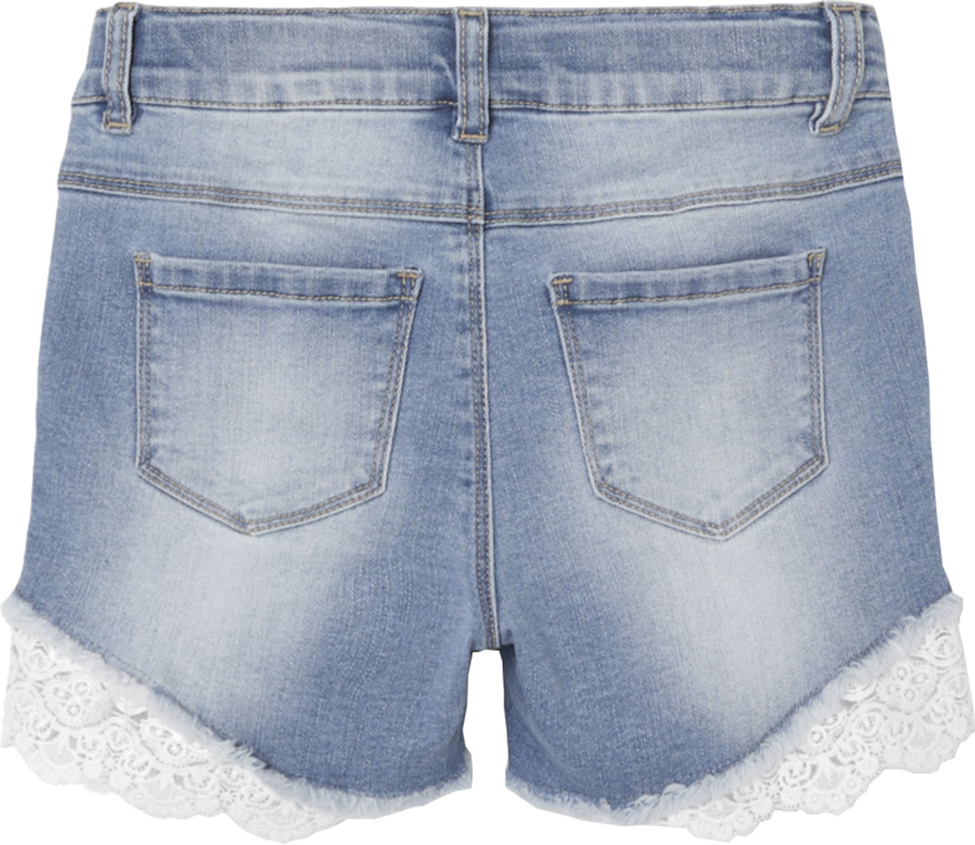 Jeans-Shorts für Mädchen von NAME IT. Die Shorts hat einen Hakenverschluss und die Weite ist in der Taille verstellbar. Die Shorts ist im Five Pocket Stil und besondere Details sind die ausgefransten Säume und die eingearbeitete Spitze an den Beinen.