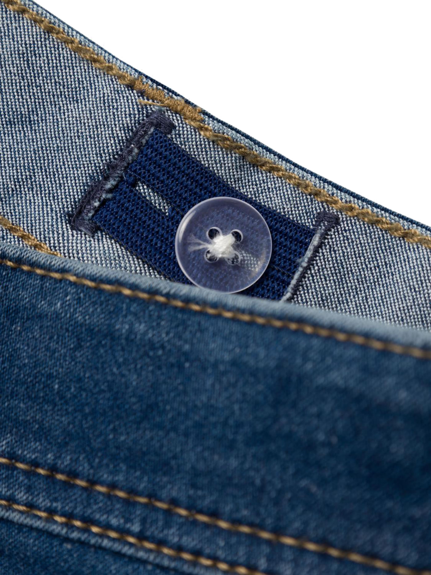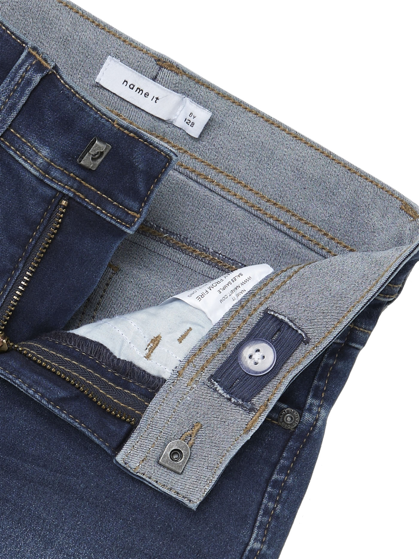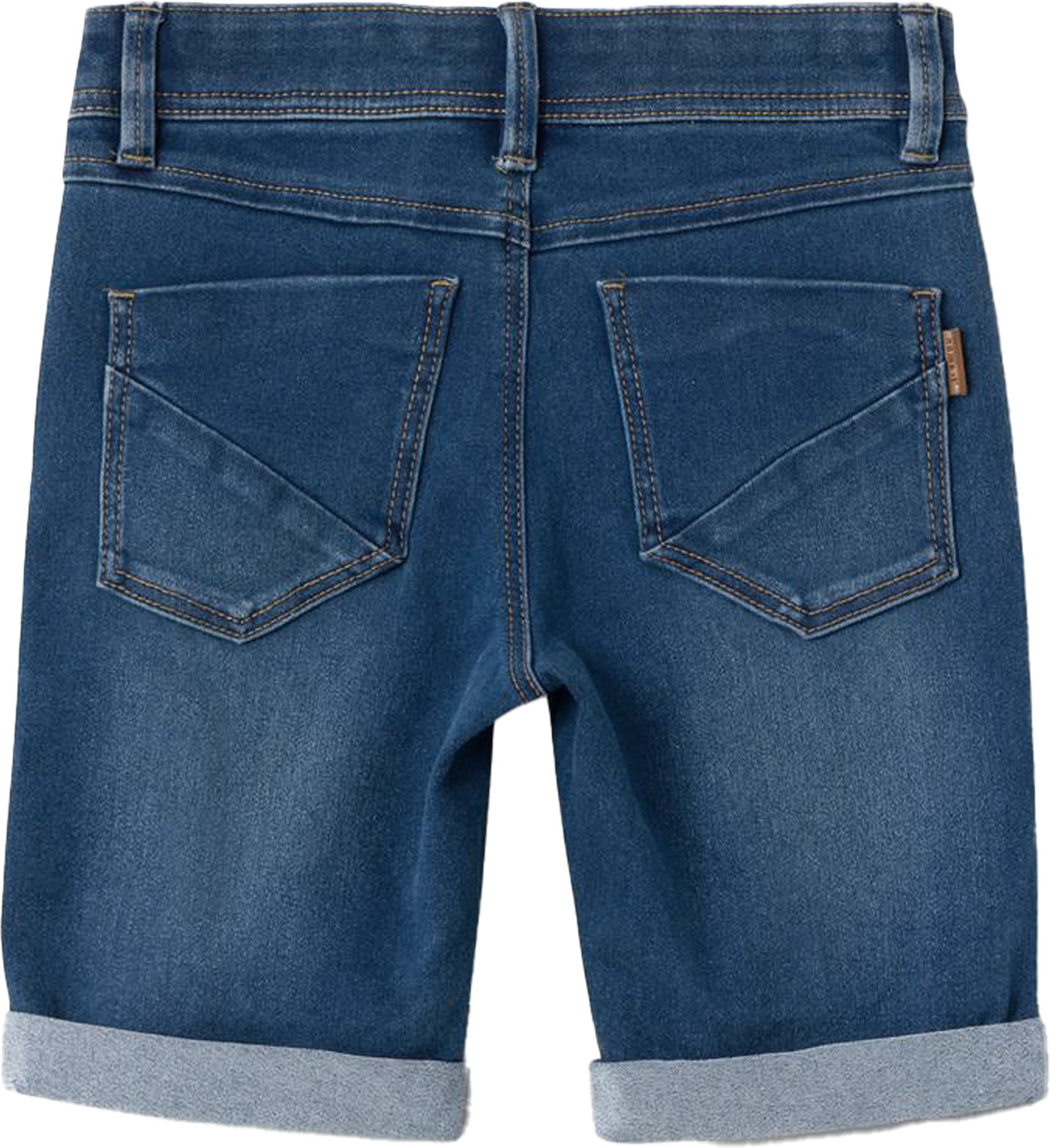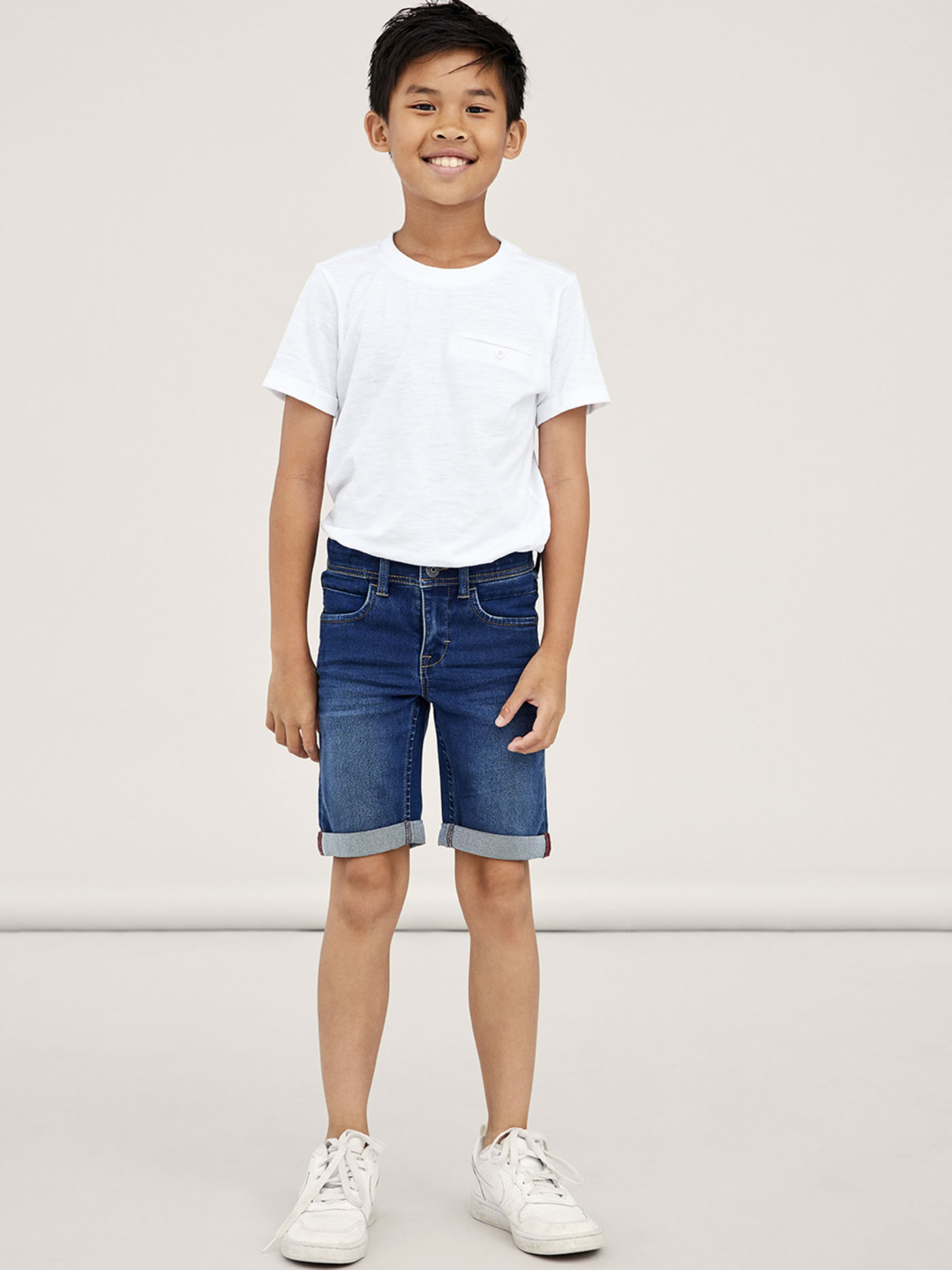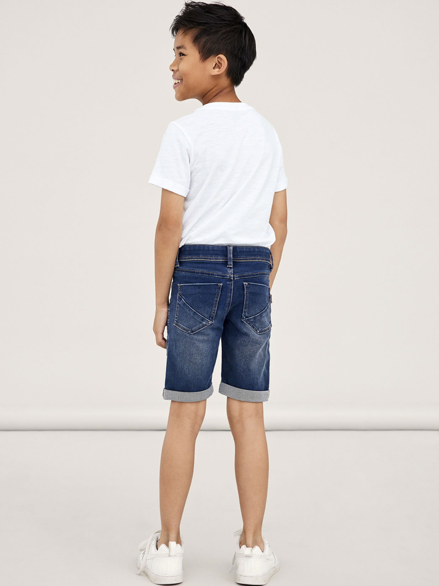 Blaue Jeans-Shorts NKMSILAS von NAME IT für Jungen. Die Hose hat fünf Taschen. Modische Falten und tief sitzende Po-Taschen sind zusätzliche Hingucker. Die Hosenbeine sind lässig umgeschlagen. Die Jeanshose ist dank des Stretch-Anteils klasse dehnbar. Bündchen mit Druckknopfverschluss. Ein innen verstellbarer Hosenbund bietet optimalen Sitz.