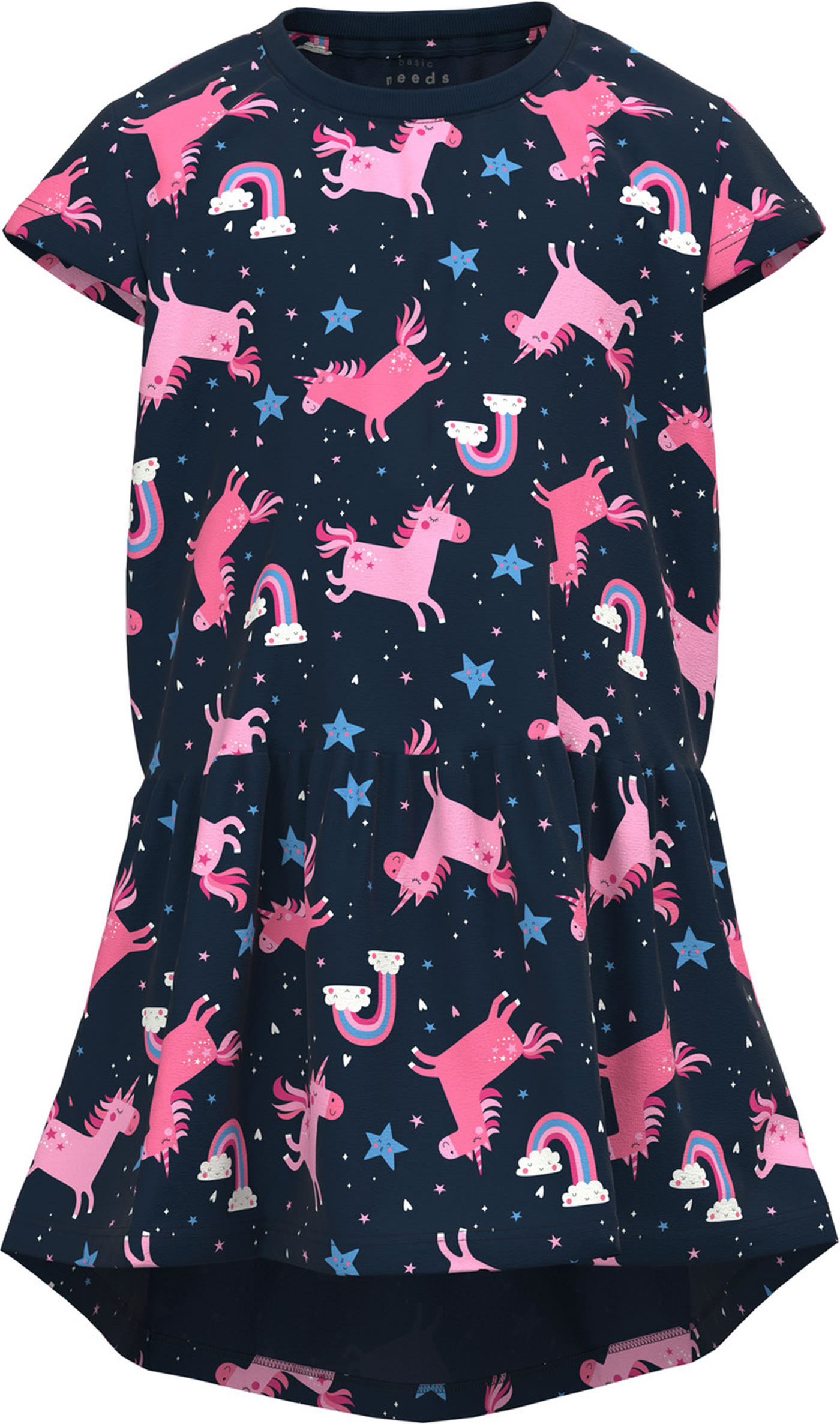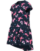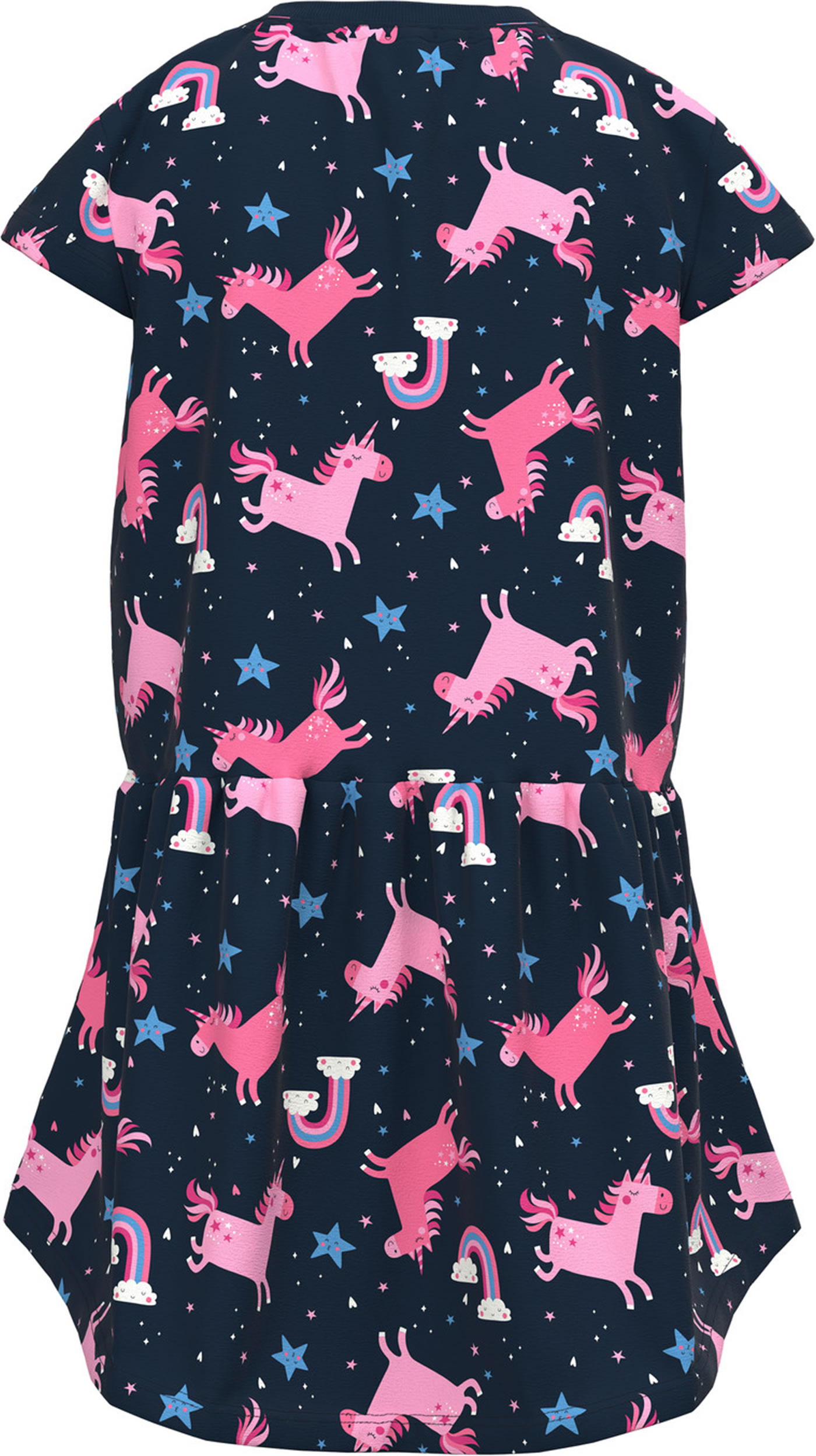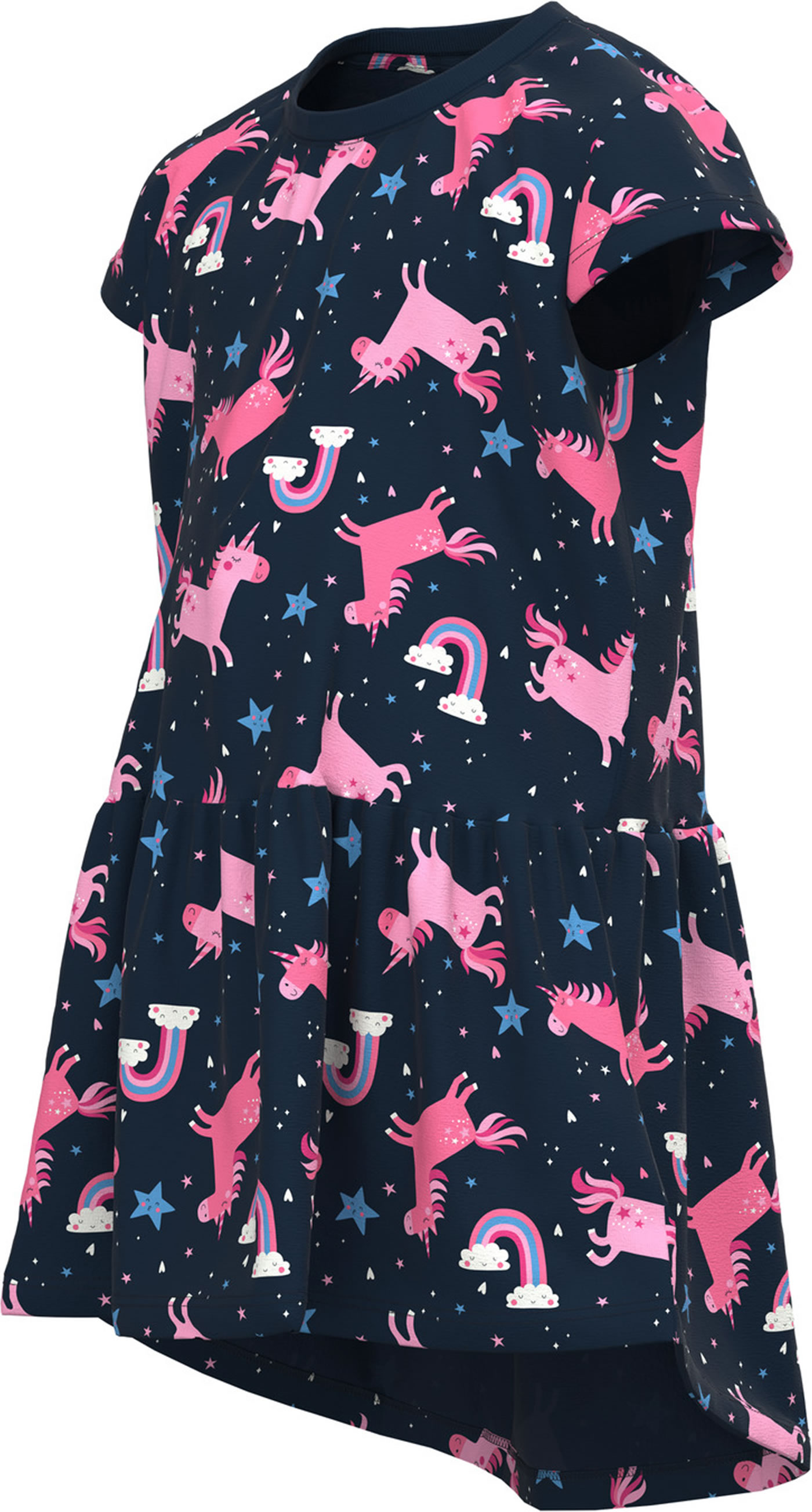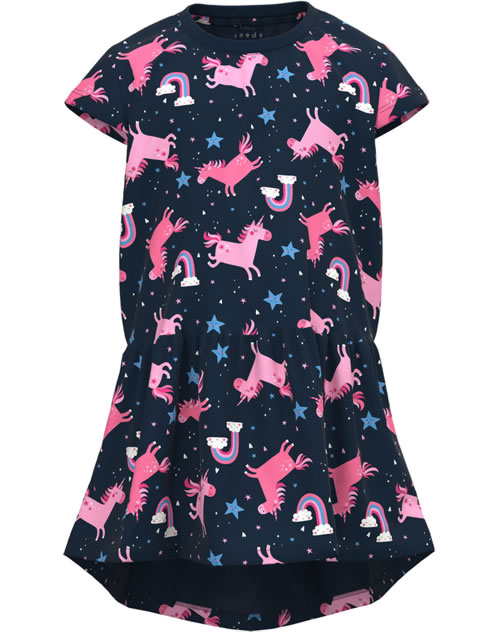 Tolles Sommerkleid mit kurzen Ärmeln von NAME IT. Der lockere Schnitt des Kleides bietet viel Bewegungsfreiheit. Das Kleid aus weichem Jersey läßt sich prima mit einer Leggings kombinieren oder auch solo getragen werden. Ein toller Hingucker ist der sommerliche Einhornprint. Das Kleid ist hinten etwas länger geschnitten.