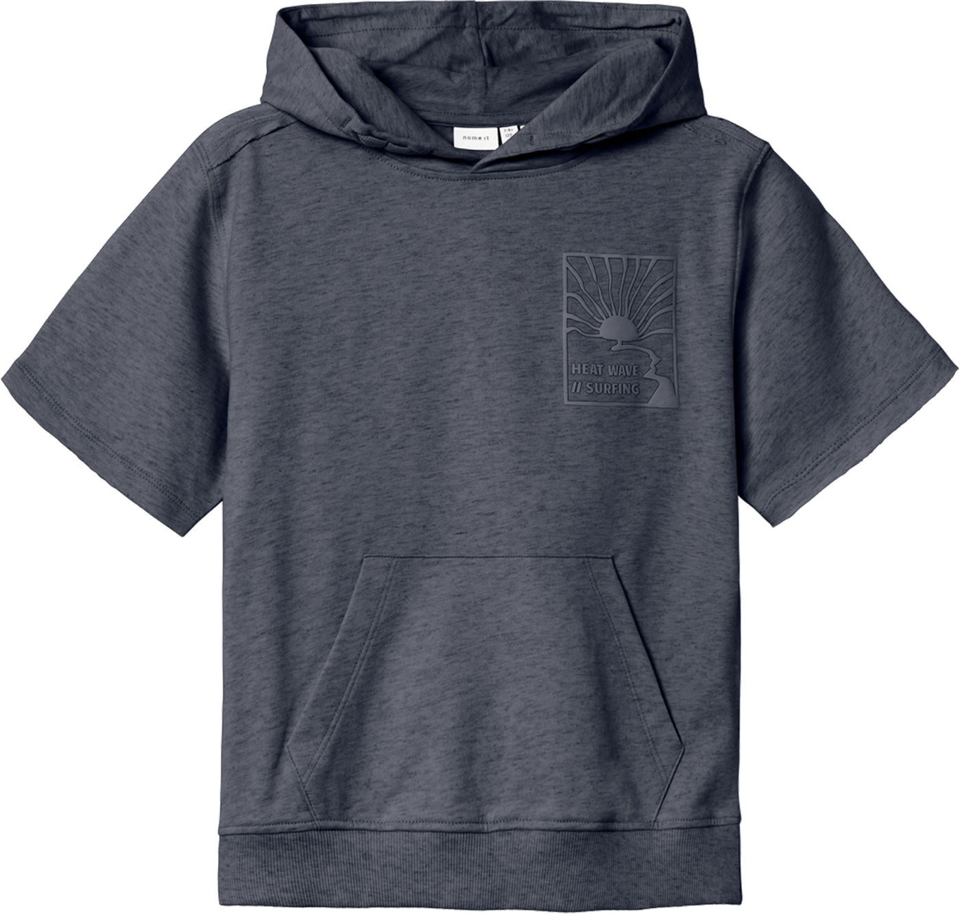 Kapuzen-Sweatshirt mit kurzen Ärmeln von NAME IT für Jungen. Die Kapuze ist doppellagig und das Sweatshirt ist von innen leicht angeraut. Auf der Vorderseite befindet sich eine Kängurutasche und ein weicher Gummiprint im 3D-Look.