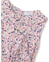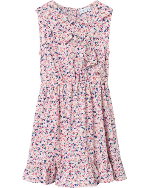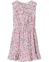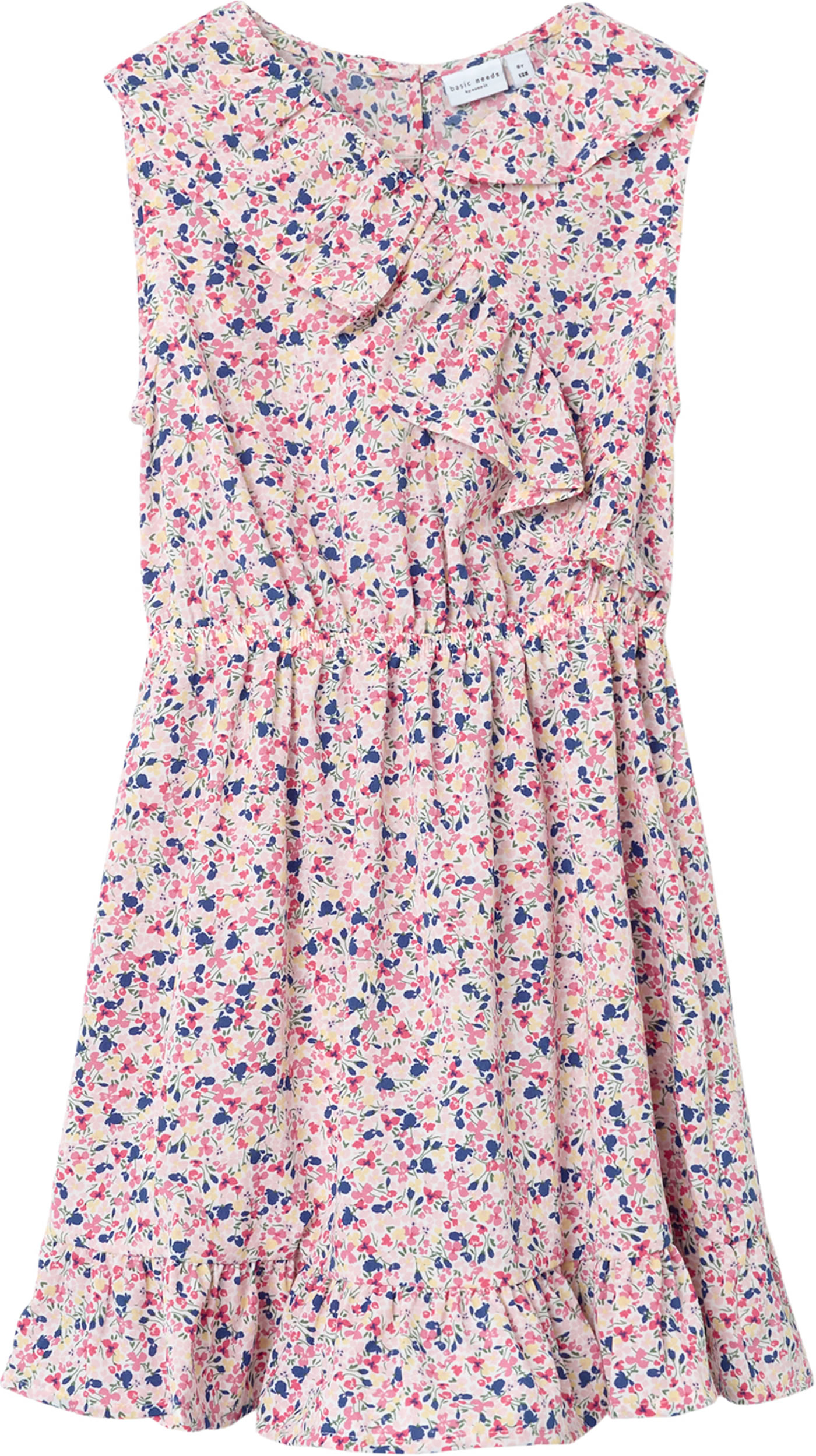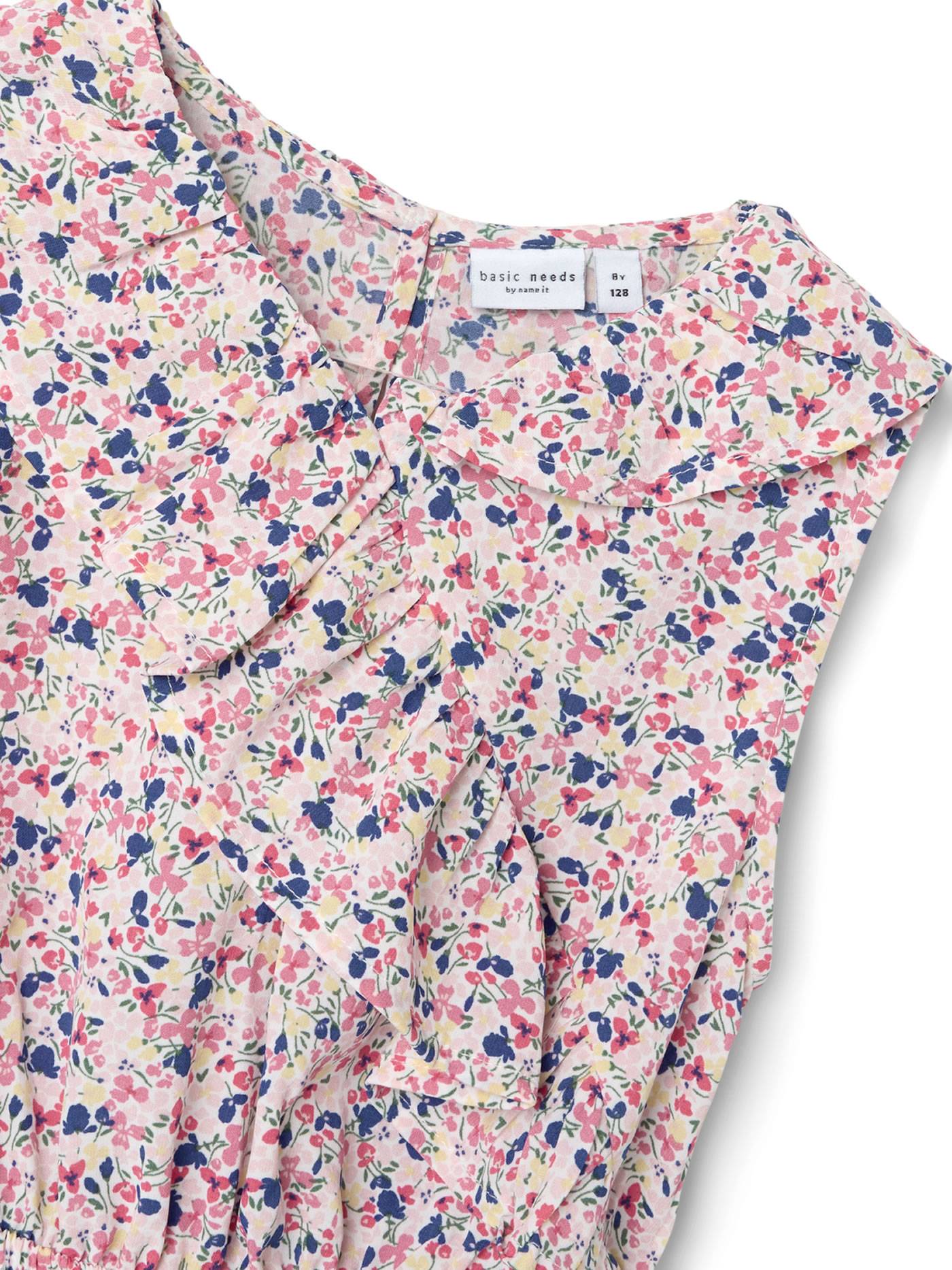 Hübsches ärmelloses Kleid von NAME IT. Der weite und luftige Schnitt ist ideal für warme Sommertage. Besonders schön ist der Allover-Print mit bunten Blumen und der Volant am Kragen und am Saumabschluss