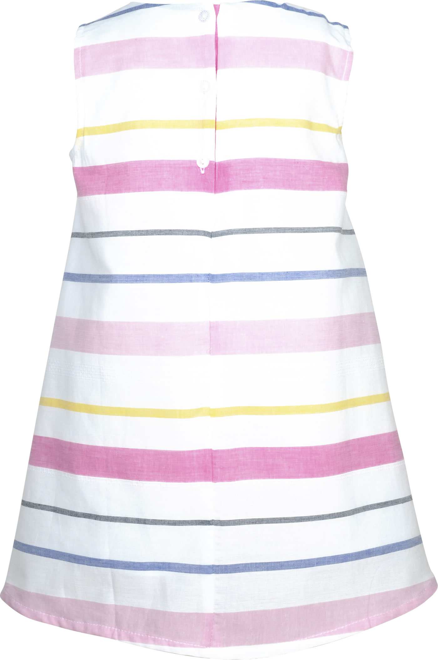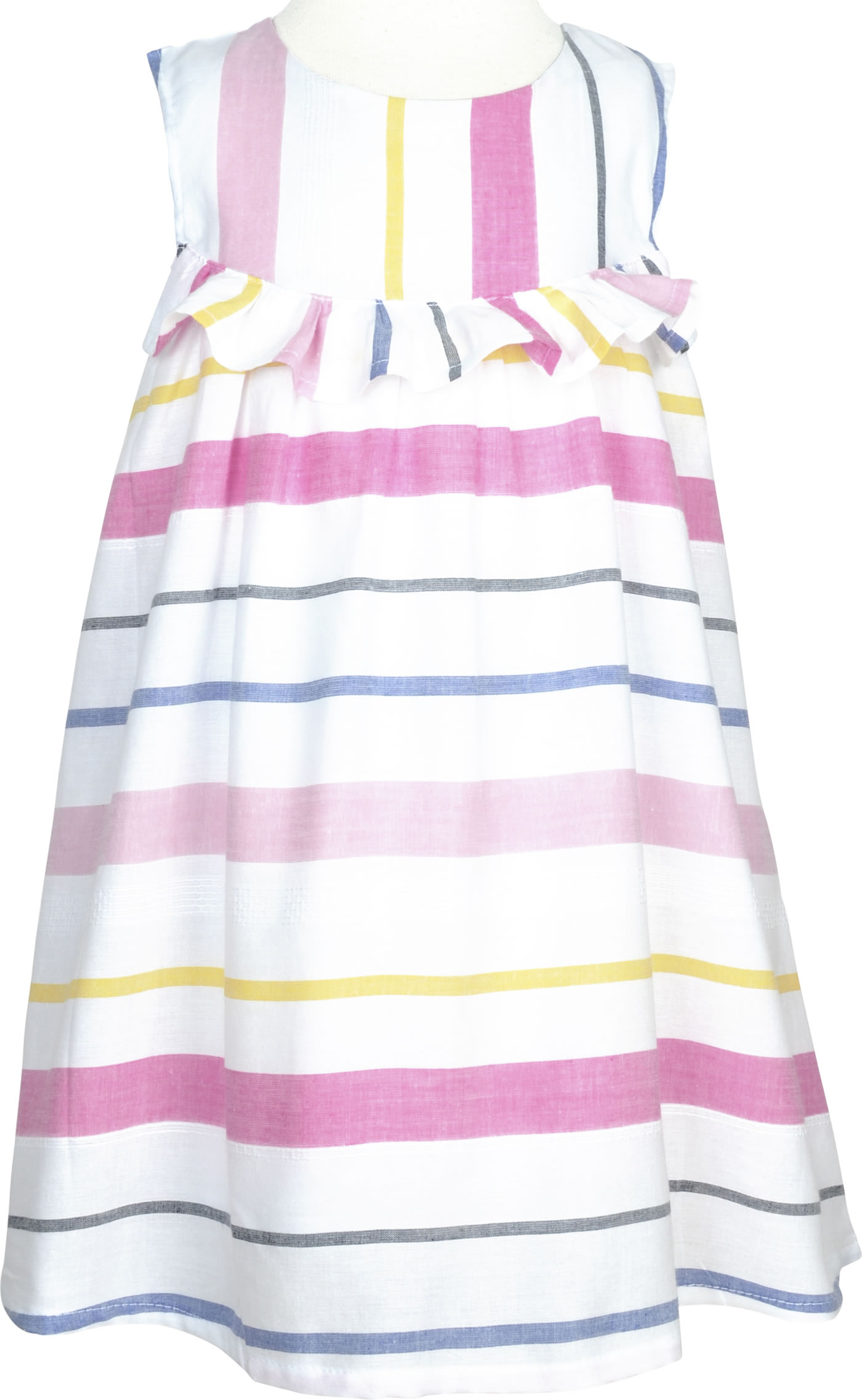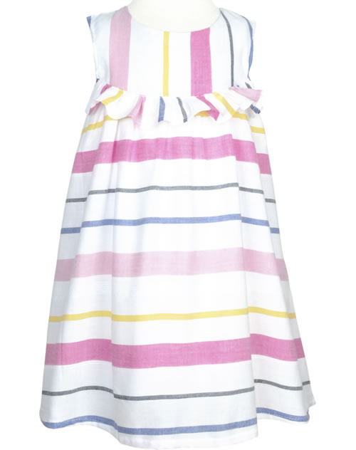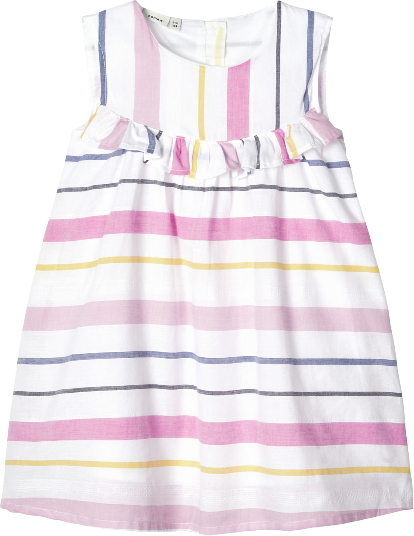 Ärmelloses Kleid von NAME IT. Der lockere Schnitt des Kleides ist ideal für den Sommer und lässt sich schön mit einer Leggings kombinieren. Das zweilagige Kleid ist gestreift und eine Rüschenkante ziert die Vorderseite. Verschlossen wird das Kleid mit einer Knopfleiste auf dem Rücken.