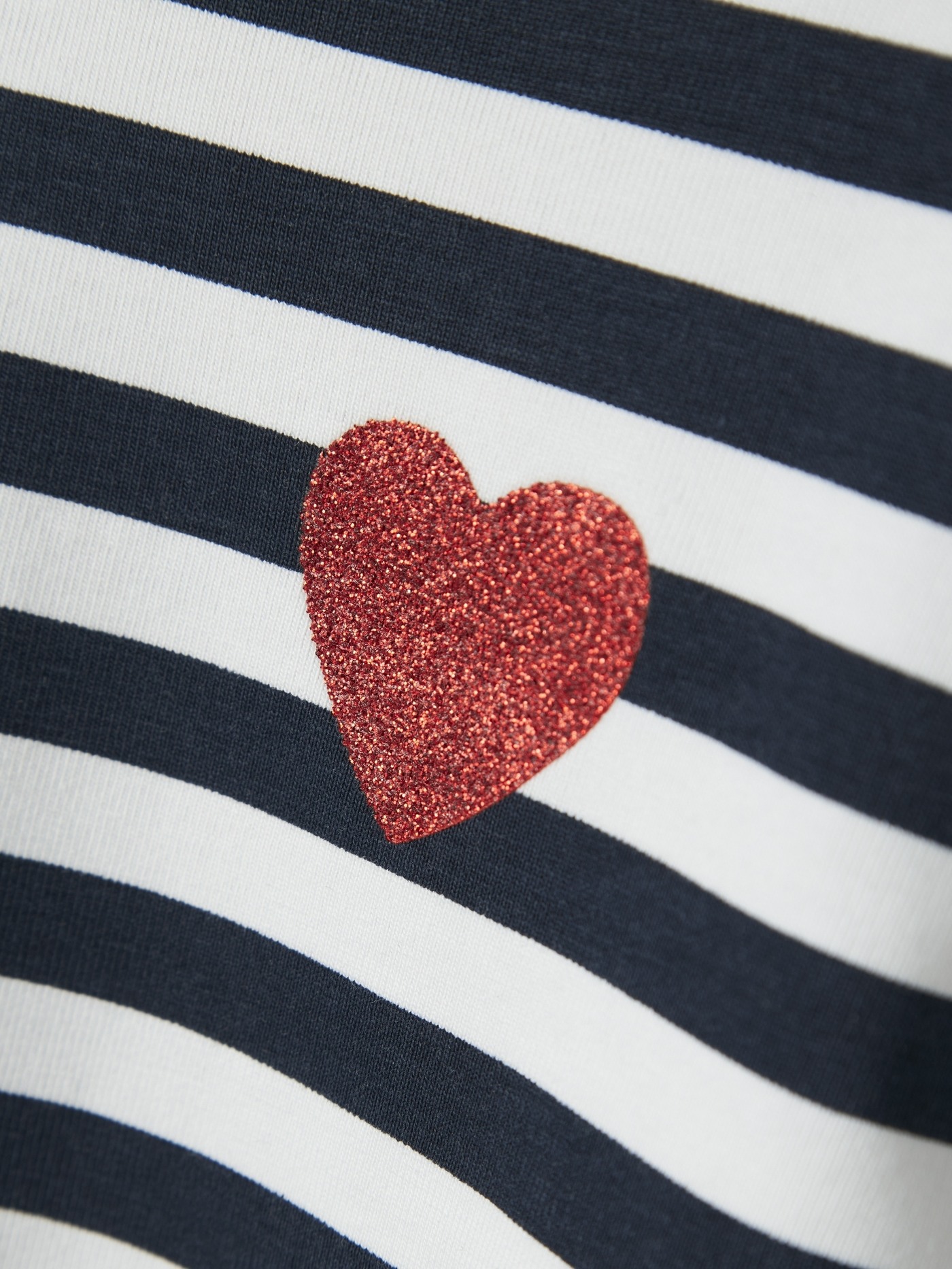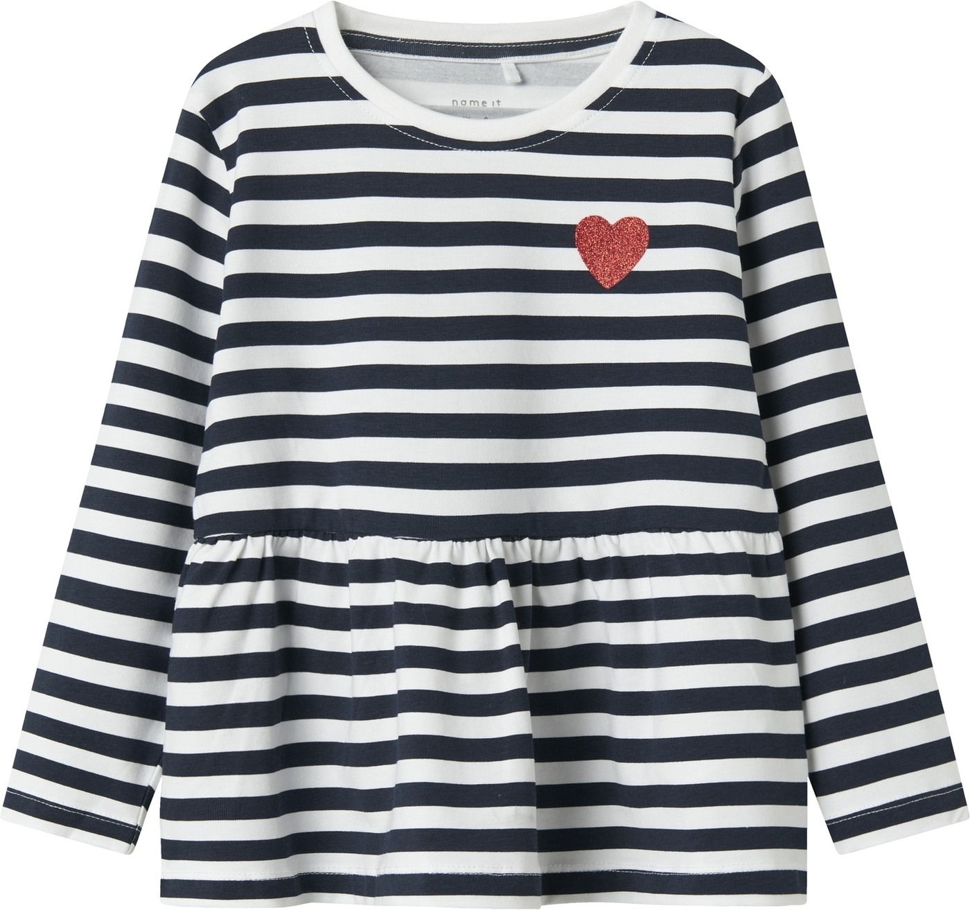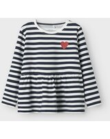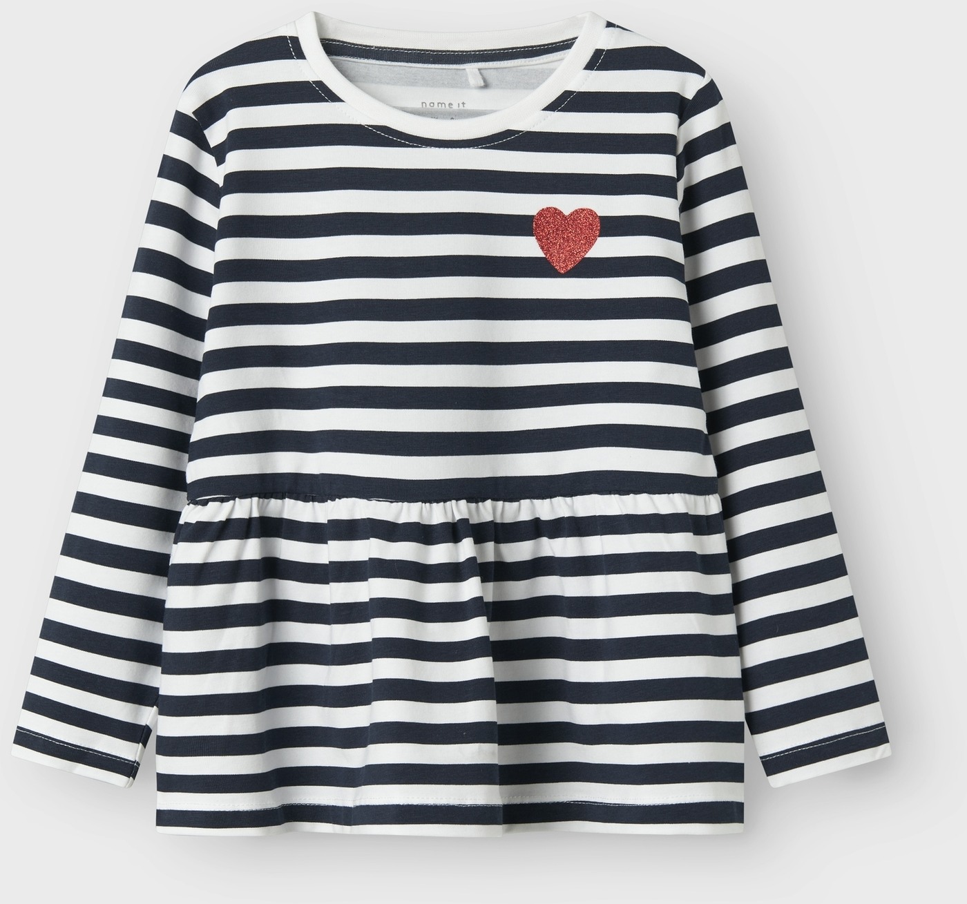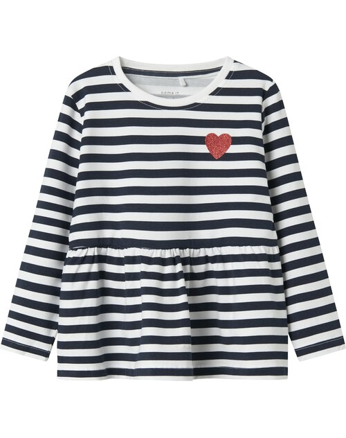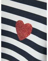 Diese tolle Langarmshirt von Name it ist dunkelblau-weiß gestreift und hat ein rot glitzendes Herz auf Höhe der linken Brust. ❤