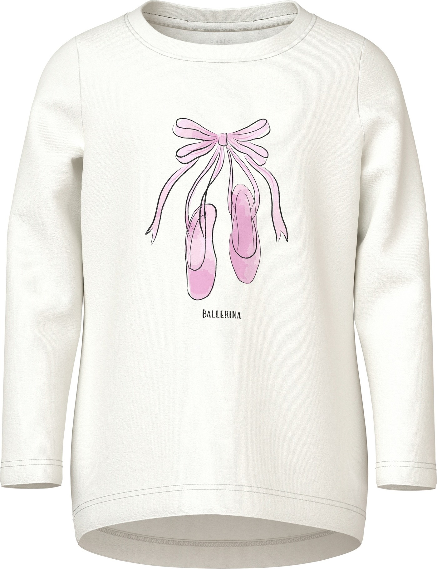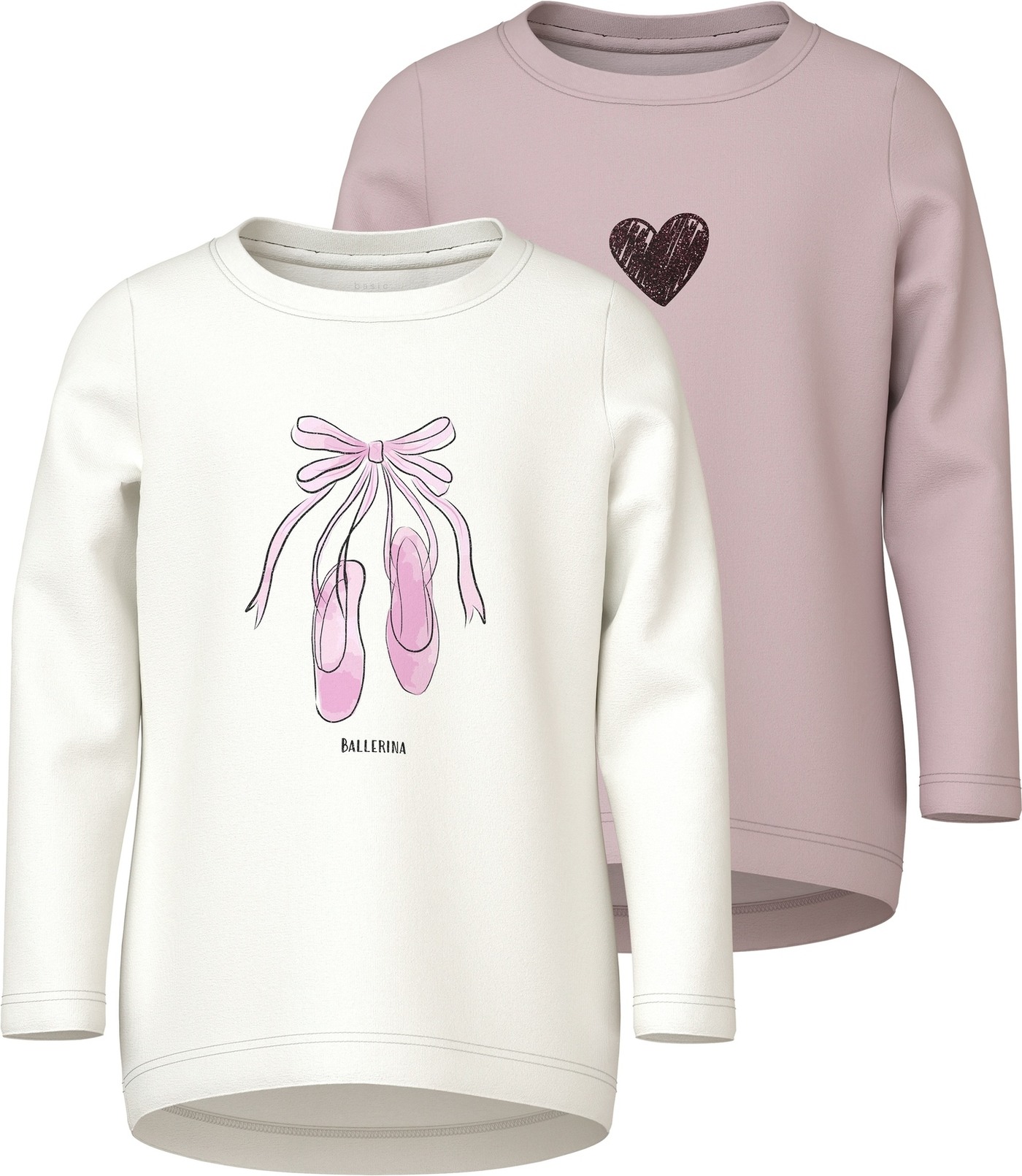 Eins der Langarmshirts ist weiß und hat ein Paar Ballettschuhe auf der Vorderseite abgebildet. 🩰