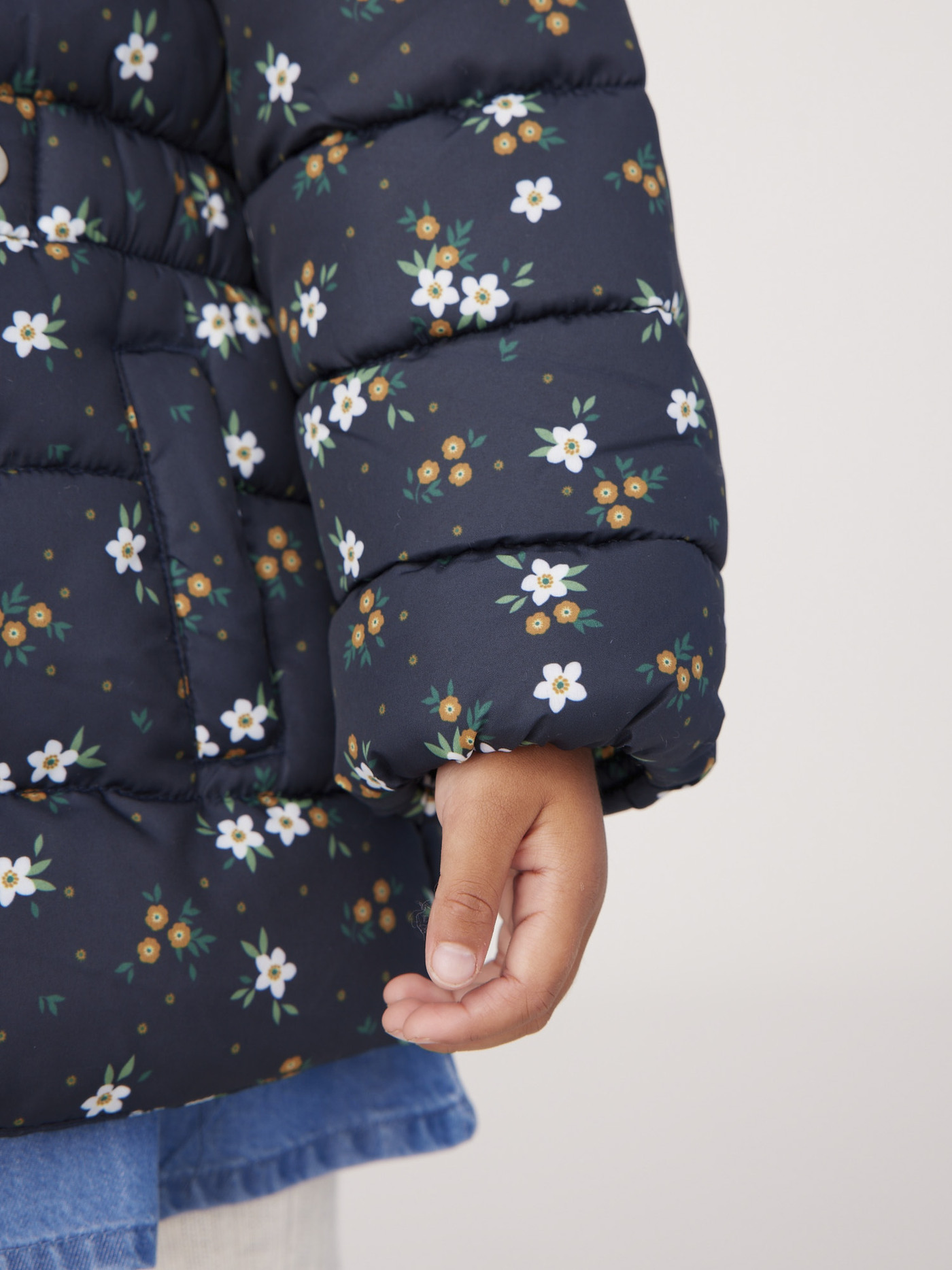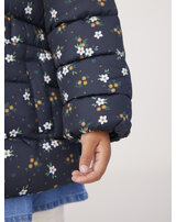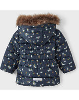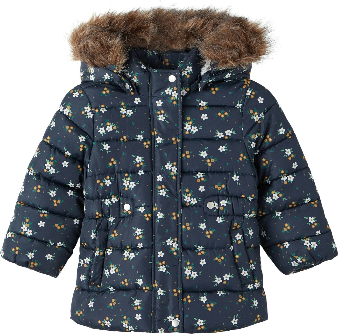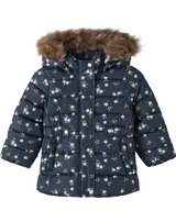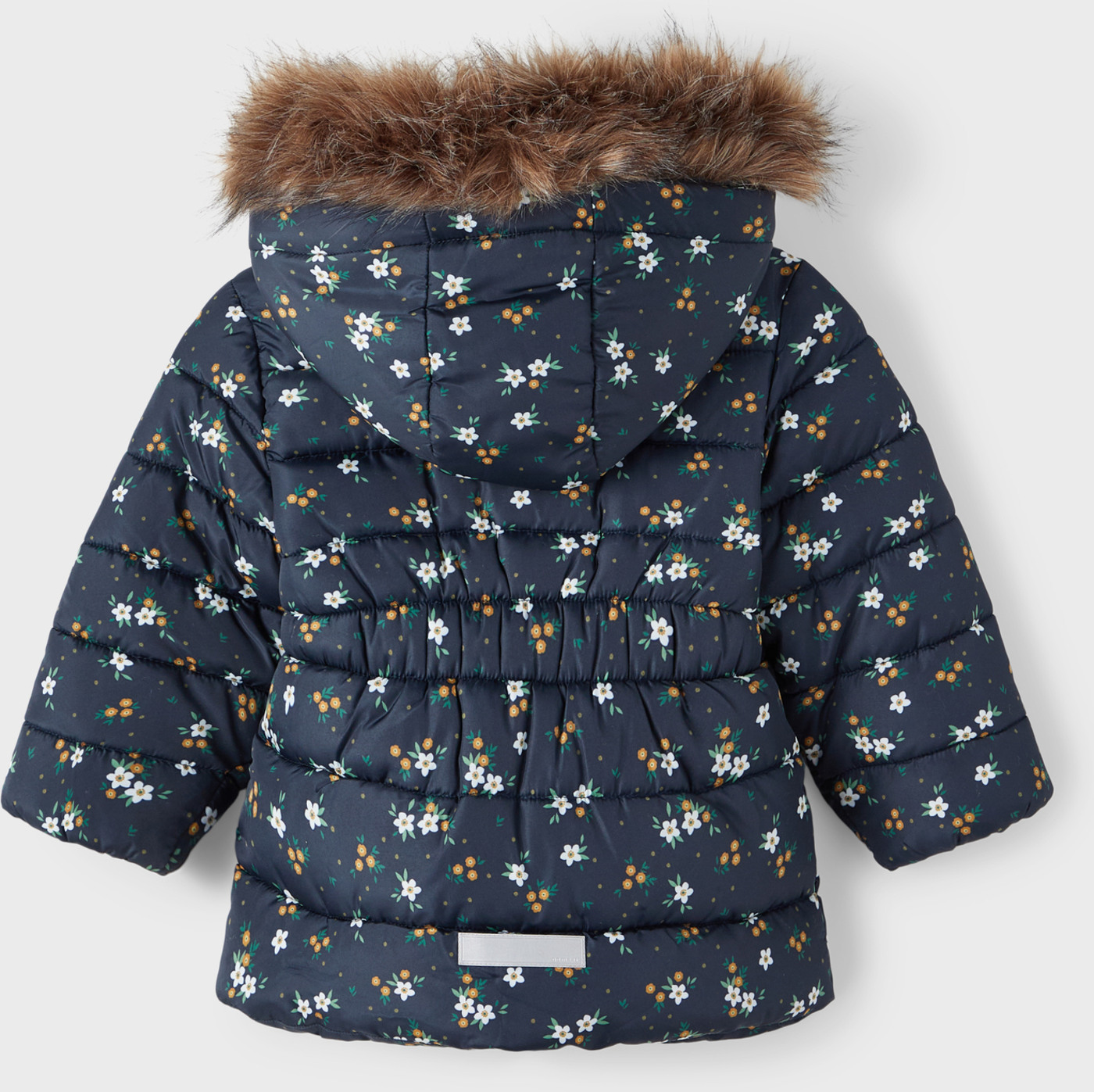 Hübscher Winter-Parka in dunkelblau und Blumenmuster mit abnehmbarer Fell-Kapuze von NAME IT für Mädchen. Das Kunstfell ist ebenfalls abknöpfbar.