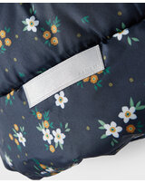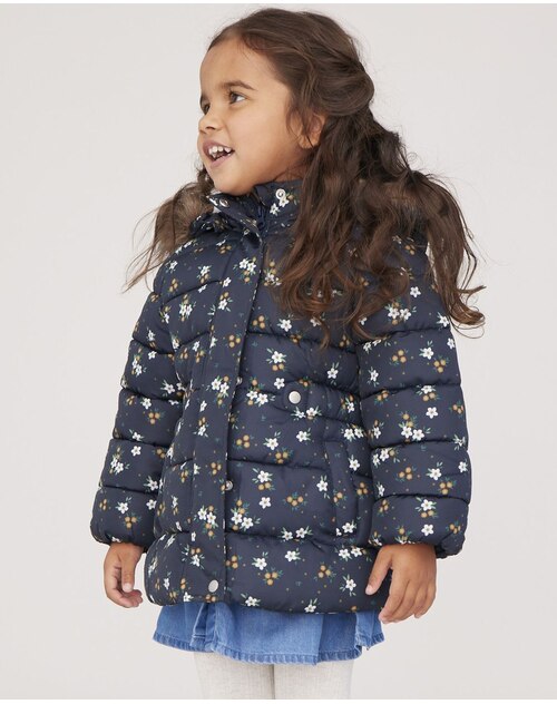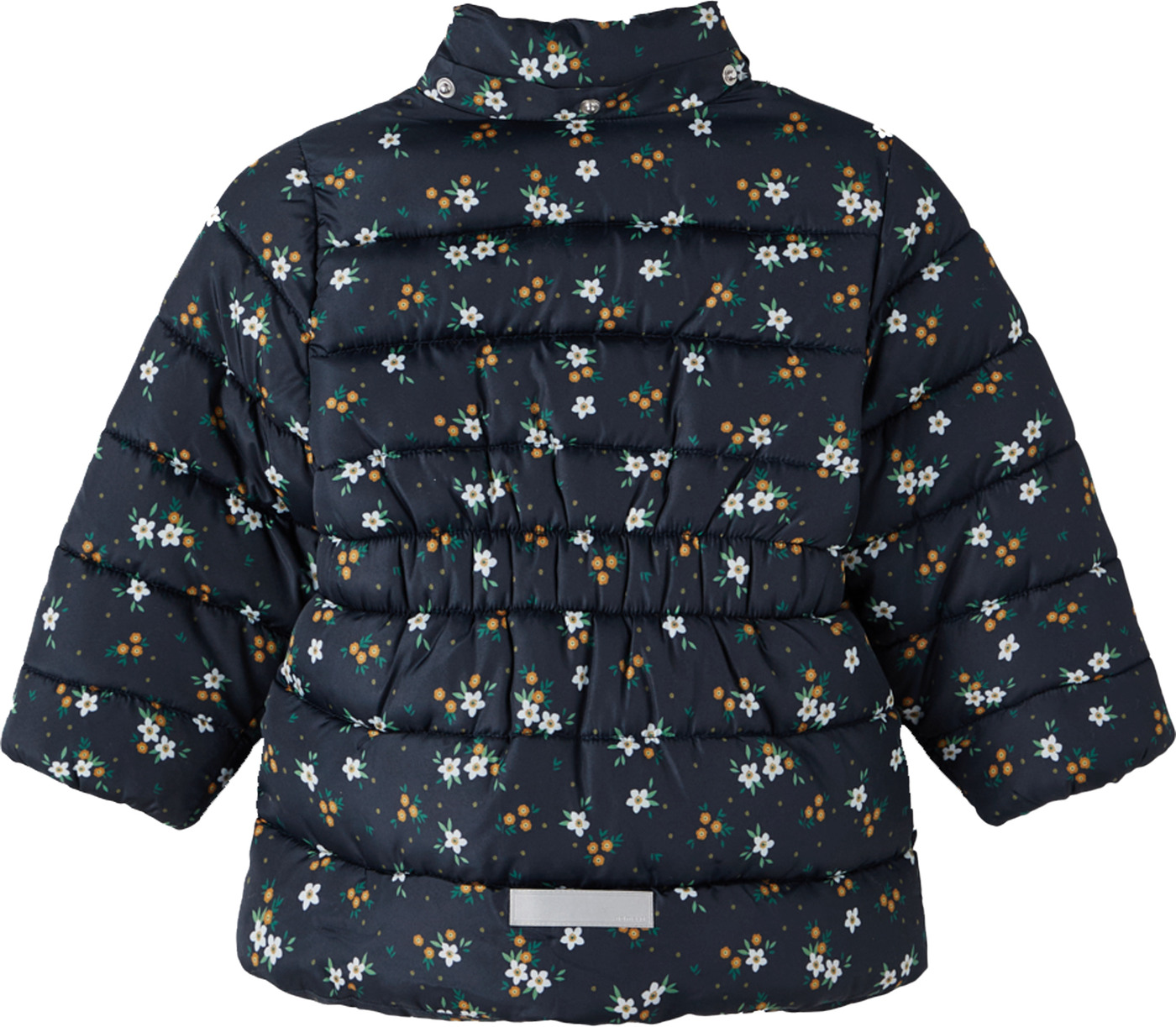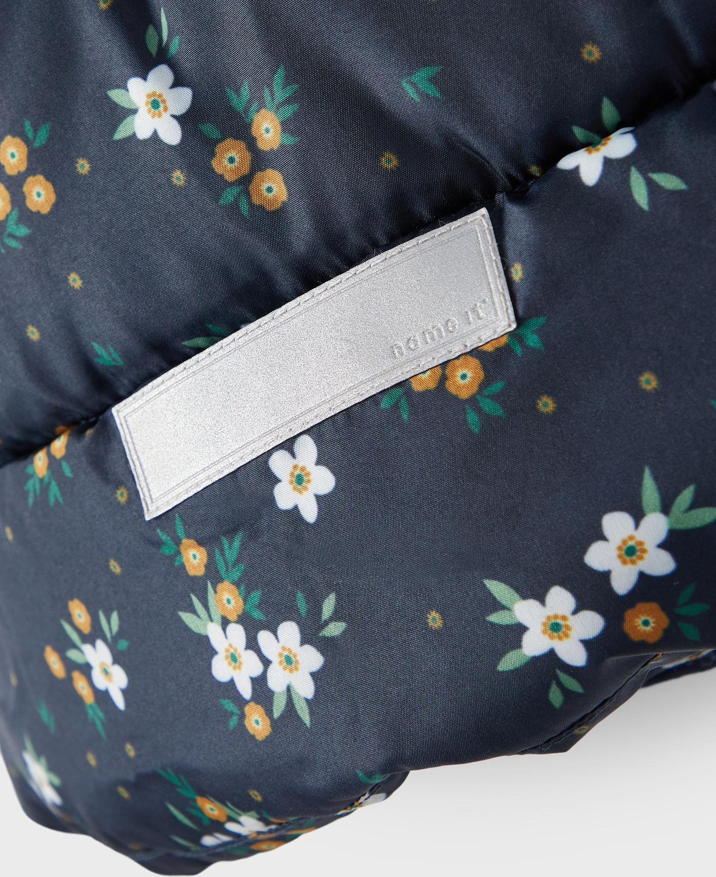 Hübscher Winter-Parka in dunkelblau und Blumenmuster mit abnehmbarer Fell-Kapuze von NAME IT für Mädchen. Das Kunstfell ist ebenfalls abknöpfbar.
