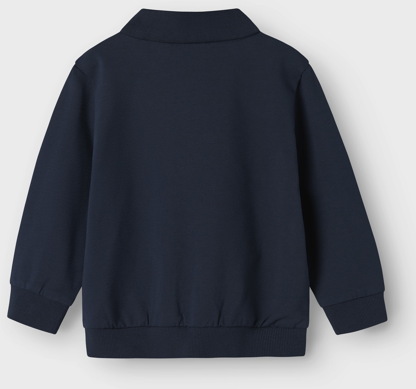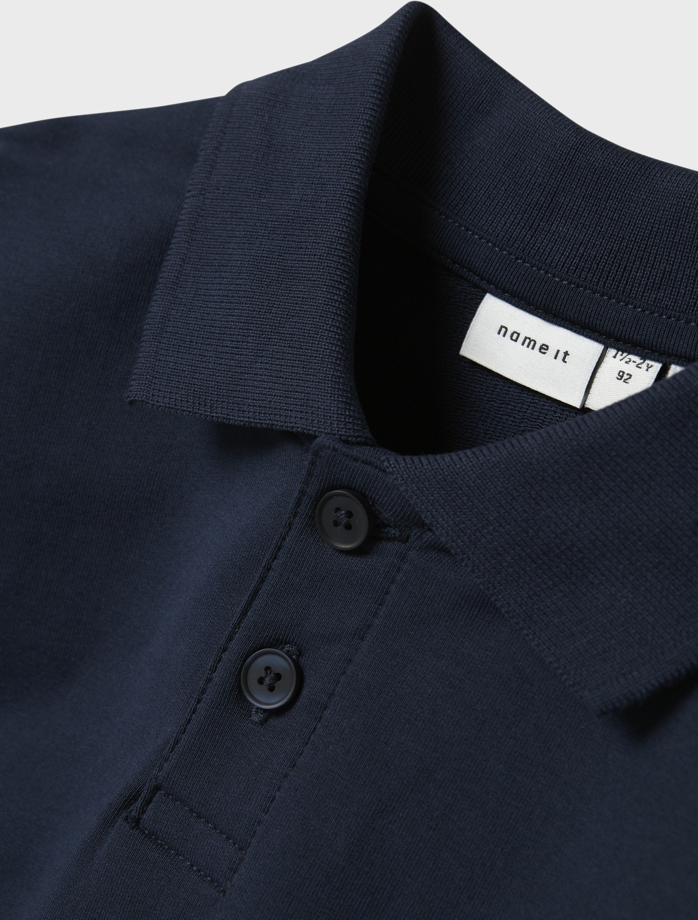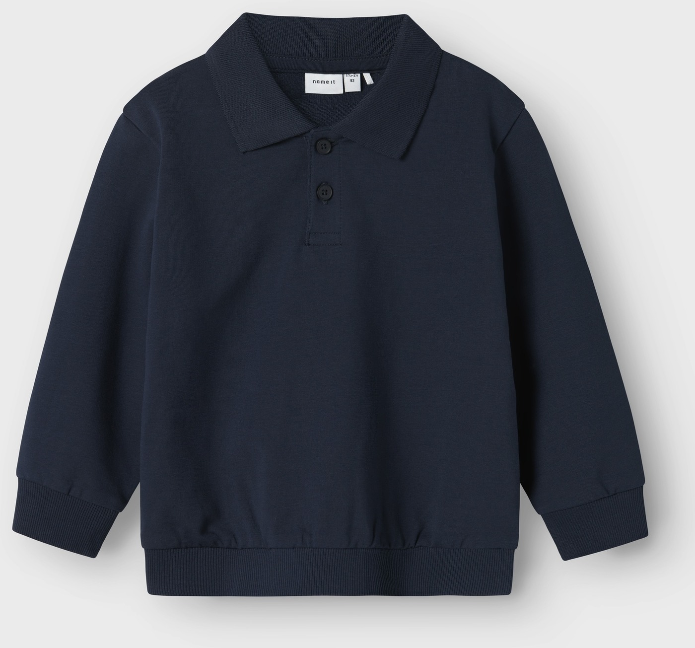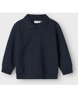 Dieses langärmlige Polo-Sweatshirt von Name it ist dunkelblau, hat einen gleichfarbigen Kragen und passende Knöpfe.