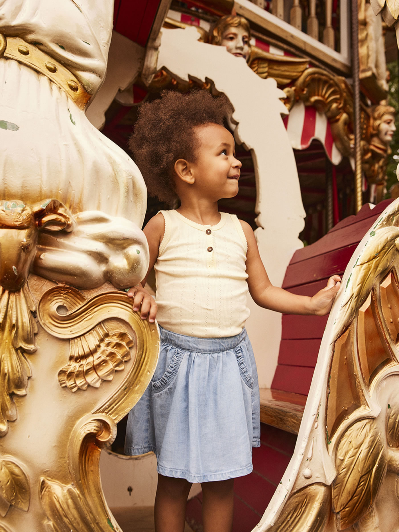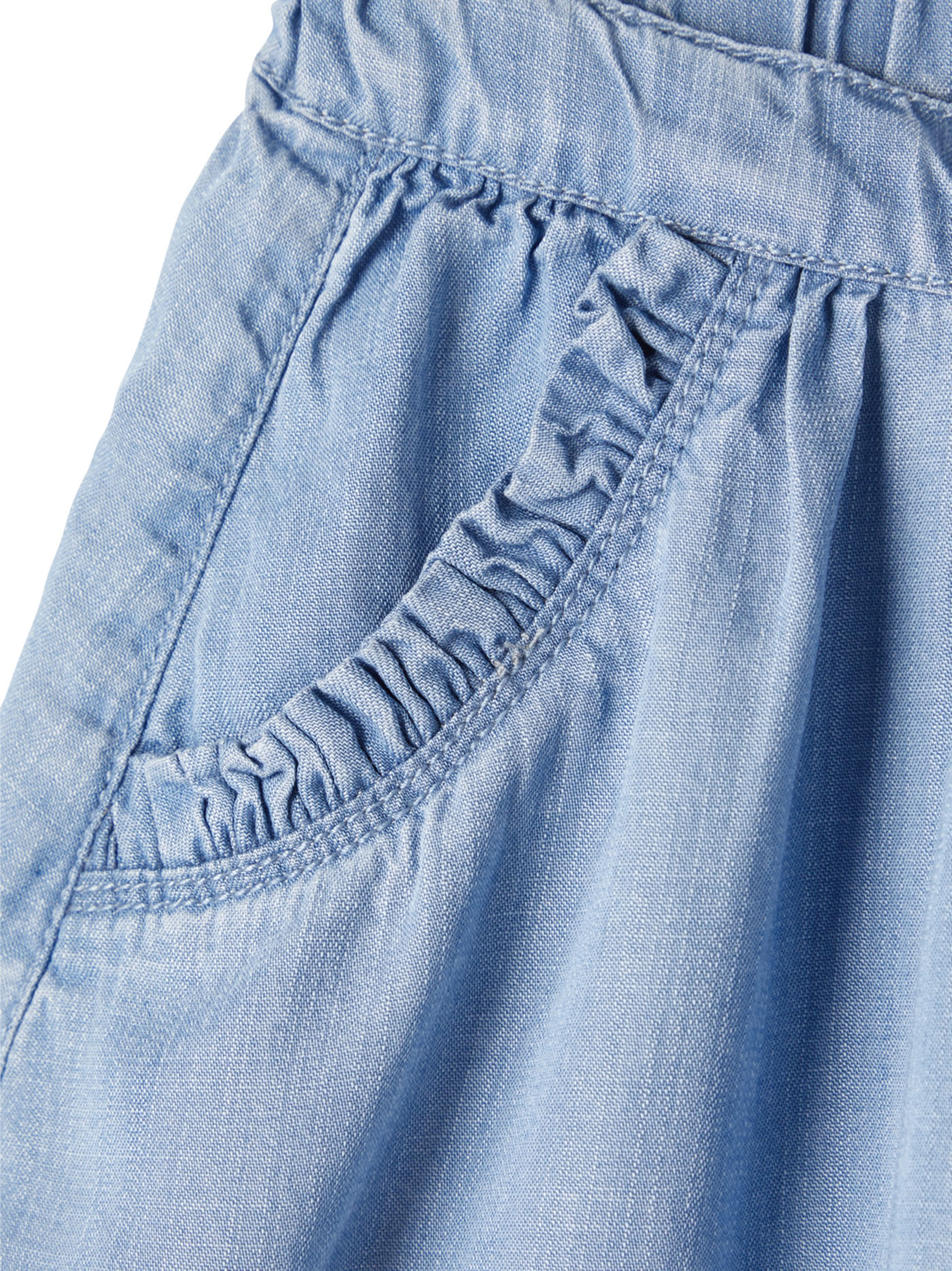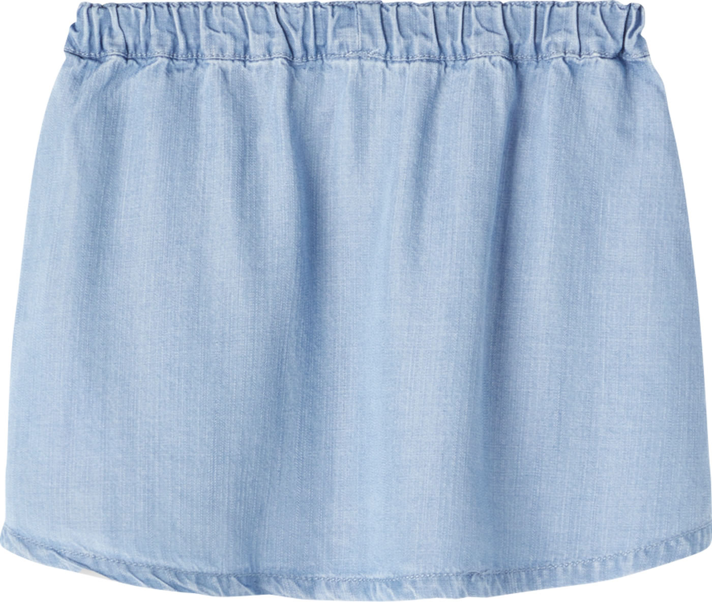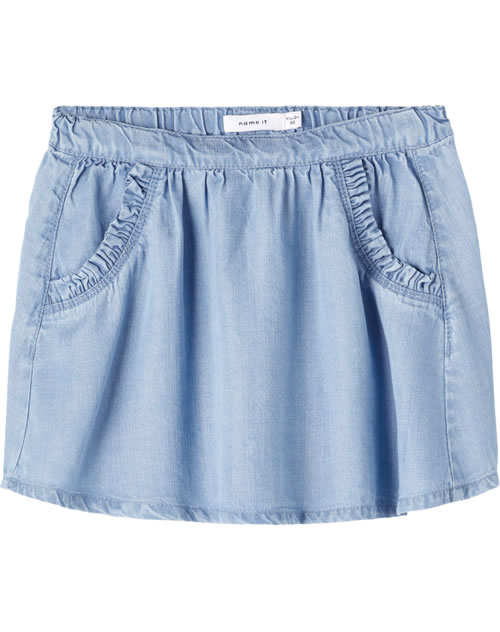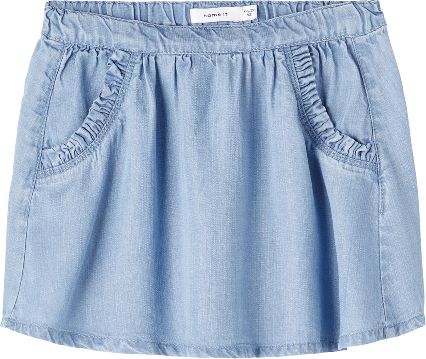 Hübscher Rock in Jeans-Optik von NAME IT. Dieser bequeme Rock ist weit ausgestellt und macht jede Bewegung mit. Ein Gummizugbund, der sich in der Weite verstellen lässt, sorgt für einen guten Sitz. Der Rock ist aus leichtem Stoff und ideal für warme Tage. Ein hübsches Detail sind die angedeuteten Taschen mit Rüschen.