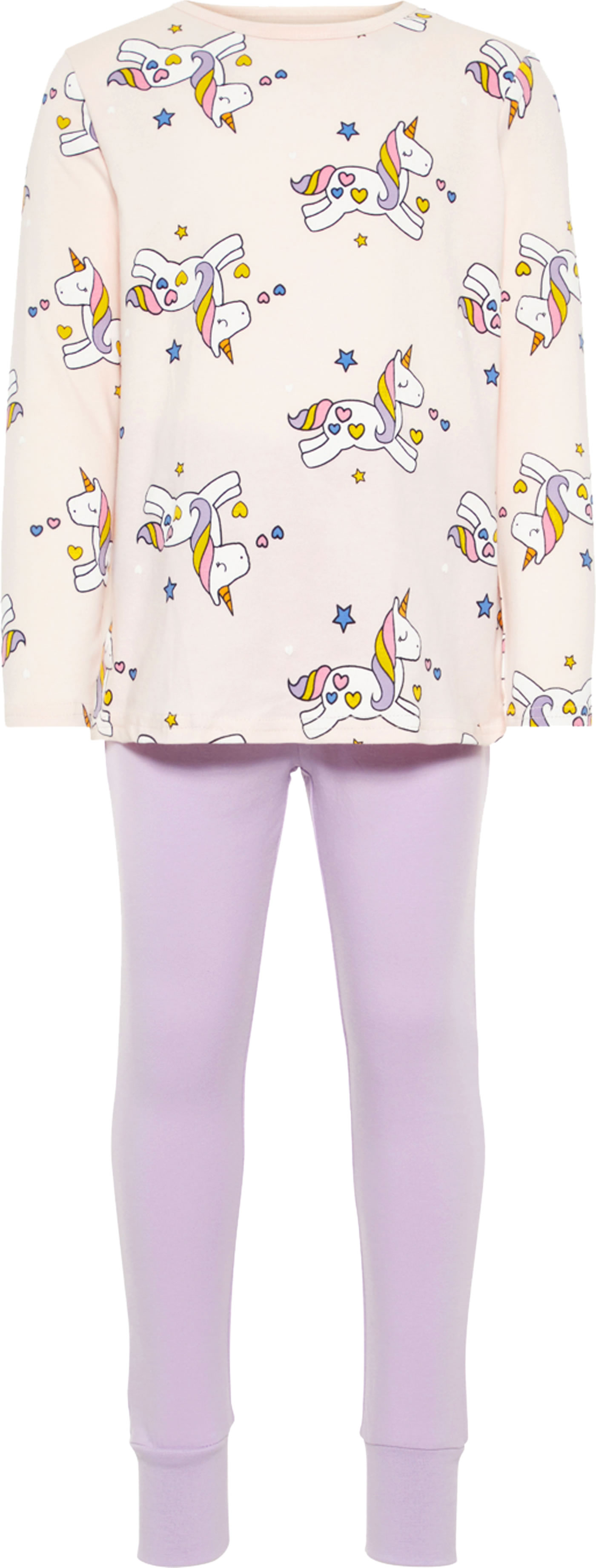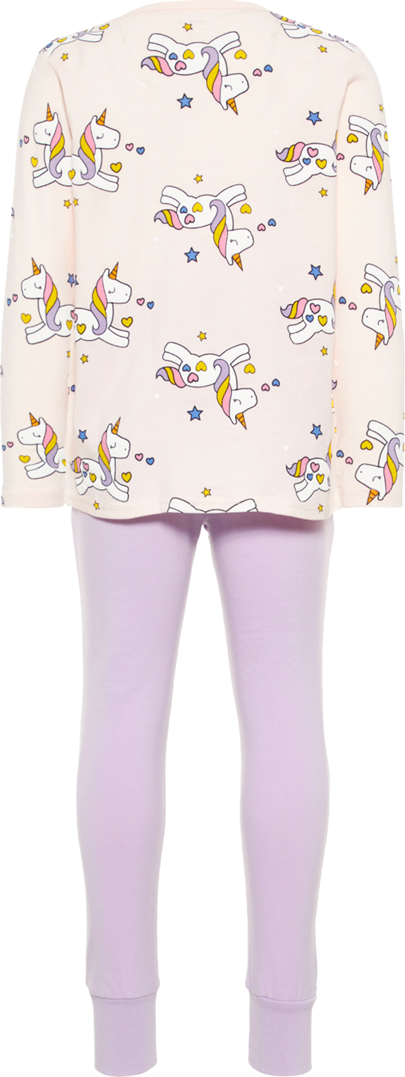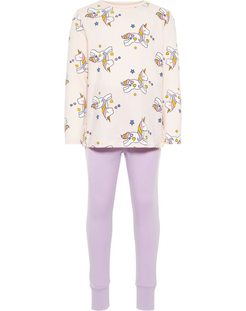 Mit diesem schönen Schlafanzug für Mädchen von NAME IT lässt es sich gut träumen. Das Oberteil ist in rosa-apricot gehalten und hat einen hübschen Einhorn-Allover-Druck auf der Vorderseite. Die Hose ist unifarben flieder. Die Hose hat einen weichen Gummibund – so kann nichts zwicken.