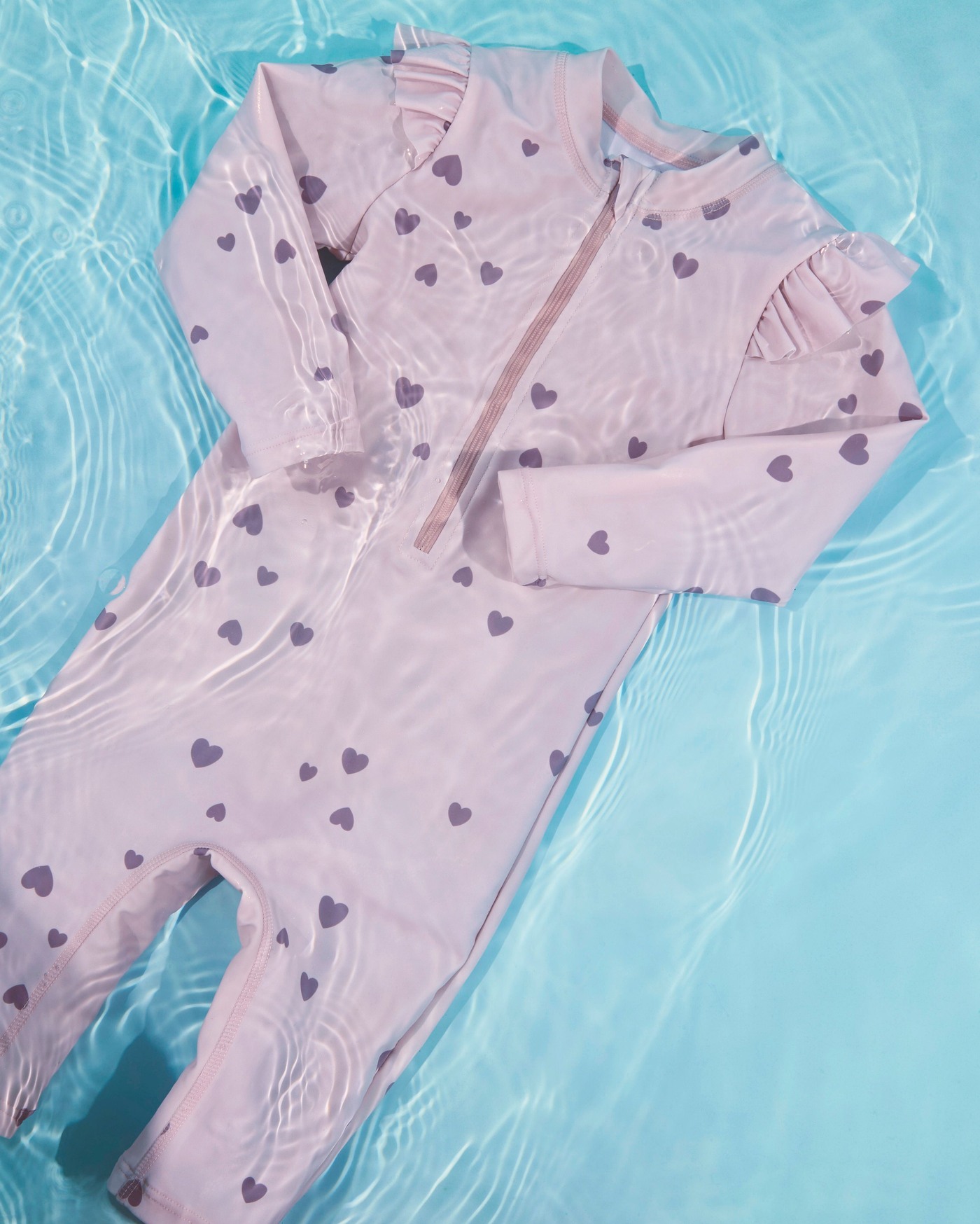 Die süßen Rüschen an den Schultern und die vielen Herzen rundum verleihen dem Schwimm-Anzug mädchenhaften Charme. 💕