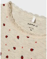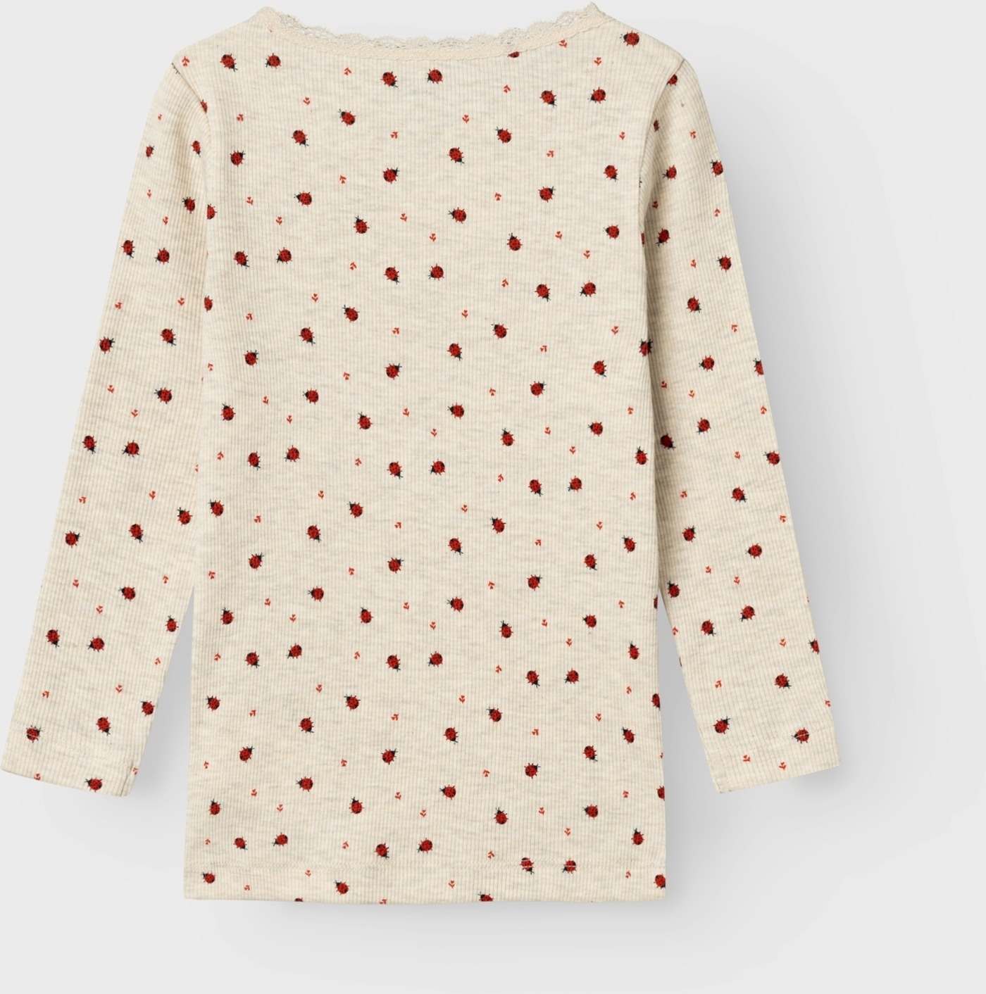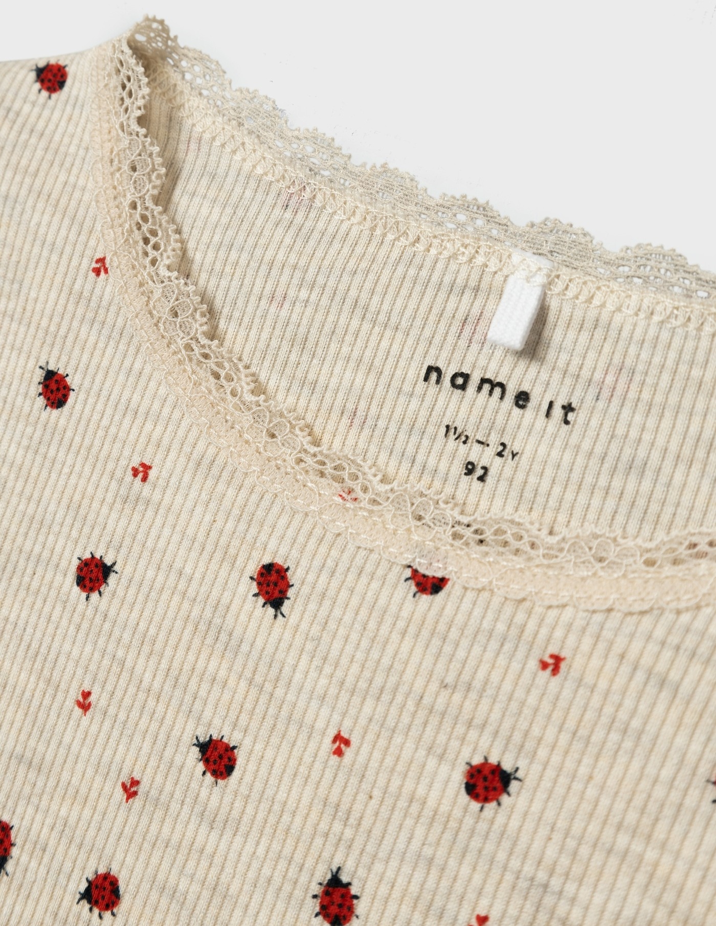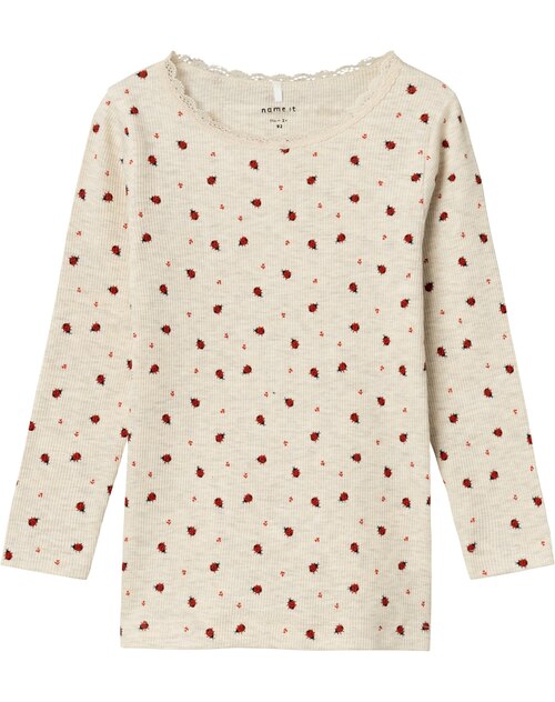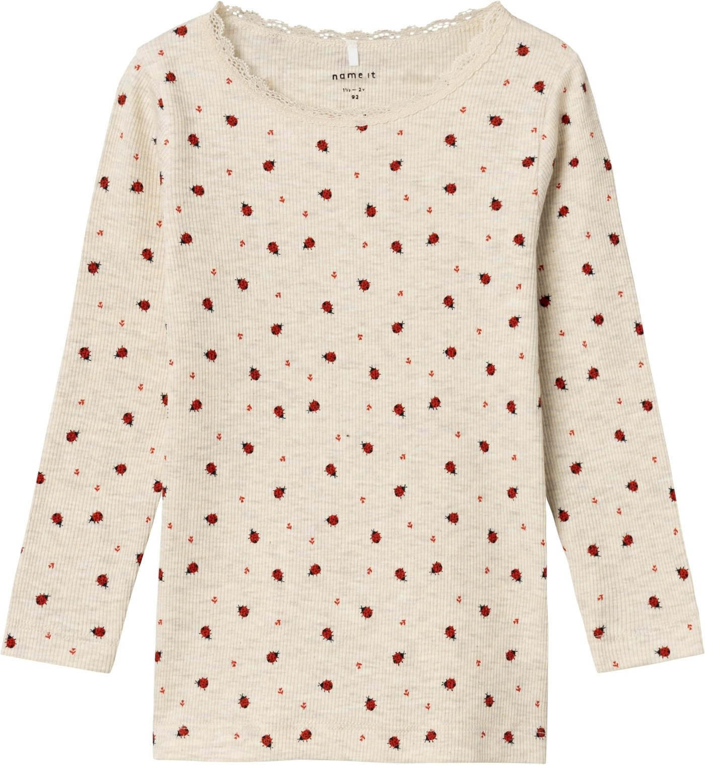 Schönes Langarmshirt für Mädchen von Name it. Besonders schön ist der Spitzenbesatz am Halsausschnitt und der Allover-Print mit kleinen Marienkäfern.