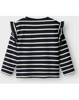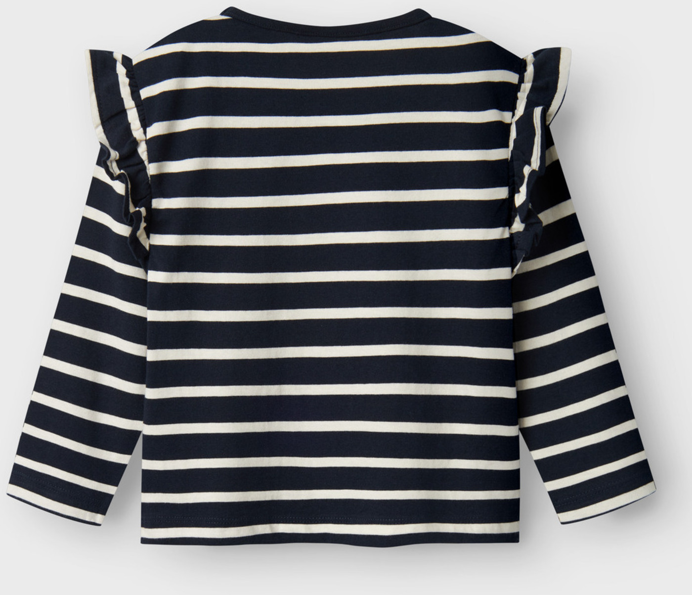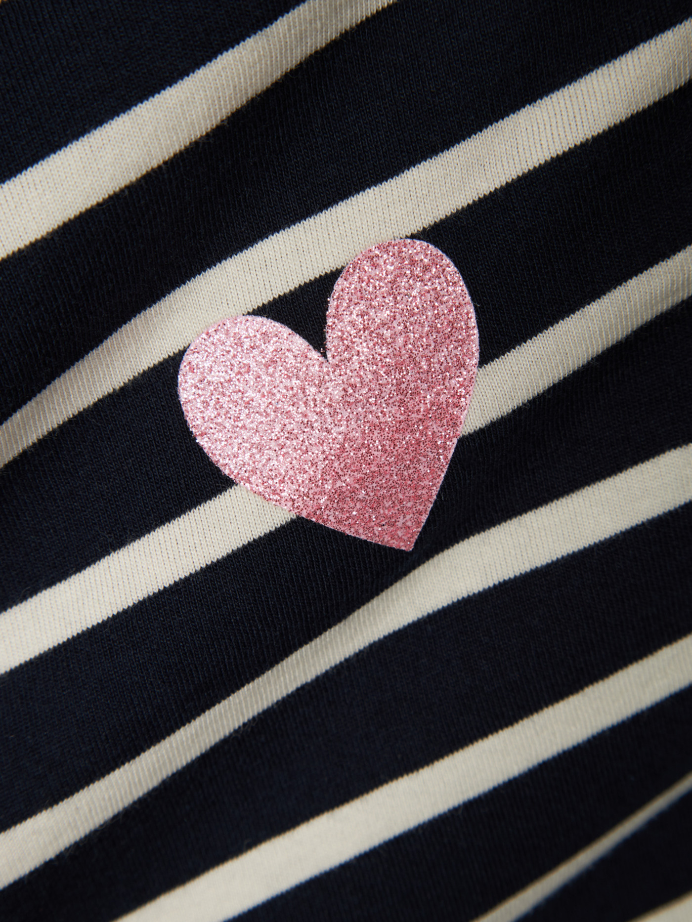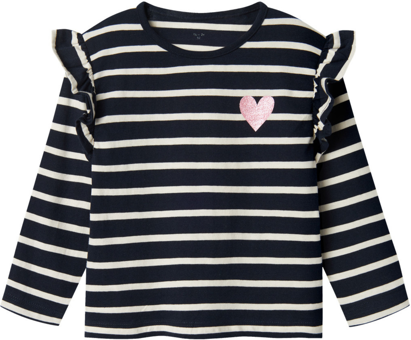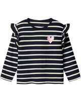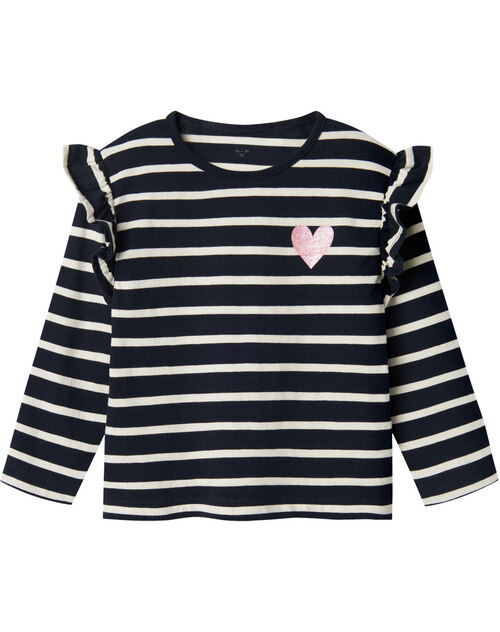 Langarmshirt für Mädchen von NAME IT. Das gestreifte Shirt hat ein glitzerndes Herz auf der Vorderseite. An den Schultern sind niedliche Rüschen. Das weiche Material sorgt für einen hohen Tragekomfort.