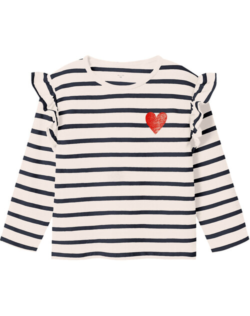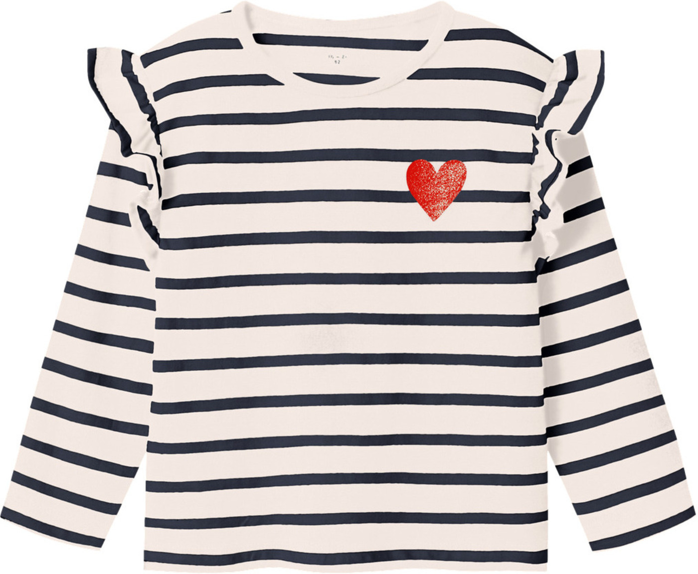 Langarmshirt für Mädchen von NAME IT. Das gestreifte Shirt hat ein glitzerndes Herz auf der Vorderseite. An den Schultern sind niedliche Rüschen. Das weiche Material sorgt für einen hohen Tragekomfort.