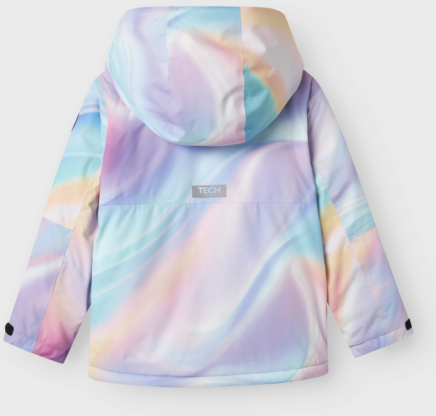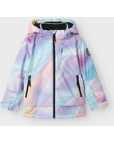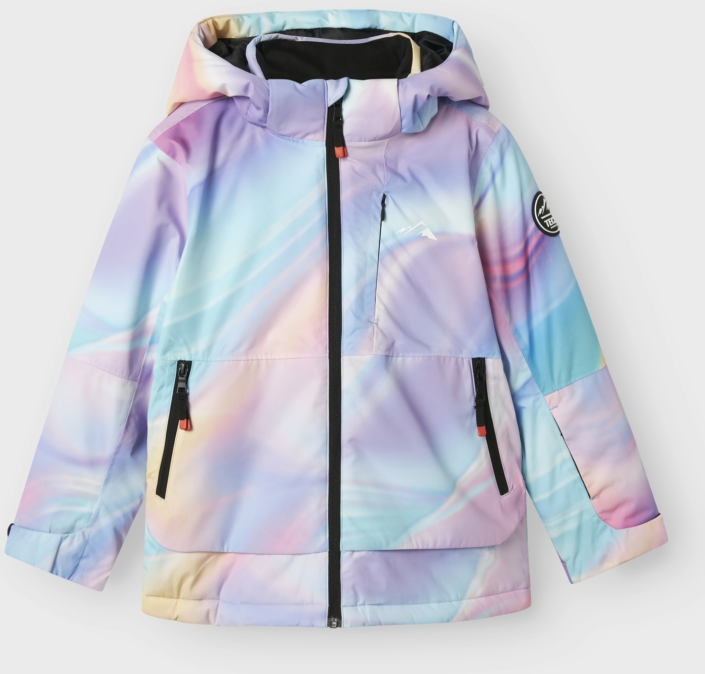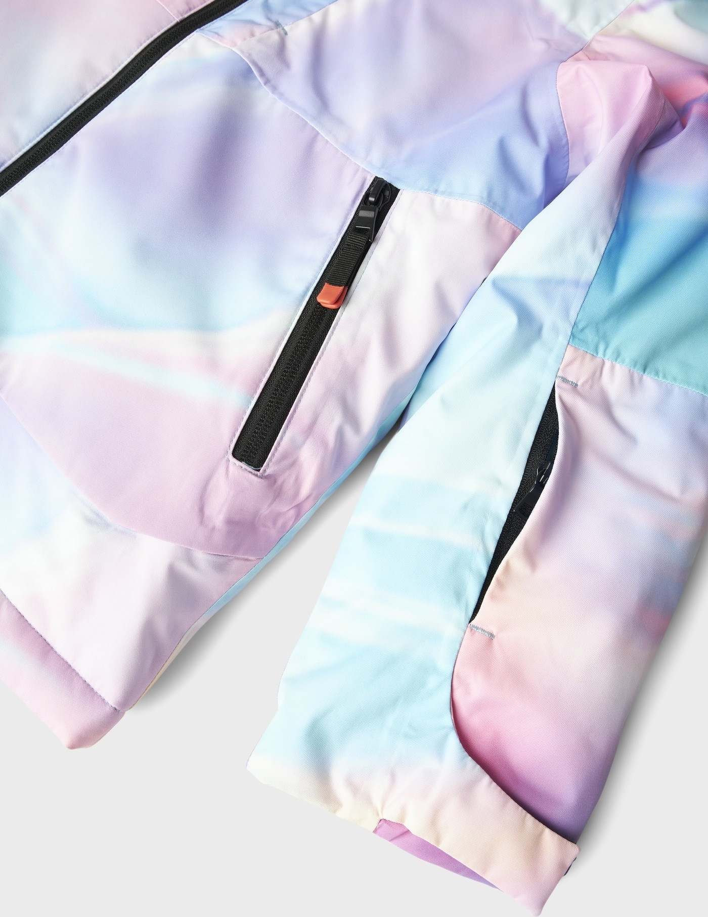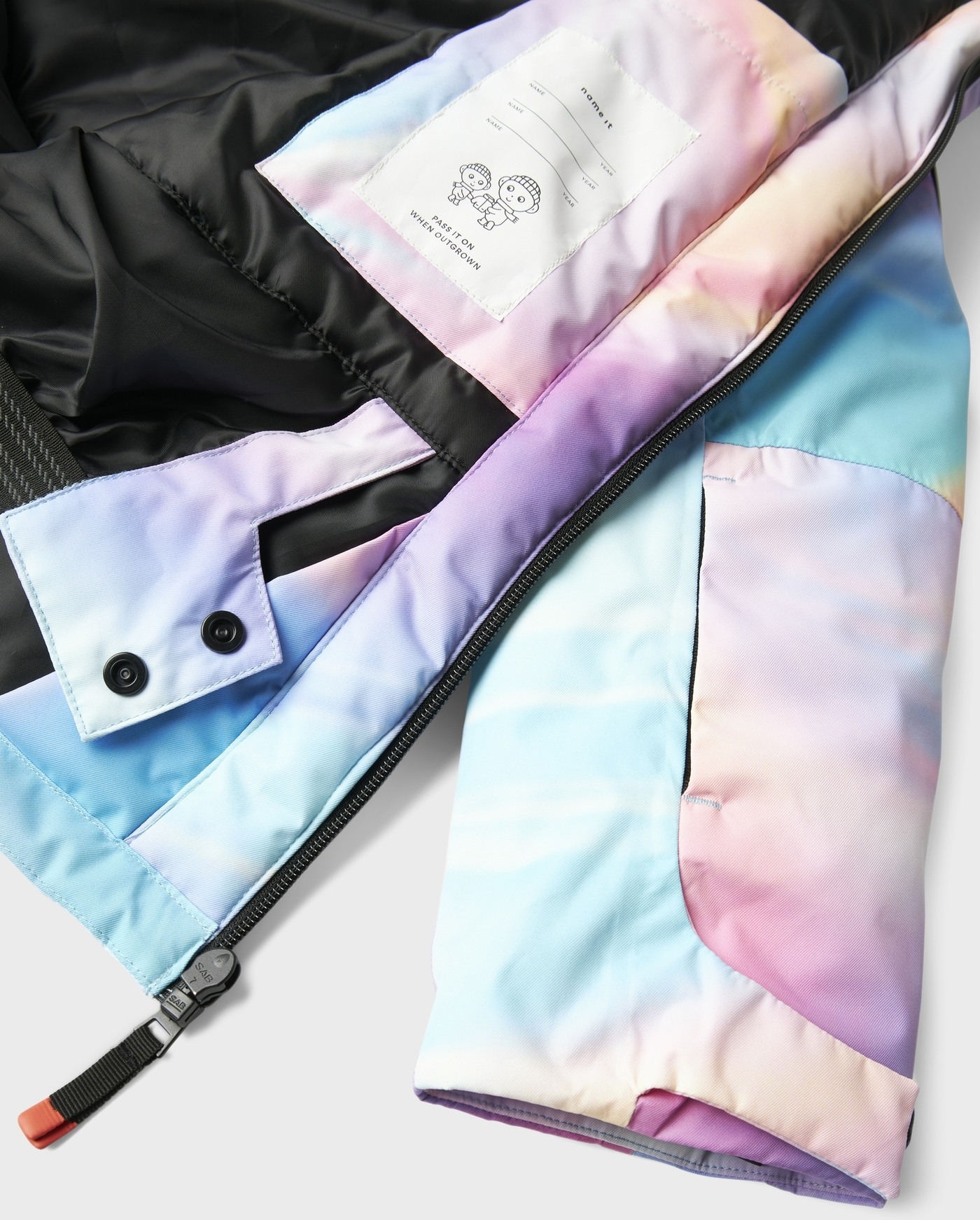 Diese auffallend schöne Skijacke von Name it zaubert beim Anblick der vielen bunten Farben wie Lila, Rosa, Blau, Türkis und Orange direkt gute Laune. 😍