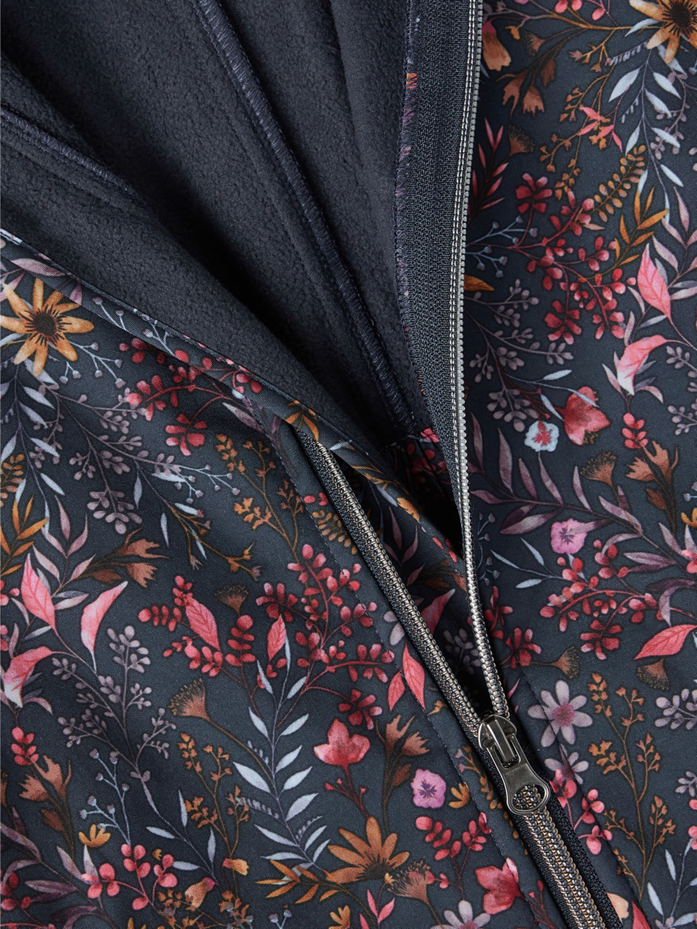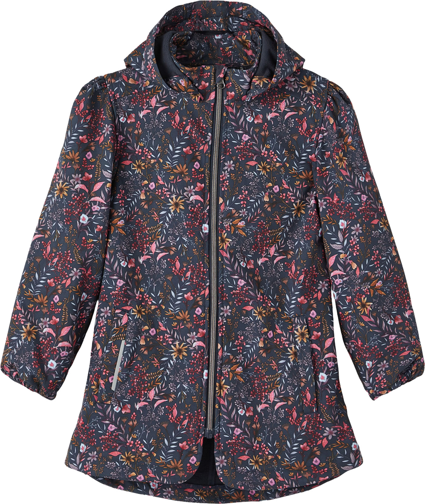 Länger geschnittene Softshell-Jacke mit tollem Blumenmuster und abnehmbarer Kapuze von NAME IT für Mädchen. Die bequeme Jacke ist komplett mit weichem Fleece gefüttert. Auf der Vorderseite befinden sich zwei Einstecktaschen. Die Jacke lässt sich per Reißverschluss schließen und die Kapuze lässt sich abnehmen..Gummizugbündchen an den Ärmeln bieten zusätzlichen Windschutz und Reflektoren sorgen für eine bessere Sichtbarkeit im Dunkeln. Durch einen Gummizug im Rückenteil ist die Jacke leicht tailliert. Die Bionic-Finish ECO Imprägnierung basiert auf einer fluorfreien Rezeptur und hält die Farbe und das Gewebe länger neu.