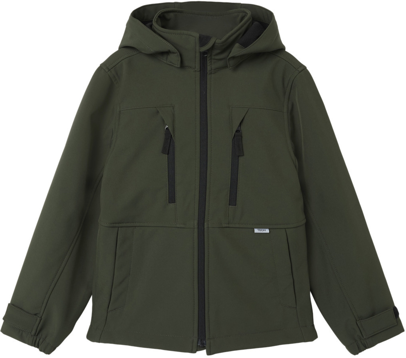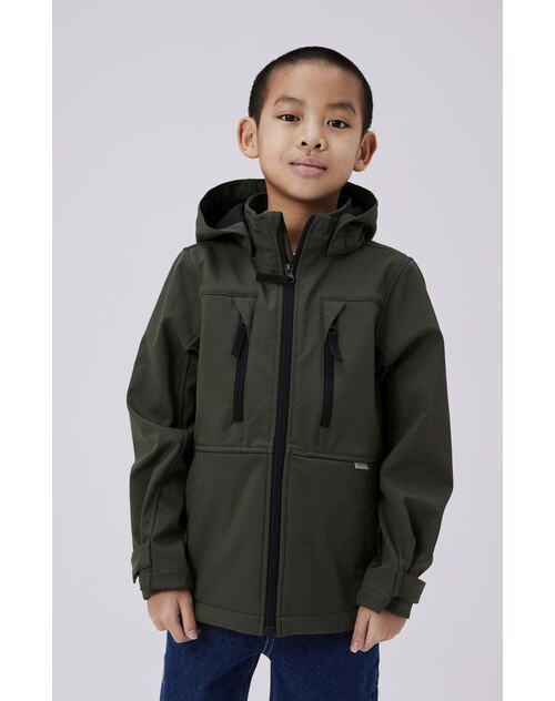 Softshell-Jacke mit abnehmbarer Kapuze von NAME IT für Kinder. Die bequeme Jacke ist komplett mit weichem Fleece gefüttert. Auf der Vorderseite befinden sich mehrere Taschen. Die Jacke lässt sich per Reißverschluss schließen. Gummizugbündchen an den Ärmeln bieten zusätzlichen Windschutz und Reflektoren sorgen für eine bessere Sichtbarkeit im Dunkeln. Die Bionic-Finish ECO Imprägnierung basiert auf einer fluorfreien Rezeptur und hält die Farbe und das Gewebe länger neu.