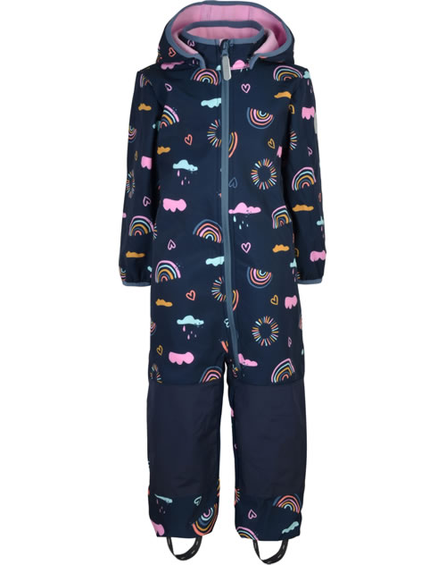 Toller Softshell Overall in blau mit Regenbogen-Motiv von NAME IT. Der Overall ist aus atmungsaktivem, wasser- und winddichtem Stoff. Das Oberteil ist mit einer abnehmbaren Kapuze ausgestattet. Die Ärmel- und die Bein-Bündchen haben einen Gummizug. Damit die Hosenbeine nicht nach oben rutschen, sind Fußstege vorhanden. Die Fußstege sind verstellbar und können auch ganz abgenommen werden. Für gute Sichtbarkeit im Dunkeln sorgen reflektierende Elemente. Am Po und den Knien ist der Stoff verstärkt und weiches Fleece-Futter hält angenehm warm.
