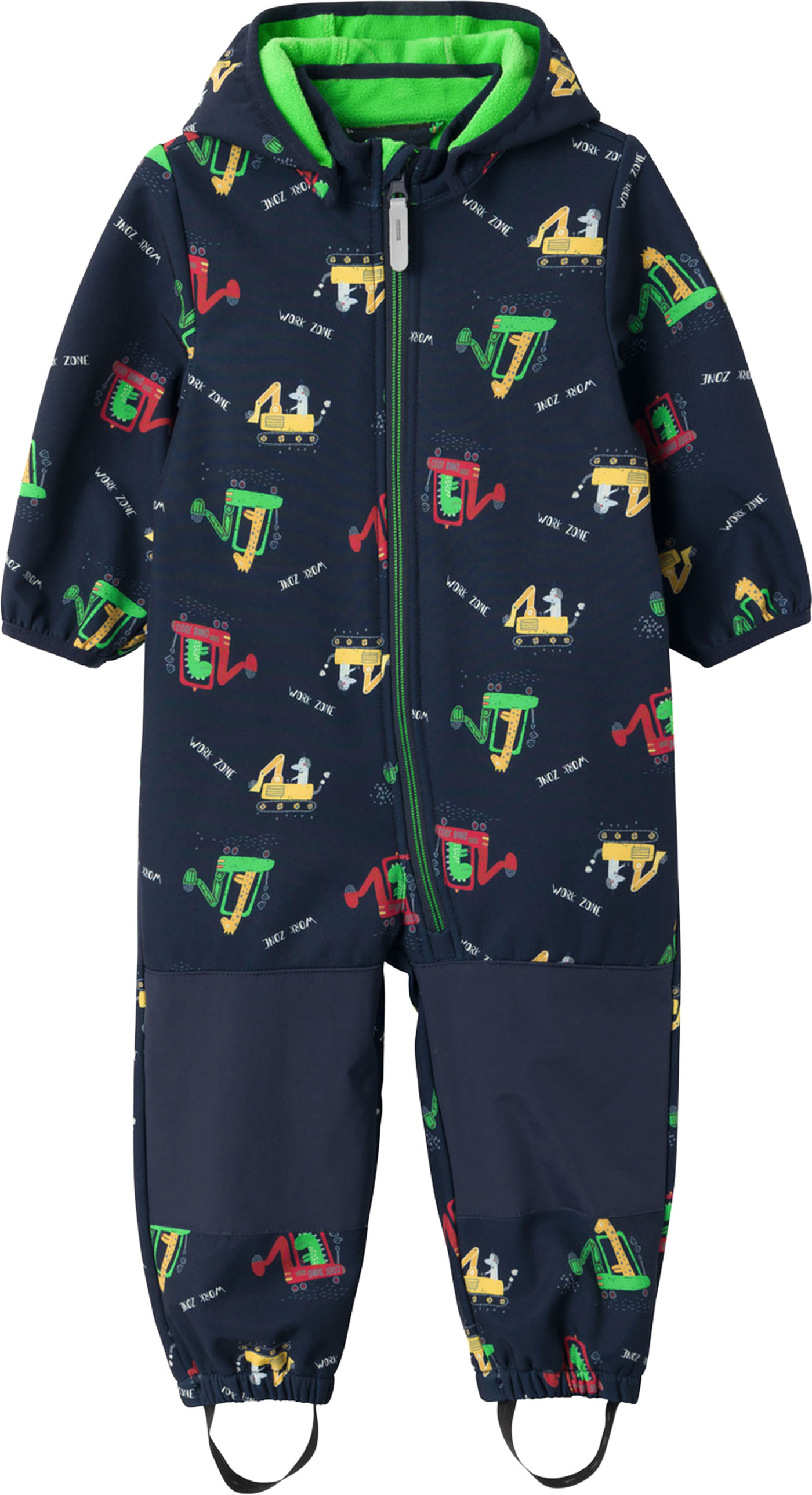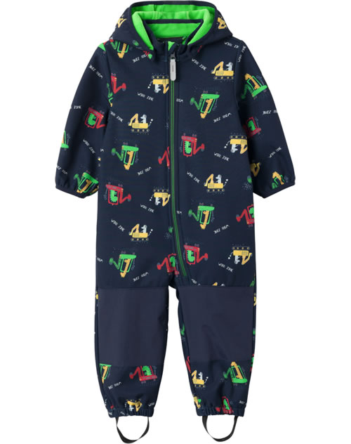 Toller Softshell Overall in blau mit bunten Bagger-und Tier-Motiven von NAME IT. Der Overall ist aus atmungsaktivem, wasser- und winddichtem Stoff. Das Oberteil ist mit einer abnehmbaren Kapuze ausgestattet. Die Ärmel- und die Bein-Bündchen haben einen Gummizug. Damit die Hosenbeine nicht nach oben rutschen, sind Fußstege vorhanden. Die Fußstege sind verstellbar und können auch ganz abgenommen werden. Für gute Sichtbarkeit im Dunkeln sorgen reflektierende Elemente. Am Po und den Knien ist der Stoff verstärkt und weiches Fleece-Futter hält angenehm warm.