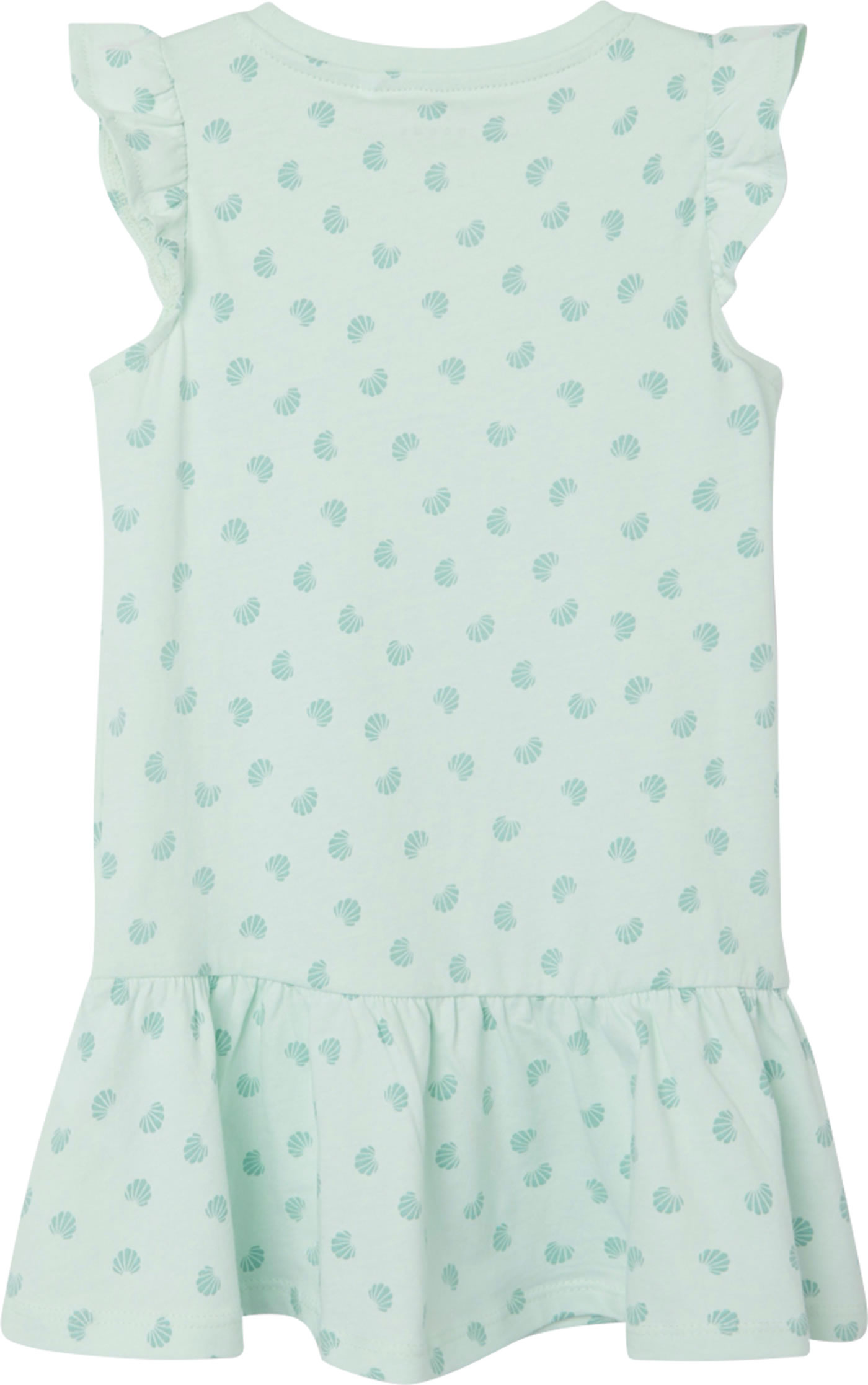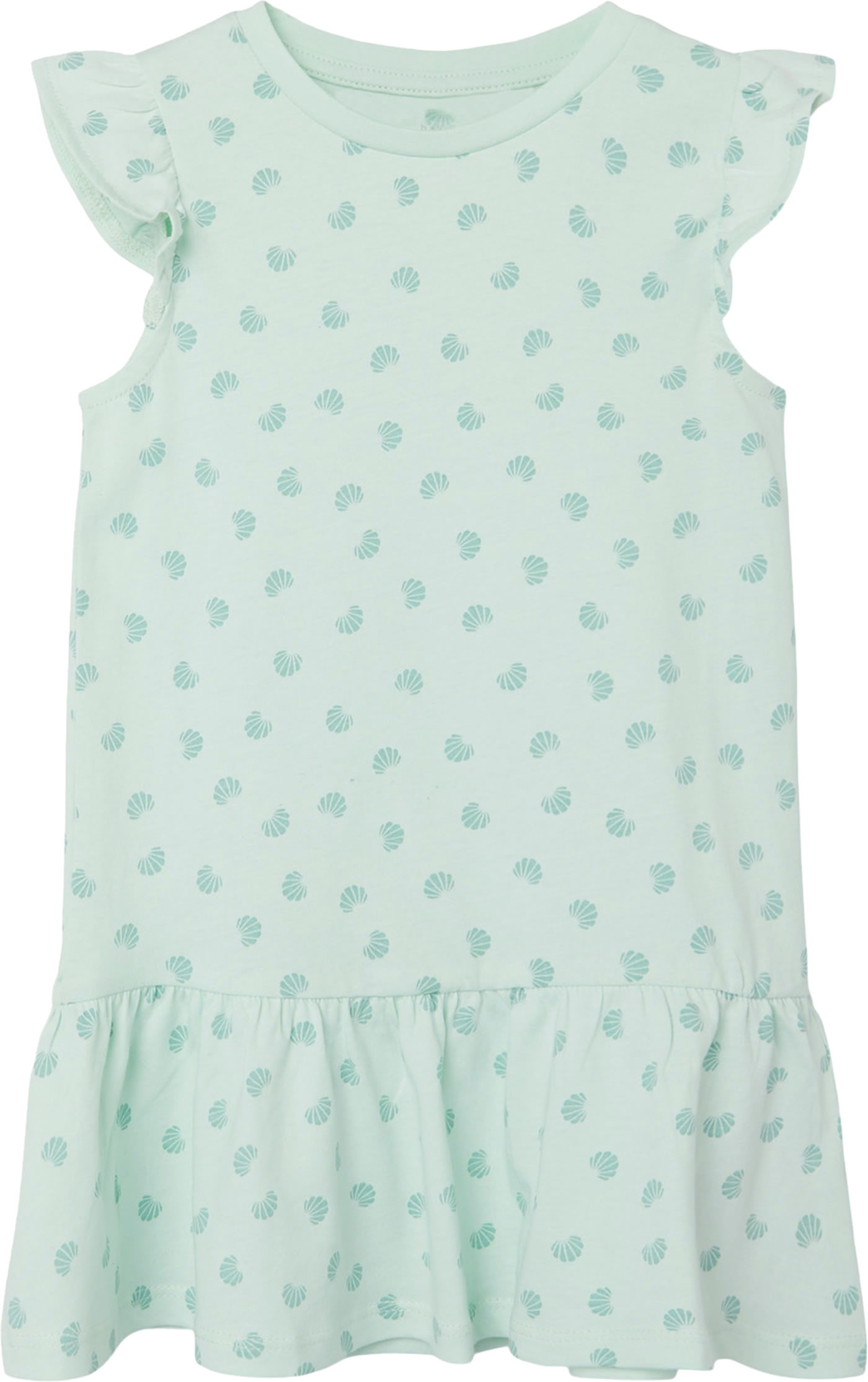 Kleid aus leichter Baumwolle mit Flügelärmeln von NAME IT. Der lockere Schnitt des Kleides bietet viel Bewegungsfreiheit.Das Kleid hat einen tollen Alloverdruck mit kleinen Muscheln. Der Rockteil ist leicht gerafft.