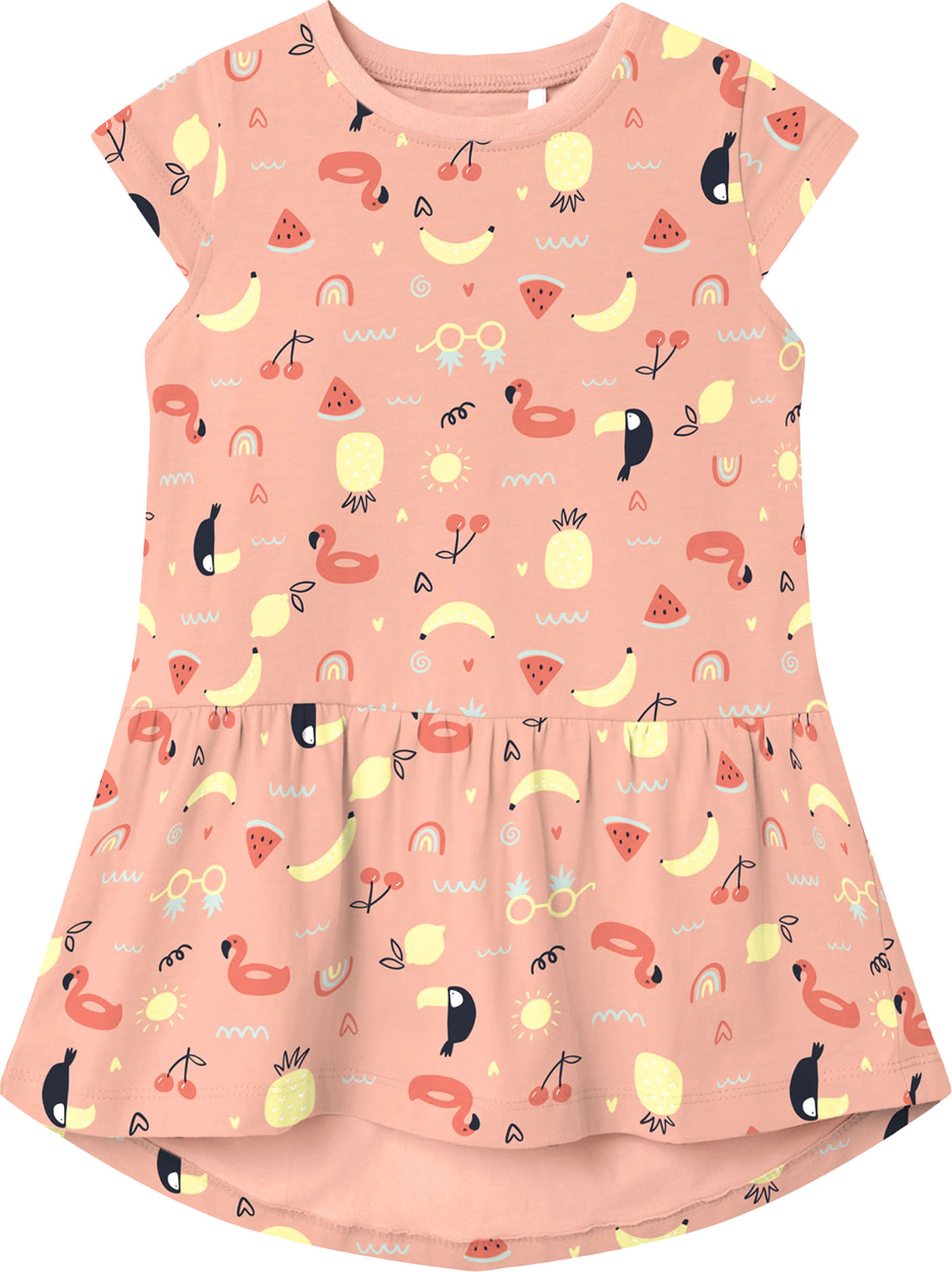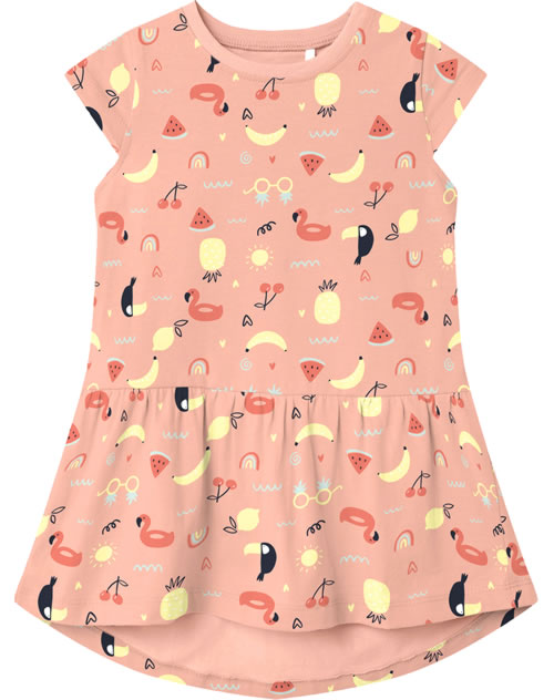 Kleid aus leichter Baumwolle mit kurzen Ärmeln von NAME IT. Der lockere Schnitt des Kleides bietet viel Bewegungsfreiheit.Das Kleid hat einen tollen Alloverdruck. Der Rockteil ist leicht gerafft und ist hinten etwas länger geschnitten.