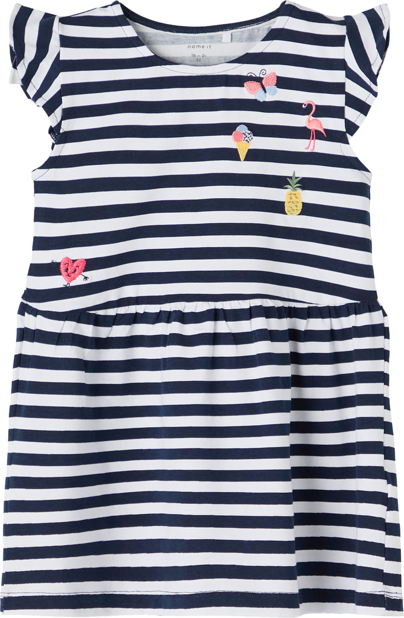 Schönes gestreiftes Kleid aus leichtem Baumwollgemisch mit Flügelärmeln von NAME IT. Der lockere Schnitt des Kleides bietet viel Bewegungsfreiheit und lässt sich prima kombinieren. Ein schönes Detail sind die Stickereien auf der Vorderseite. Der Gummizug an der Taille sorgt für einen guten Sitz.