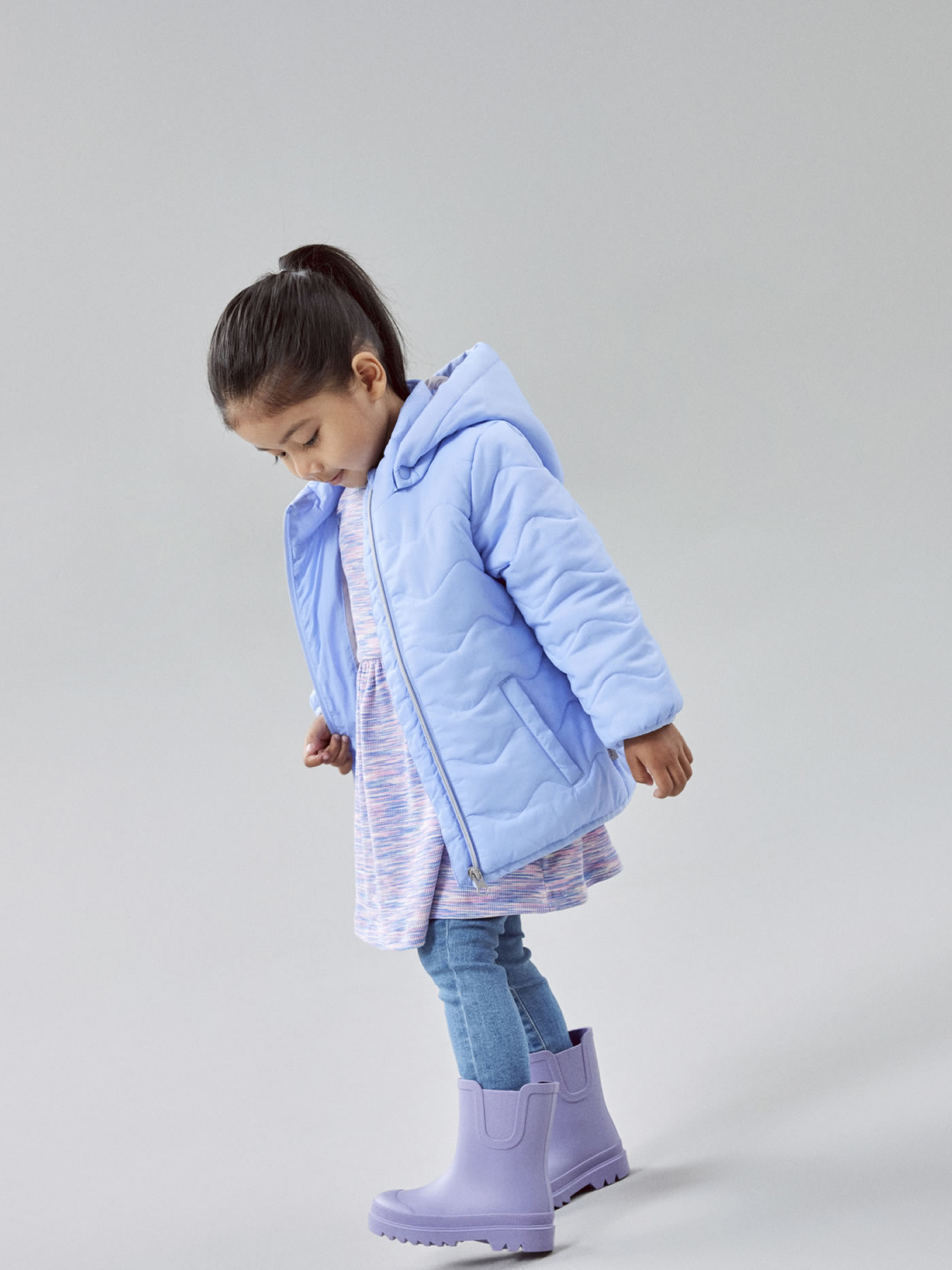 Leichte gesteppte Jacke von NAME IT für Mädchen für die Übergangszeit. Die gesteppte Optik ist ein toller Hingucker und die abknöpfbare Kapuze ein tolles Detail. Zwei Eingrifftaschen bieten Platz für Kleinigkeiten. Die Ärmelbündchen und der Saum sind mit Gummibündchen versehen. Das leichte Gewicht der Jacke sorgt für einen hohen Tragekomfort.