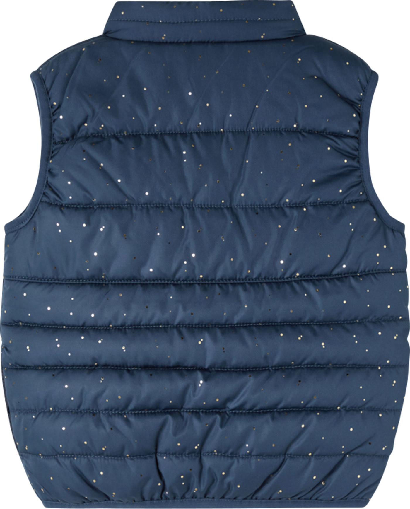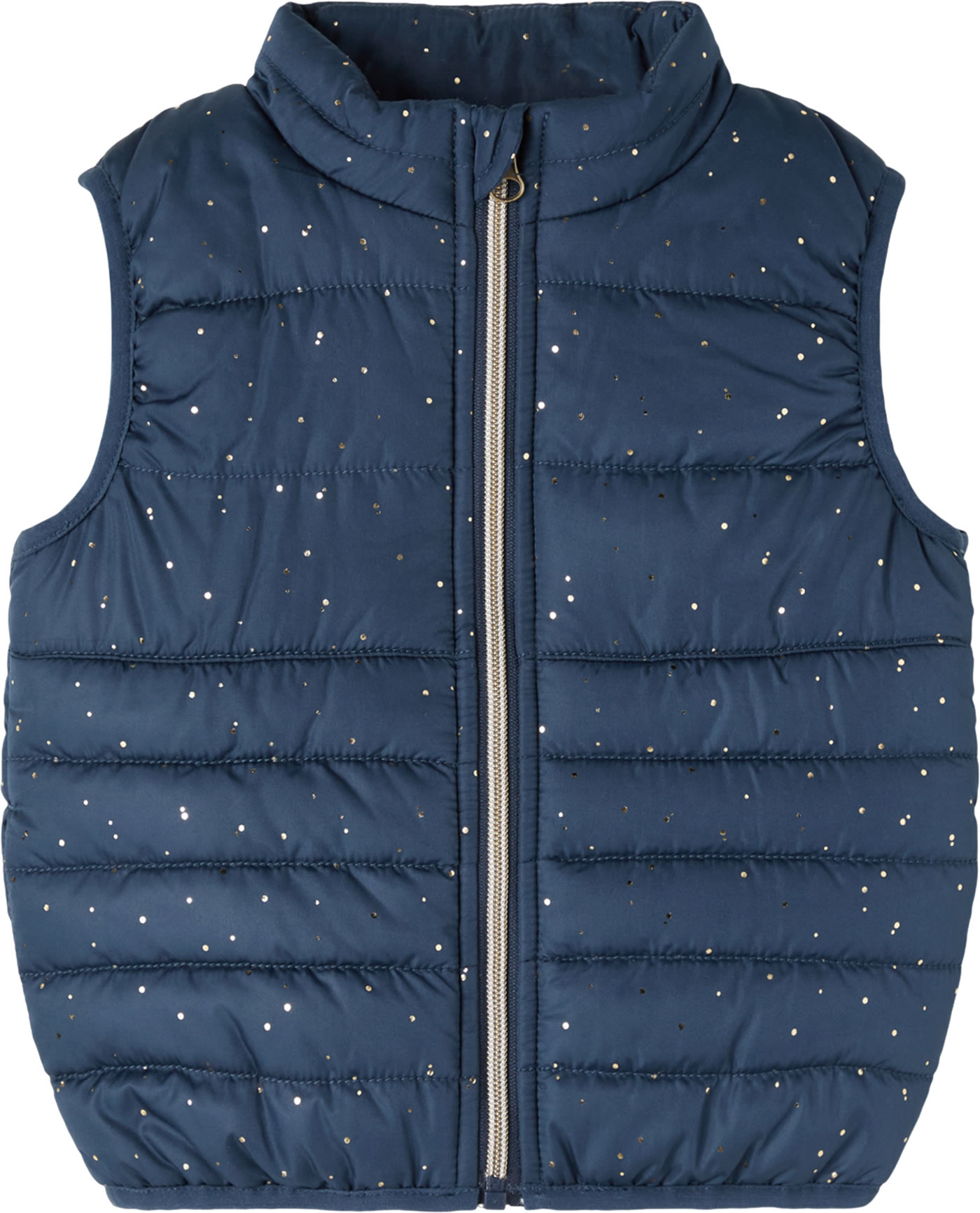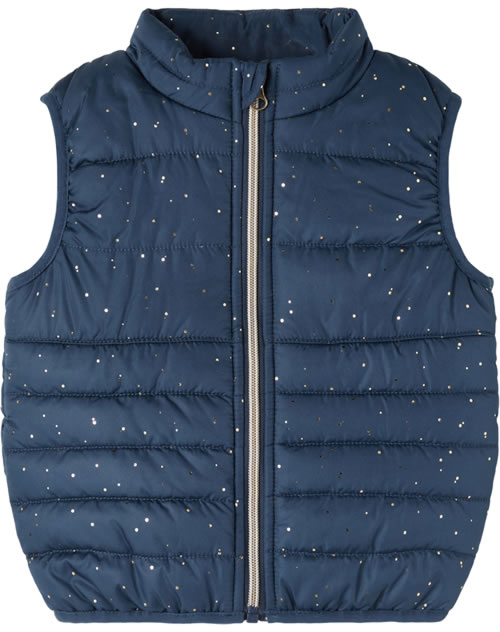 Stepp-Weste mit Stehkragen von NAME IT für Mädchen. Die abgesteppte Weste ist vielseitig kombinierbar: ob zum Drunterziehen an kalten Tagen oder nur über ein Langarmshirt getragen an wärmeren Tagen. Zwei Eingrifftaschen, der farblich abgesetzte Reißverschluss und die vielen verstreuten goldenen Punkte sind schöne Details.