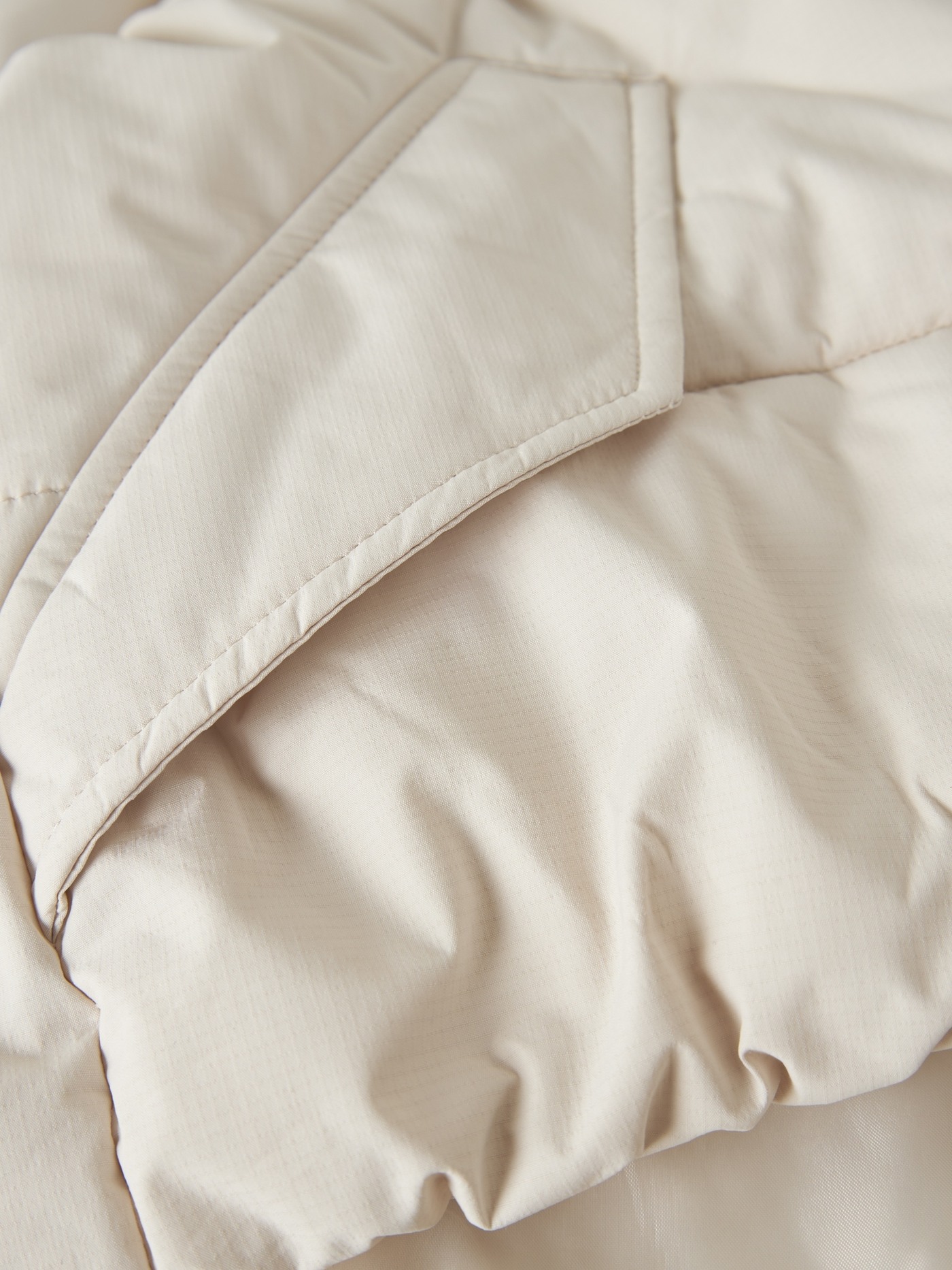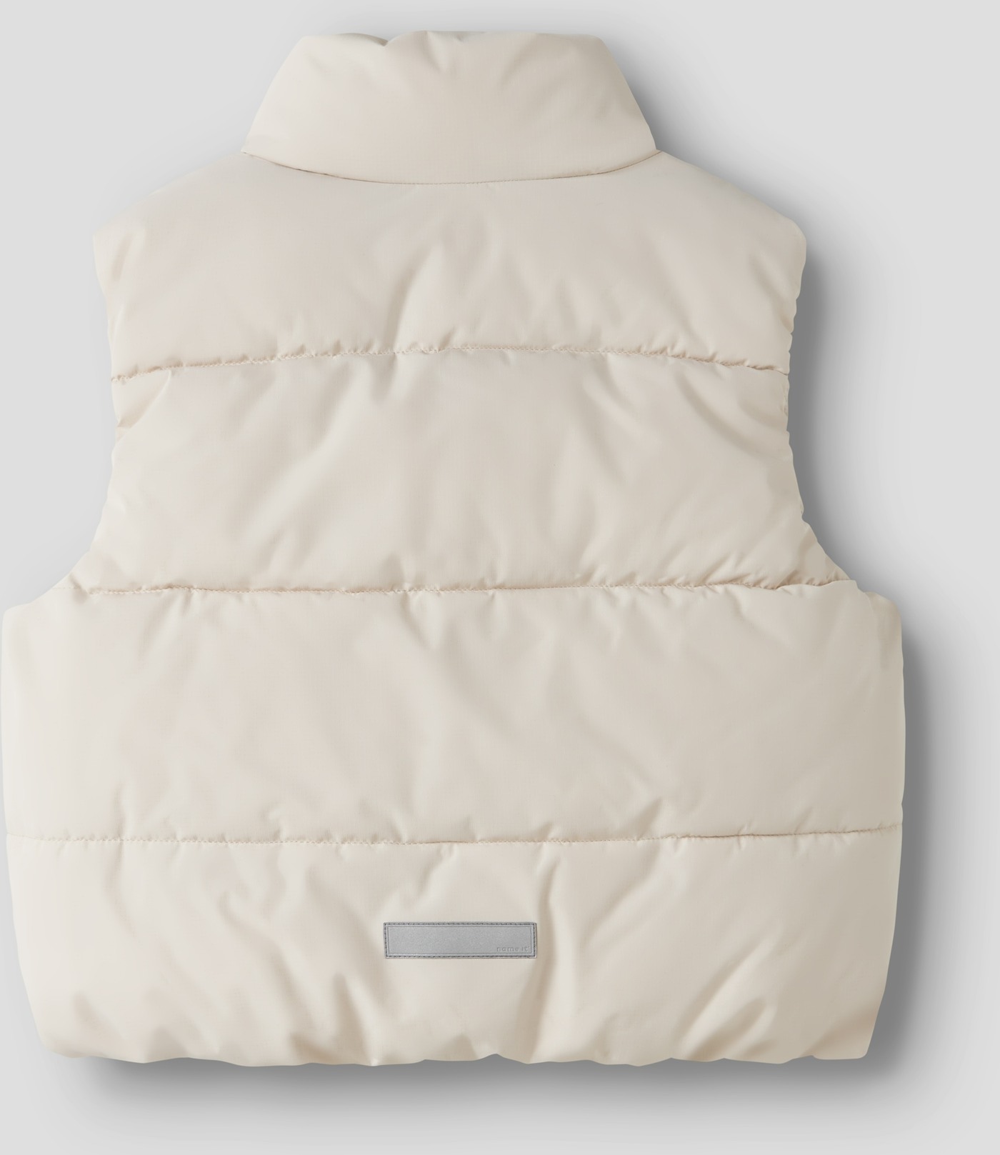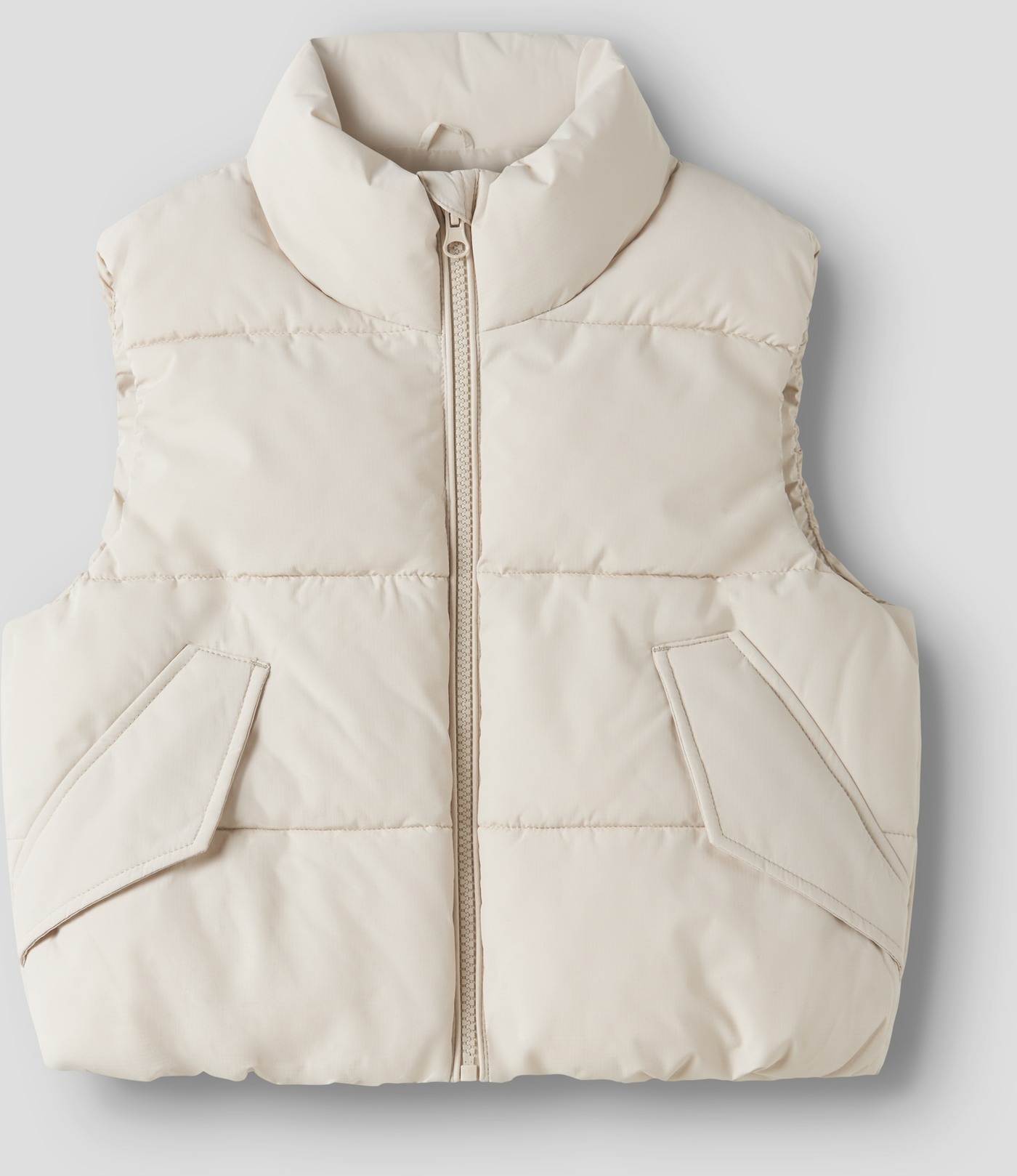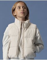 Diese coole Steppweste ist cremefarbend und hat einen Stehkragen, der den Hals vor kühlem Wind schützt. 🍃
