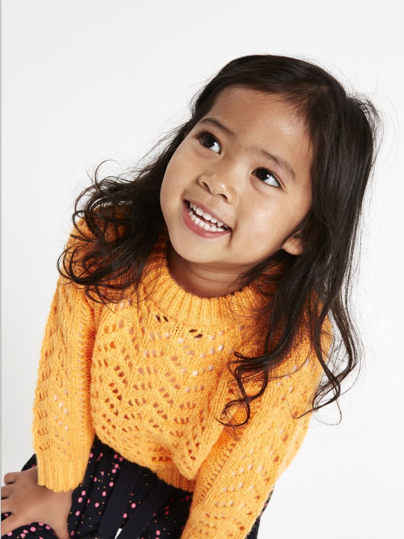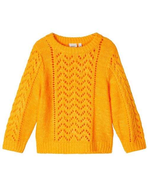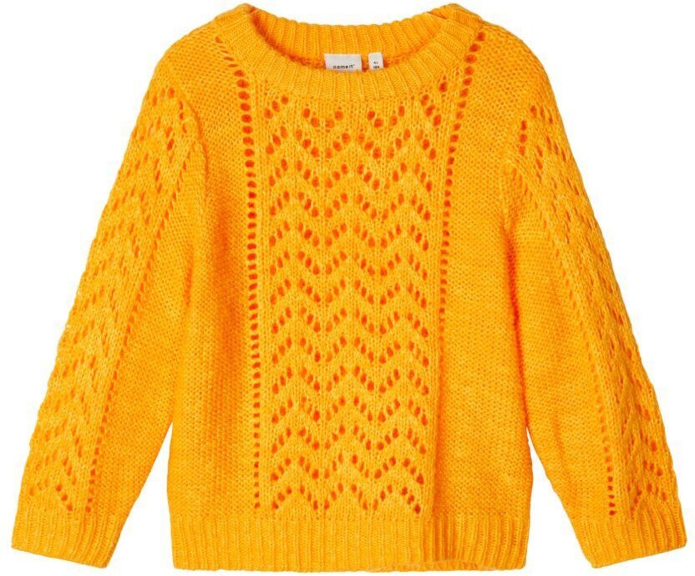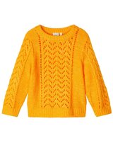 Stylischer Lochstrick-Pullover mit Rund-Ausschnitt für Mädchen von NAME IT. Der Pullover hat eine aufwendige Lochstickerei auf der Vorderseite und an den Ärmeln. Die Farbe setzt einen zusätzlichen Akzent.