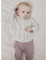 Die Strickjacke ist mit Holzknöpfen versehen und lässt sich so auch offen tragen.