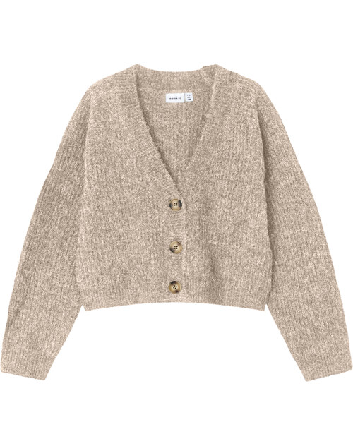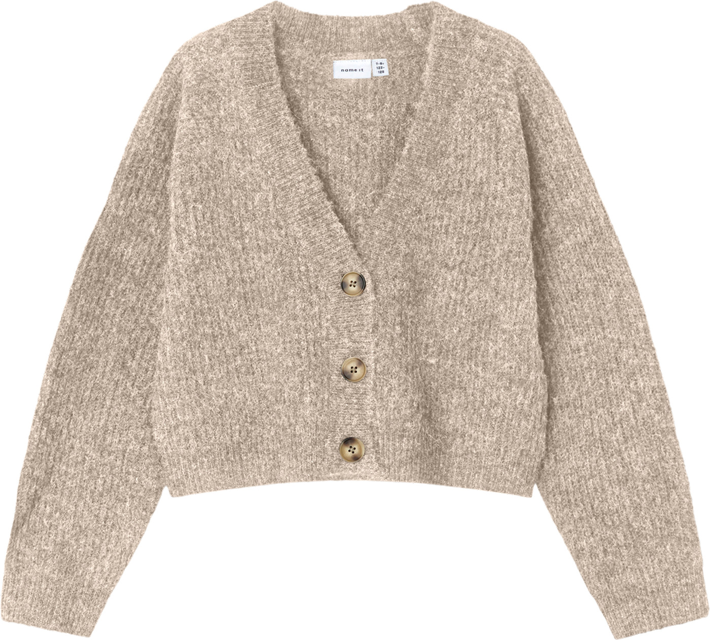 Kurze Strickjacke für Mädchen von NAME IT. Verschlossen wird die Jacke mit drei Knöpfen in Holzoptik. Schöne Details sind die Raglan-Ärmel und das gerippte Strickmuster. Die Strickjacke lässt sich dank des klassischen Schnitts prima kombinieren.