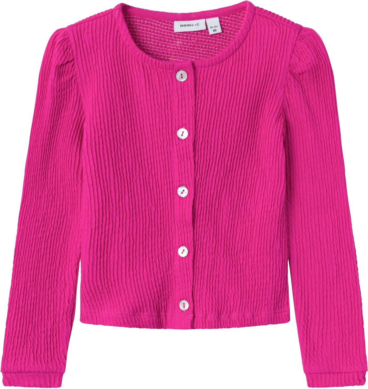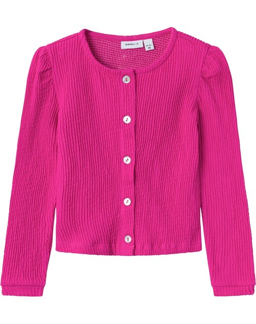 Hübsche Strickjacke in Seesucker-Optik für Mädchen von NAME IT. Verschlossen wird die Strickjacke mit einer Knopfleiste. Die Strickjacke hat einen klassischen Schnitt und läßt sich prima kombinieren. Das weiche leichte Material ist ideal für kühlere Tage.
