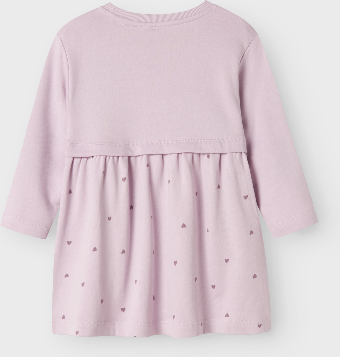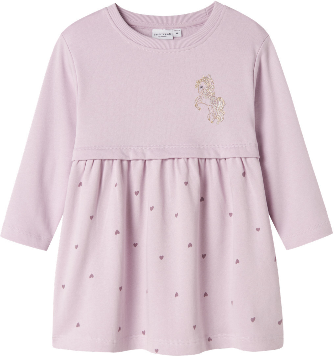 Hübsches langärmliges Sweat-Kleid in rosa für Mädchen von NAME IT. Auf der Brust ist eine süße Glitzer-Einhorn-Applikation und der Rock ist mit lila Herzen im Allover-Druck versehen. Somit wird es sicher schnell zum Lieblingsteil im Kleiderschrank. Das Kleid ist innen weich angeraut und somit ideal für den Übergang. Es lässt sich prima mit Leggings oder Strumpfhose kombinieren. Das angenehme Material bietet einen hohen Tragekomfort.