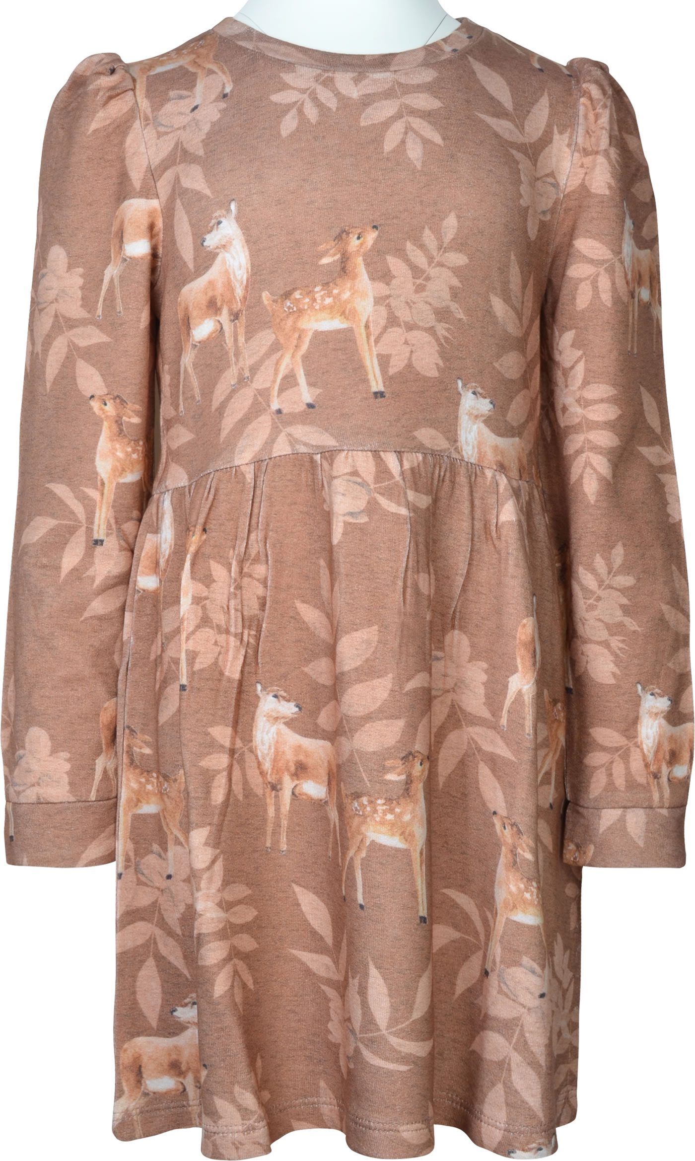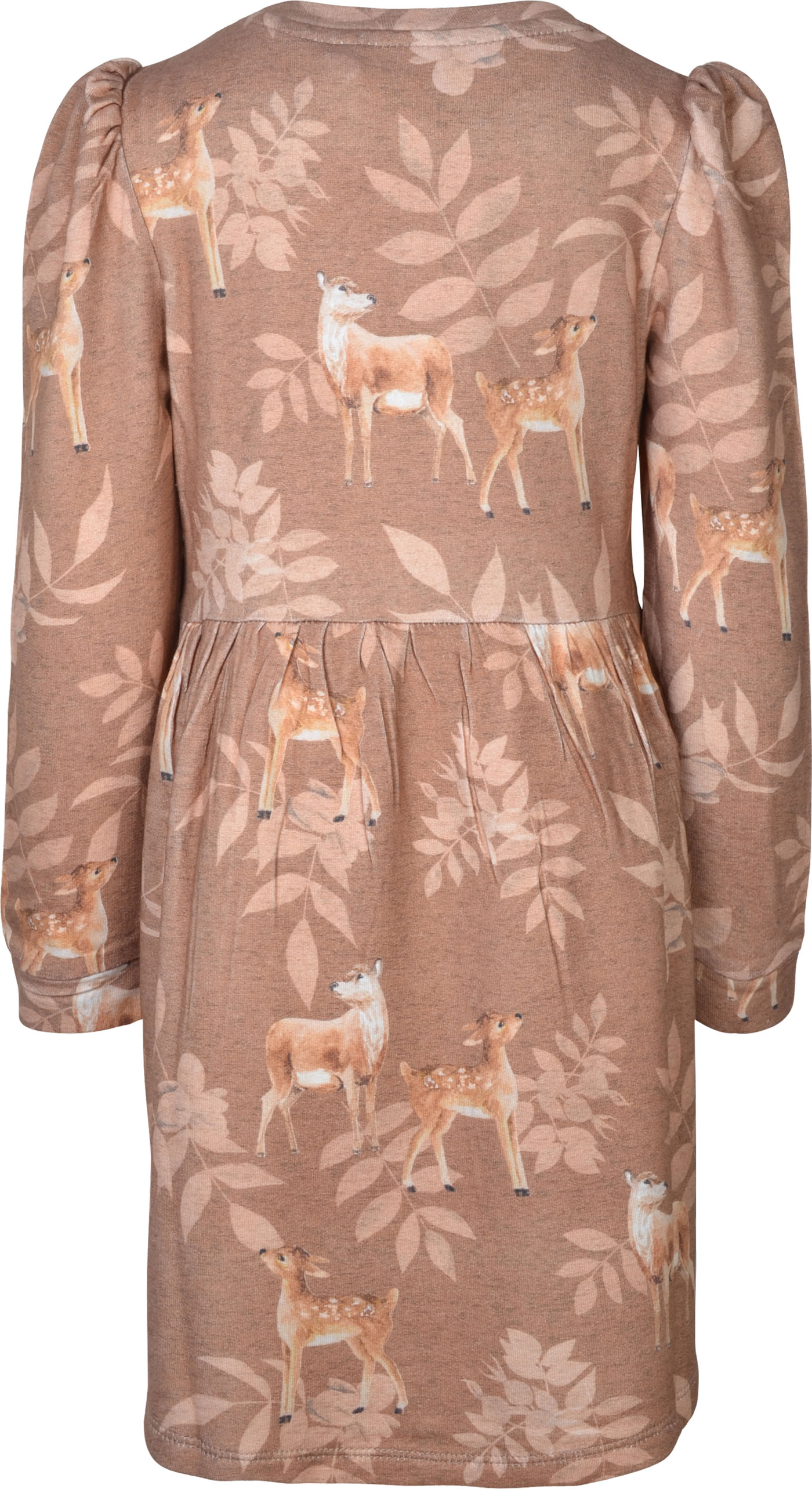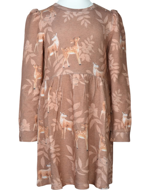 Leichtes Sweat Kleid mit langen Ärmeln von NAME IT. Innen ist der Sweatstoff kuschelig weich und bietet dadurch einen hohen Tragekomfort. Besonders hübsch sind die leicht gerafften Ärmel und das Muster mit Rehen und Blättern, welches das komplette Kleid bedeckt. Das Bündchen an der Taille sorgt für guten Sitz. Das Kleid lässt sich prima mit einer Leggings oder Jeans kombinieren.