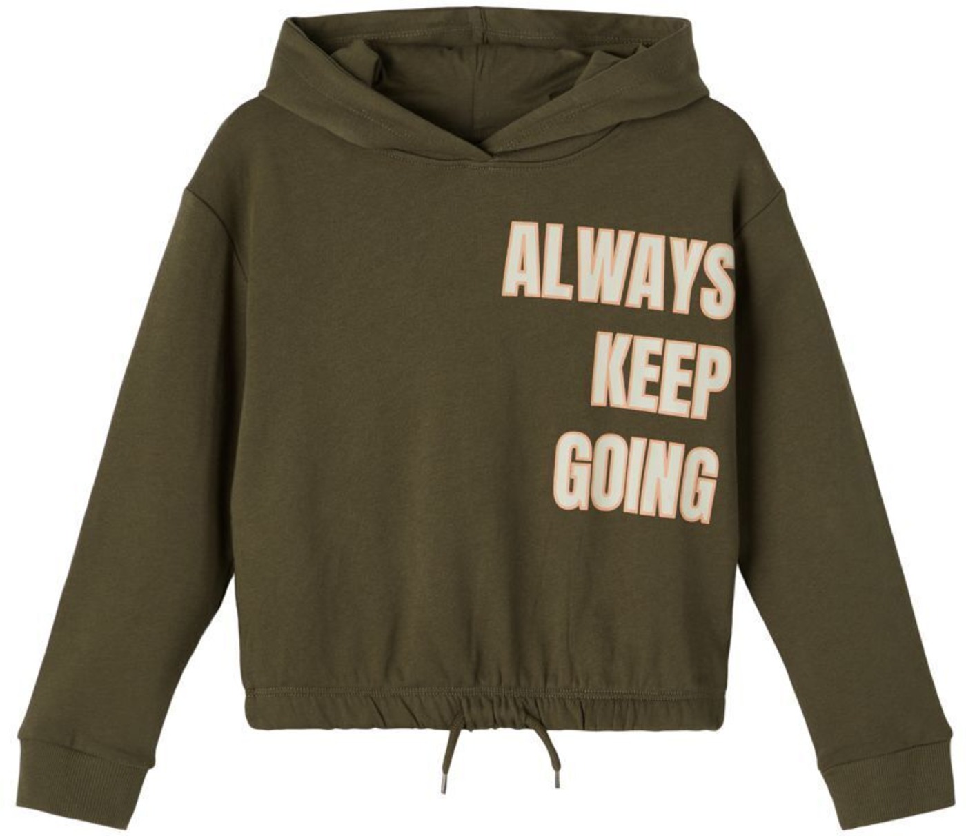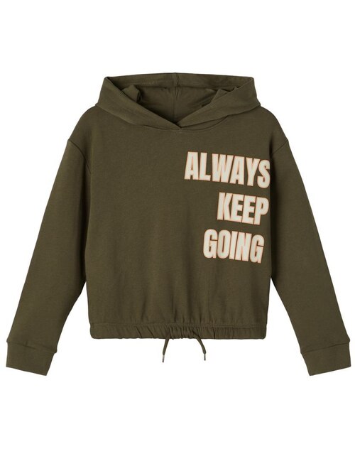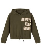 Sweatshirt mit Kapuze von NAME IT für Mädchen. Das Sweatshirt ist kurzgeschnitten und verfügt über ein Gummibündchen im Saum. Die Kapuze ist mit weichem Baumwoll-Jersey gefüttert. Ein tolles Detail ist der Schriftzug-Print.